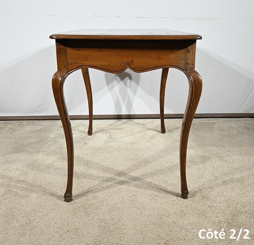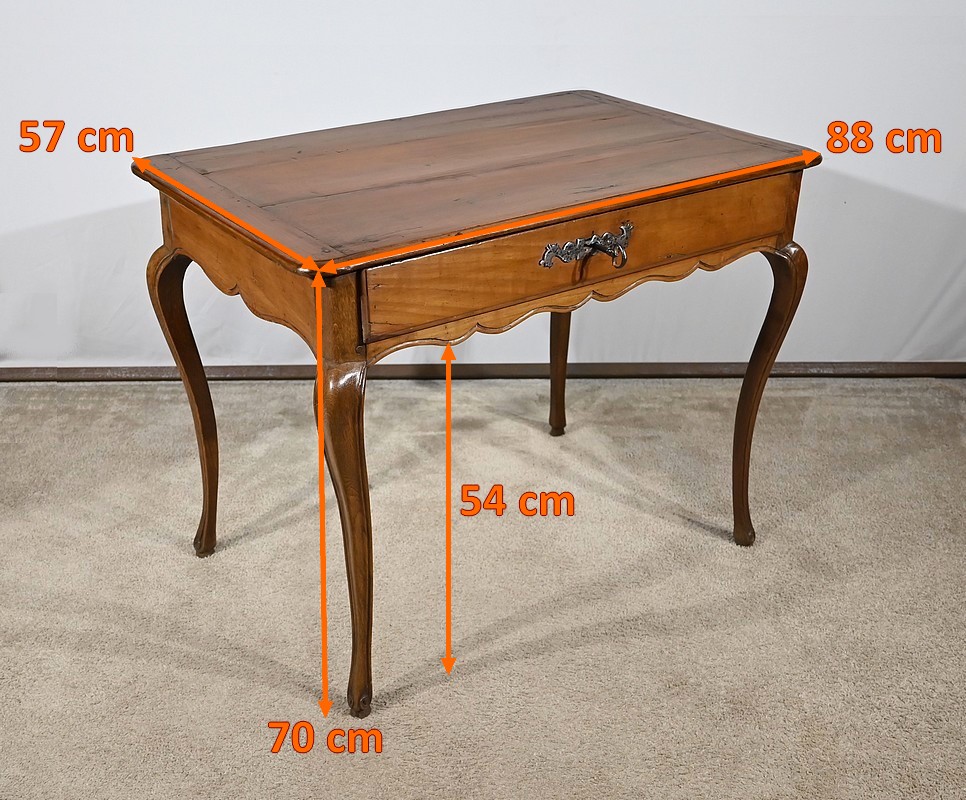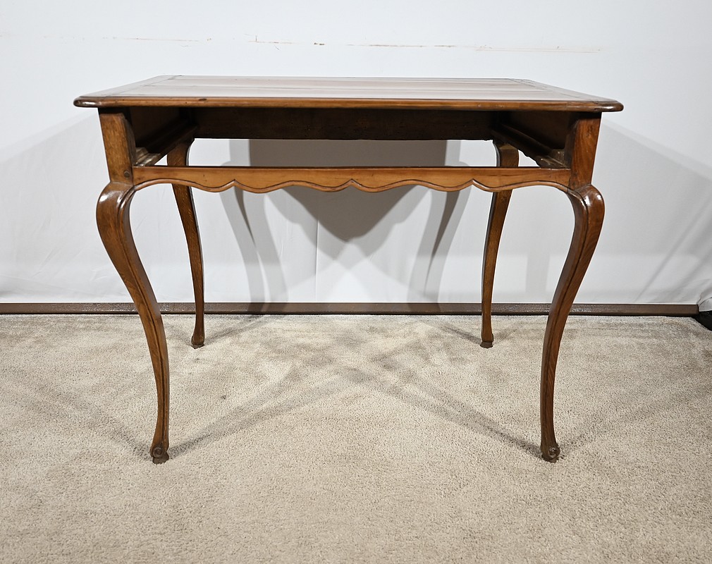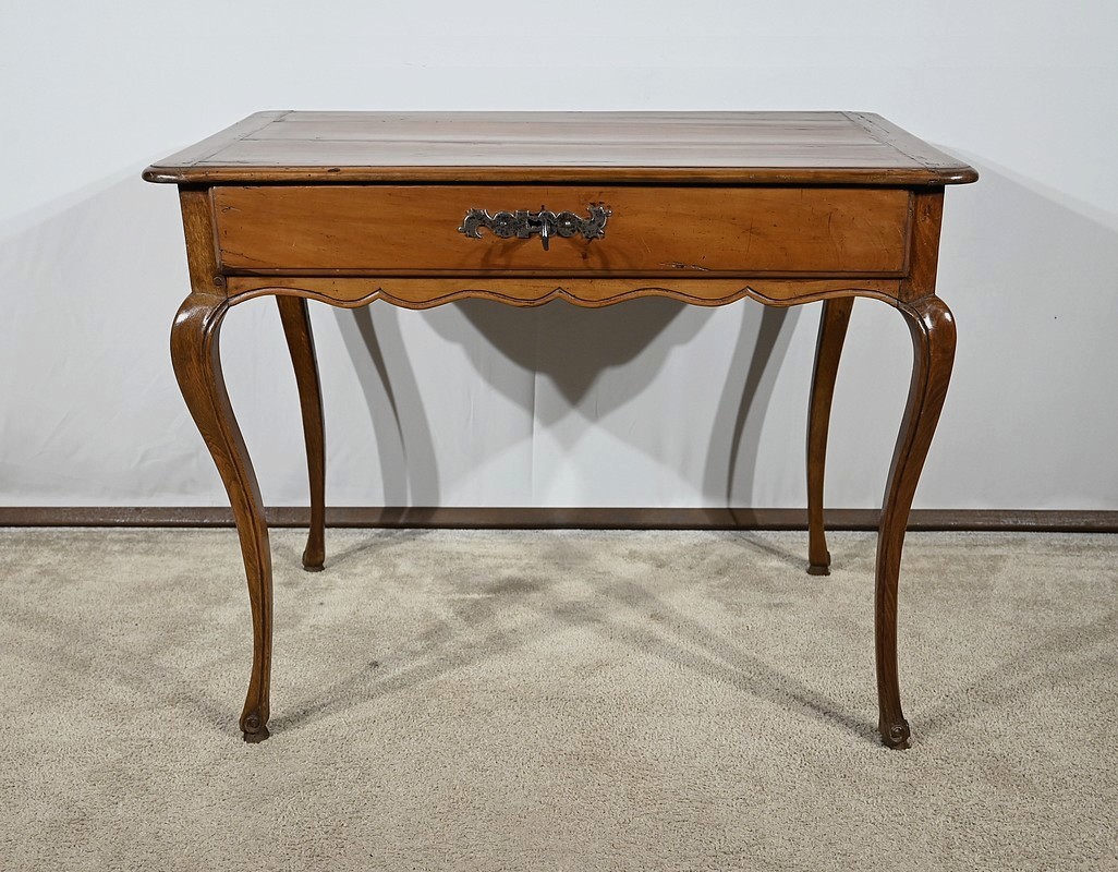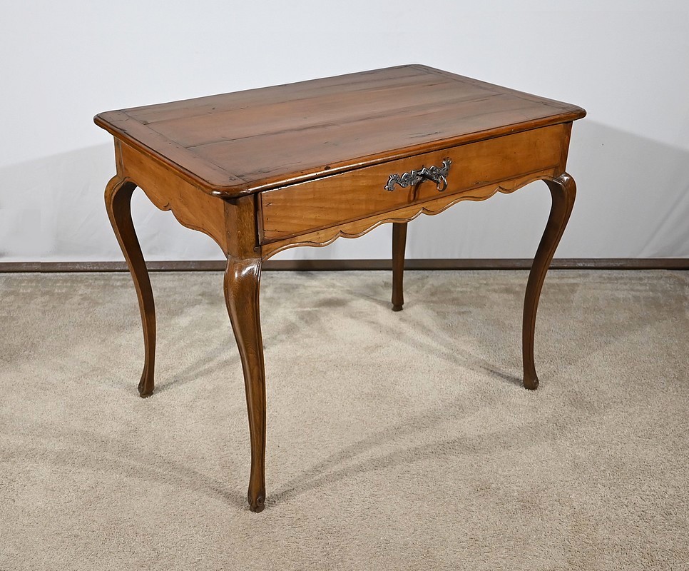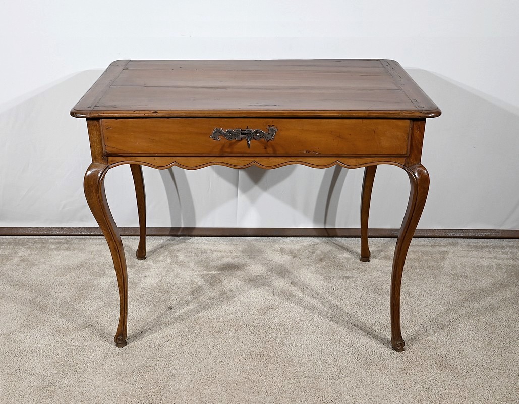Table Cabaret Louis XV en merisier et pieds en chêne, ouvrant en ceinture par un tiroir en applique, mouluré sur les côtés et le dessous. La serrure et la clé sont d’origine et en état de fonctionnement. L’entrée est en fer, posée à l’horizontal . La ceinture sous le tiroir est découpée avec une légère moulure en dessous qui se profile avec des pieds cambrés dits à bosse. Ils sont moulurés et se terminent par des volutes en partie basse. Ce meuble est muni de côtés à découpe en forme de cœur avec des moulures également. Le dessus de cette table cabaret est composé de trois planches bien jointives et une partie « embout » aux extrémités, permet d’éviter la déformation des trois planches. Le pourtour est en bec de corbin. Ce meuble est totalement chevillé avec petites chevilles anciennes témoignant de son grand âge.