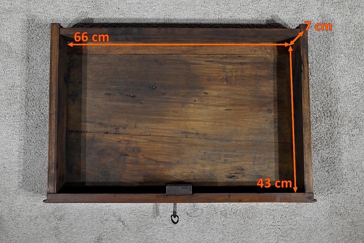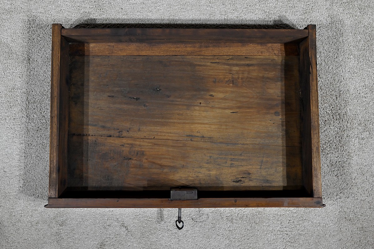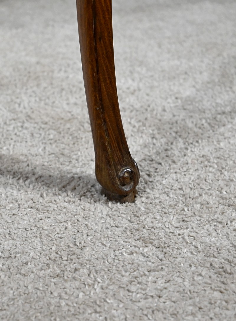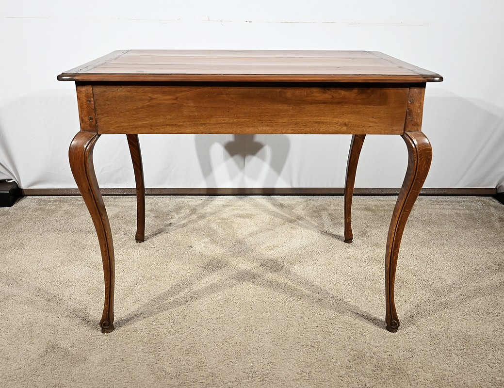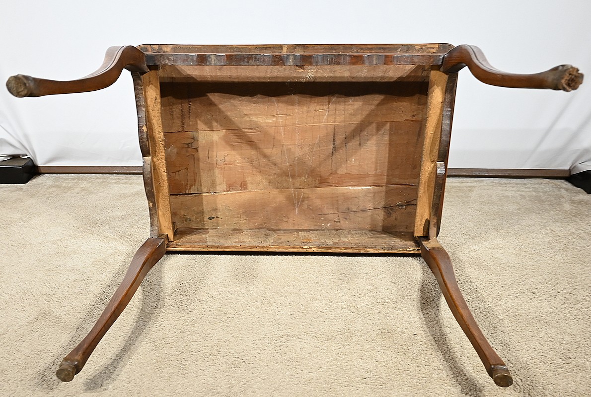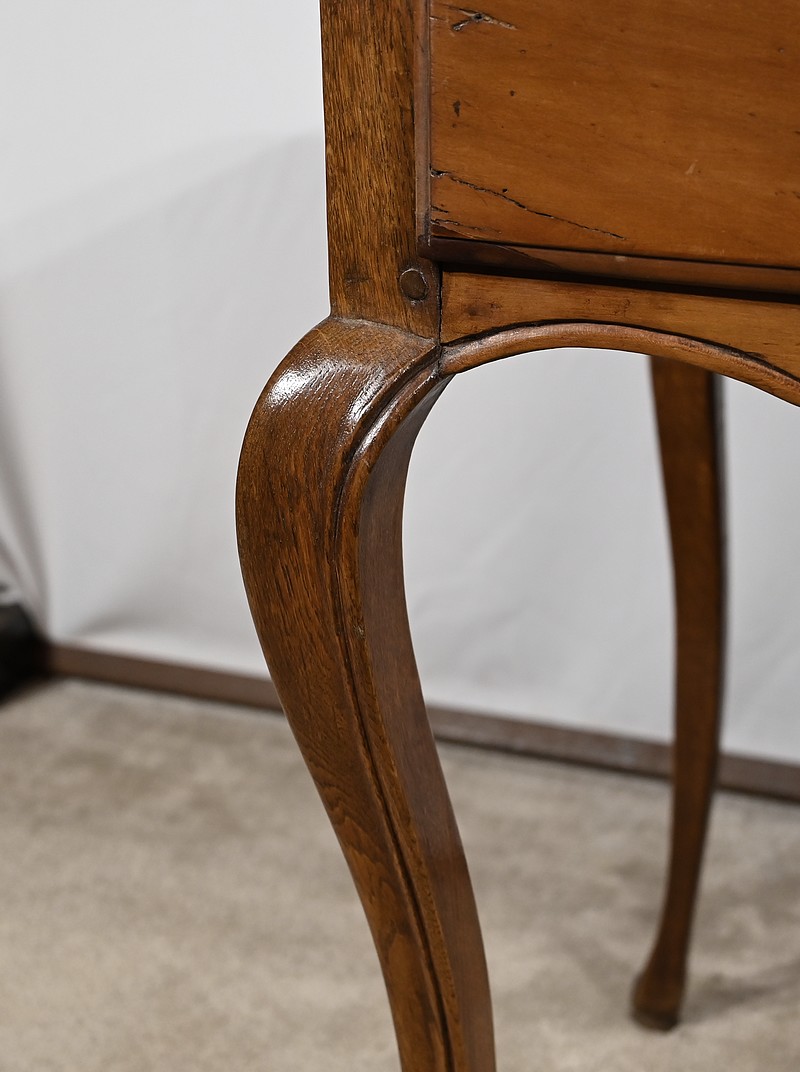 Table Cabaret Louis XV en merisier et pieds en chêne, ouvrant en ceinture par un tiroir en applique, mouluré sur les côtés et le dessous. La serrure et la clé sont d’origine et en état de fonctionnement. L’entrée est en fer, posée à l’horizontal . La ceinture sous le tiroir est découpée avec une légère moulure en dessous qui se profile avec des pieds cambrés dits à bosse. Ils sont moulurés et se terminent par des volutes en partie basse. Ce meuble est muni de côtés à découpe en forme de cœur avec des moulures également. Le dessus de cette table cabaret est composé de trois planches bien jointives et une partie « embout » aux extrémités, permet d’éviter la déformation des trois planches. Le pourtour est en bec de corbin. Ce meuble est totalement chevillé avec petites chevilles anciennes témoignant de son grand âge.