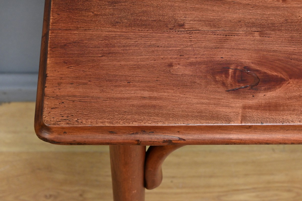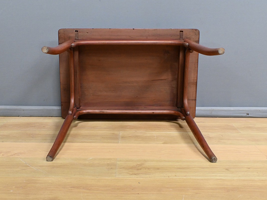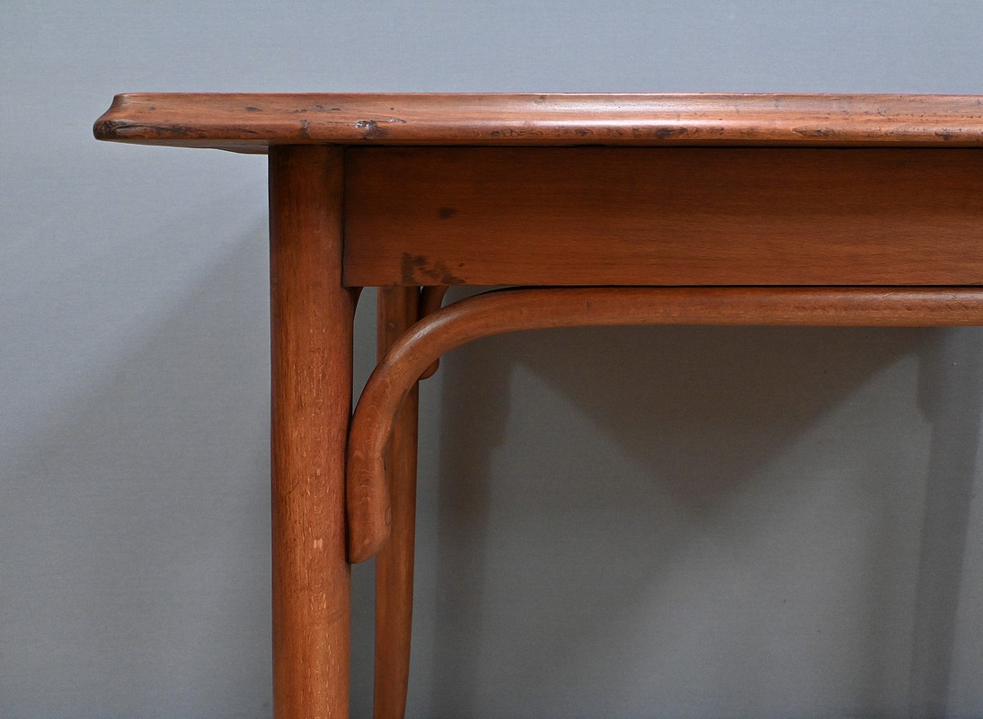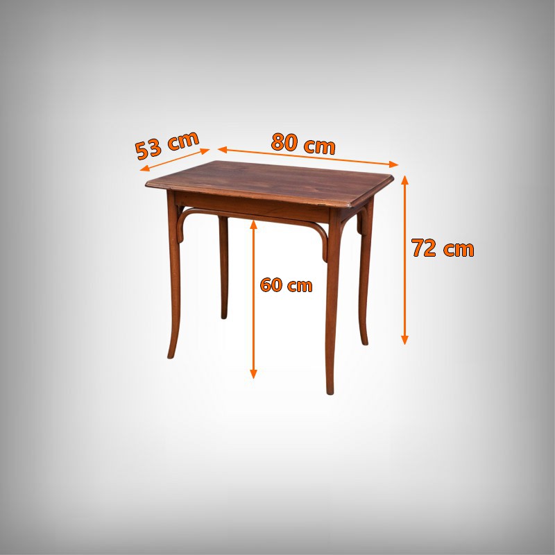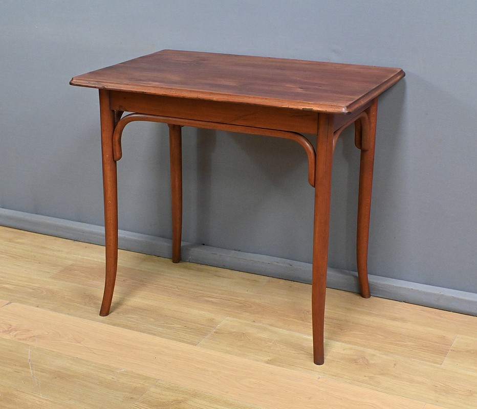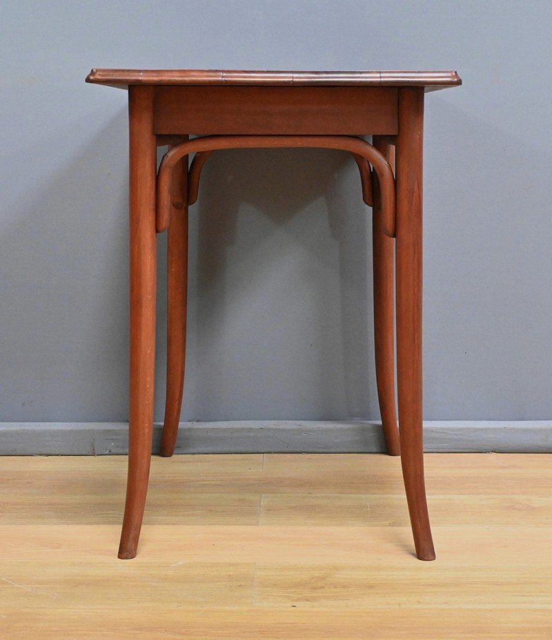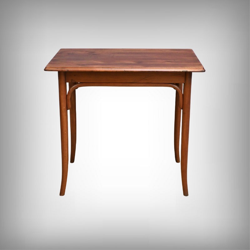 Élégante table d’appoint réalisée par la Maison Fischel à la fin du XIXe siècle, dans le pur esprit des créations de Thonet. Entièrement façonnée en hêtre courbé à la vapeur, elle présente un plateau rectangulaire aux arêtes adoucies, reposant sur quatre pieds élancés et légèrement galbés. De gracieux renforts cintrés relient les pieds au plateau, apportant à la fois stabilité et raffinement visuel. La finition brun chaud met en valeur le veinage naturel du bois, soulignant le travail artisanal caractéristique de la maison Fischel, réputée pour la qualité de ses assemblages et la finesse de ses courbes. Pièce polyvalente, elle s’intègre aussi bien dans un intérieur Belle Époque que dans une décoration contemporaine, apportant une touche d’authenticité et de charme intemporel.