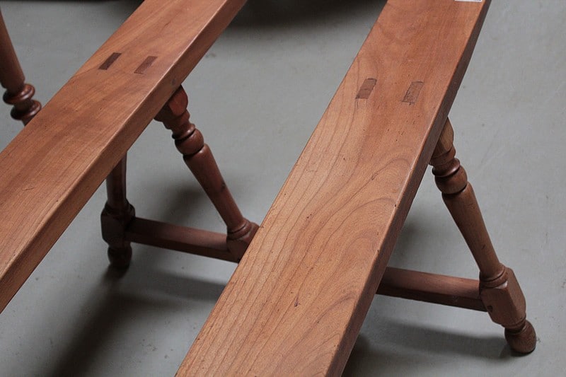 Parfait état après restauration, décapage et patine cirée dans notre atelier. On propose une paire de bancs qui peut convenir autour de cette table.