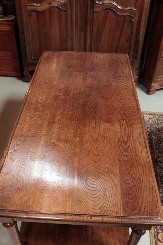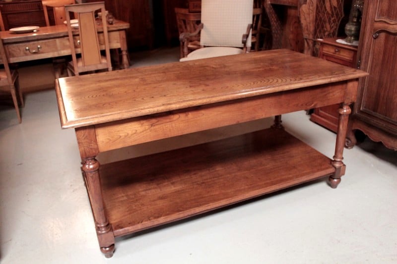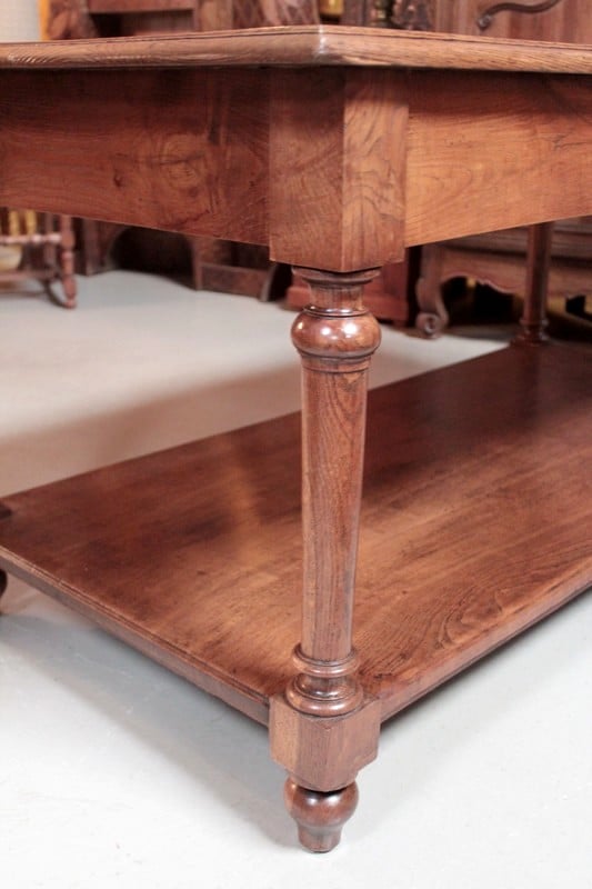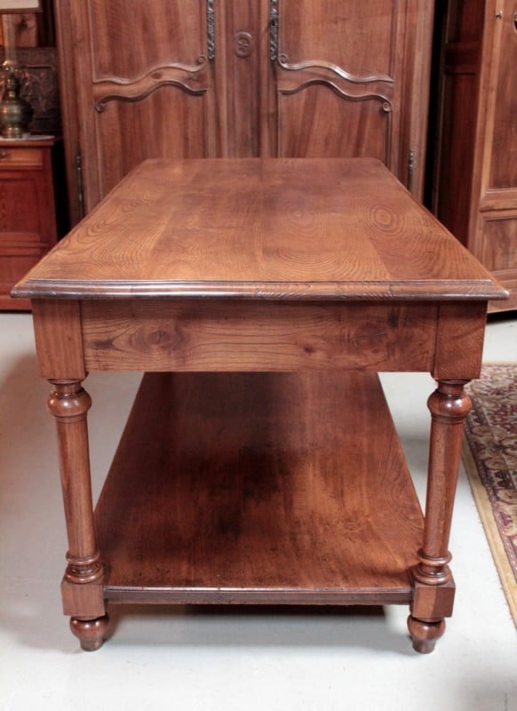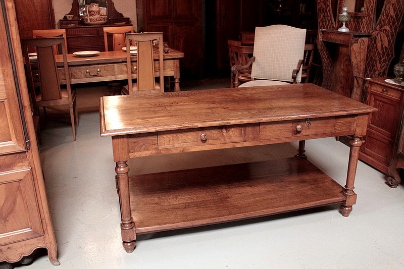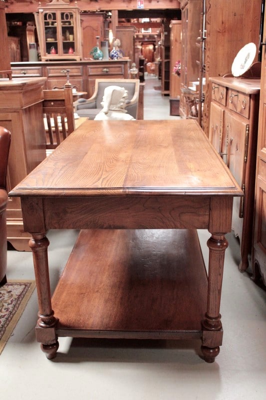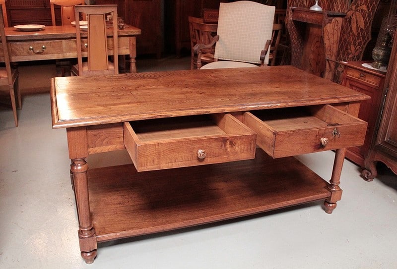 Table de drapier en chêne à double plateau, ouvrant par 2 tiroirs et reposant sur 4 pieds ronds tournés. Sa hauteur sous le bandeau est de 60cm.