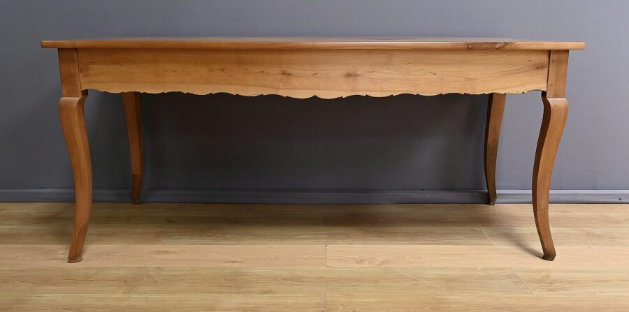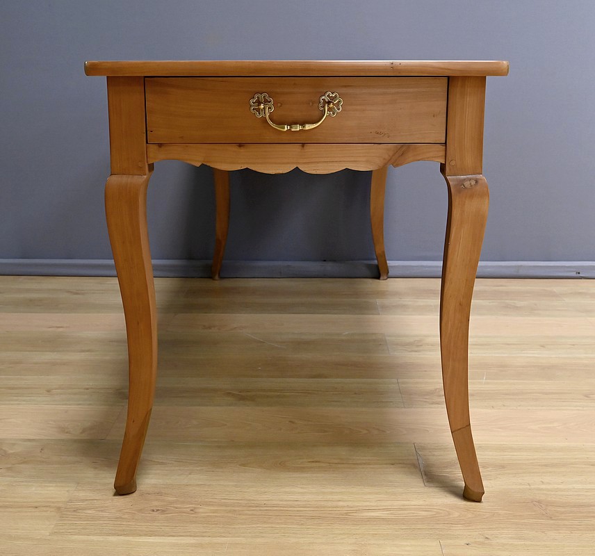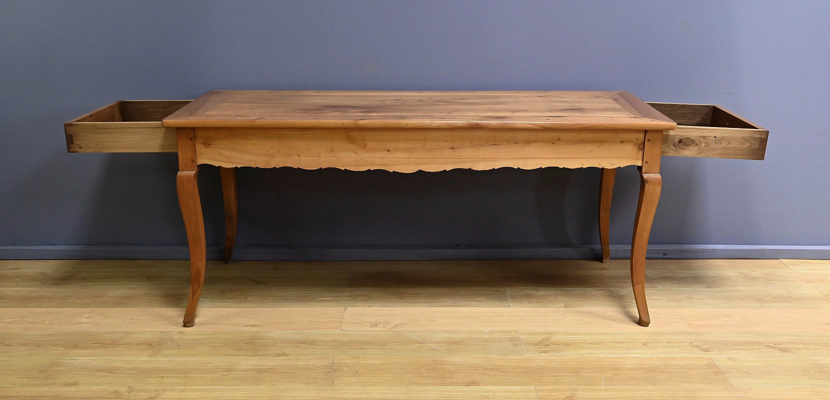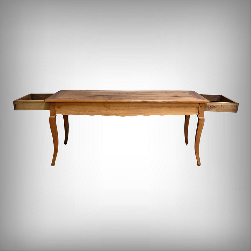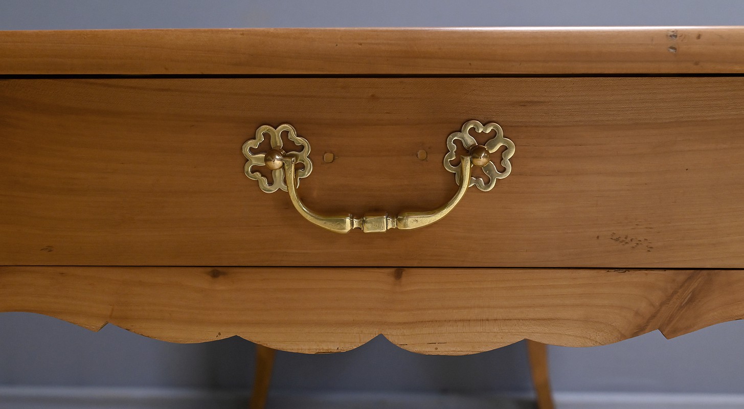 Table régionale en merisier blond massif, d’inspiration Louis XV, alliant élégance classique et artisanat authentique. Chaque extrémité est dotée d’un tiroir profond, souligné d’une poignée tombante en laiton finement ciselé, témoignant du soin apporté aux détails.