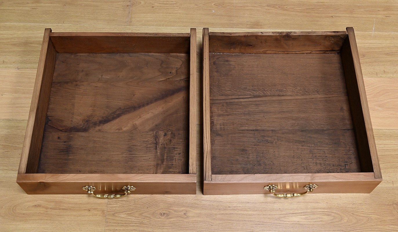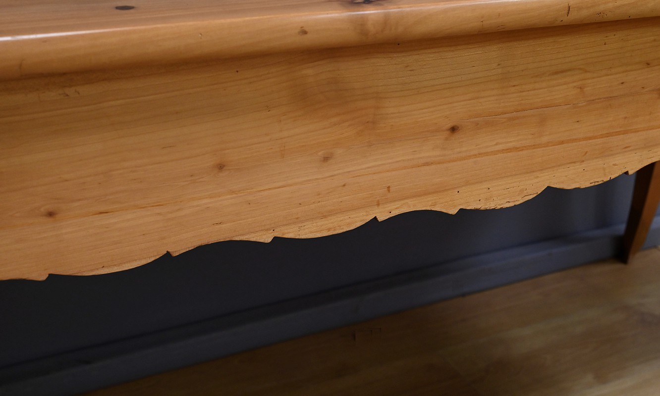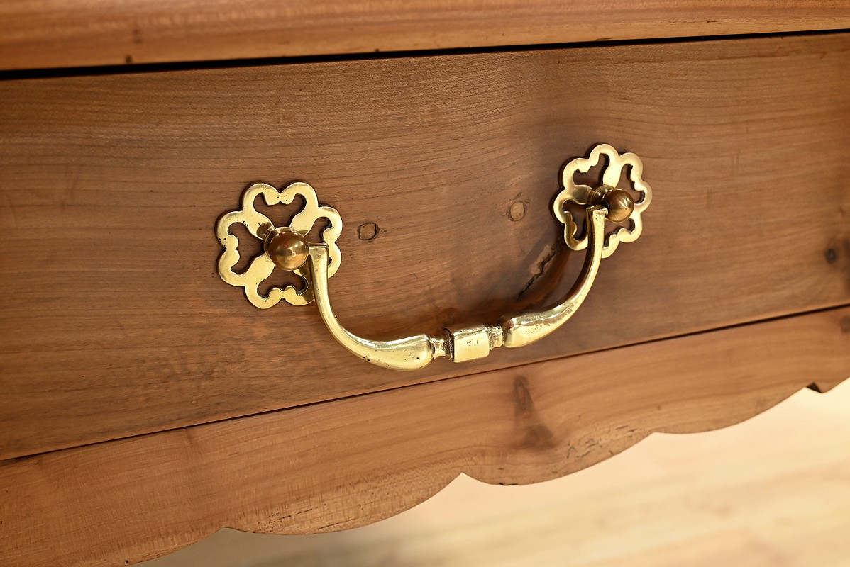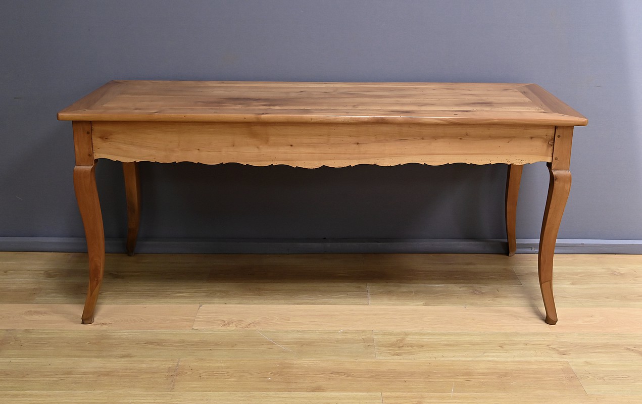 Table régionale en merisier blond massif, d’inspiration Louis XV, alliant élégance classique et artisanat authentique. Chaque extrémité est dotée d’un tiroir profond, souligné d’une poignée tombante en laiton finement ciselé, témoignant du soin apporté aux détails.