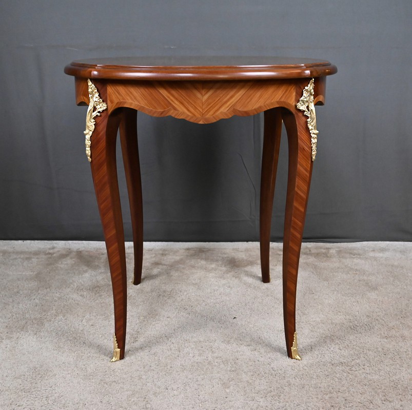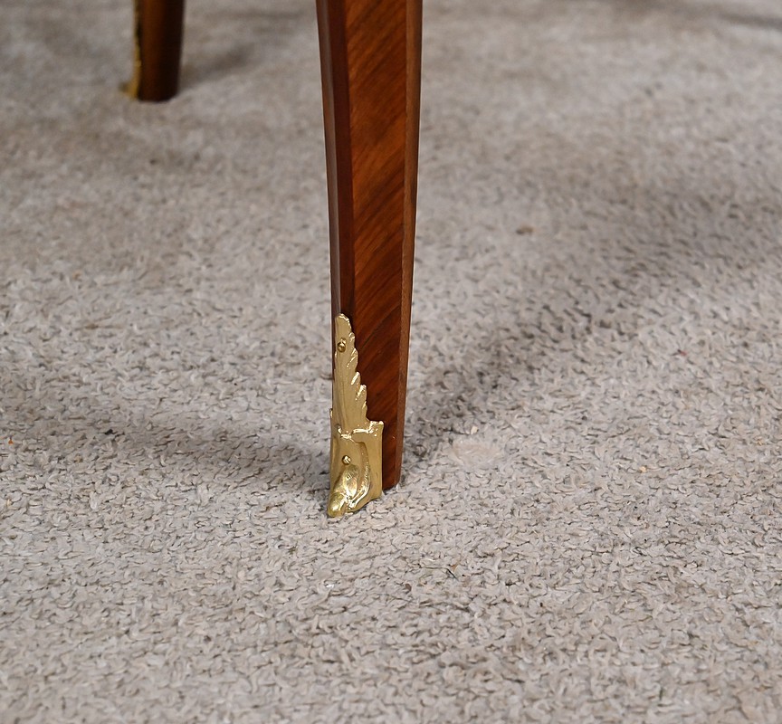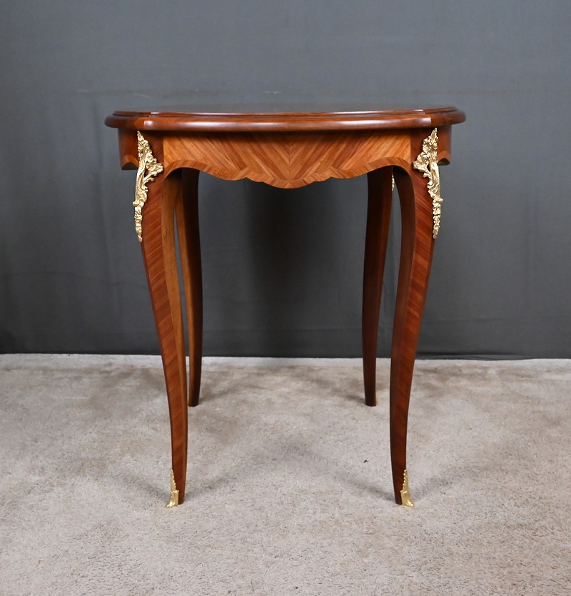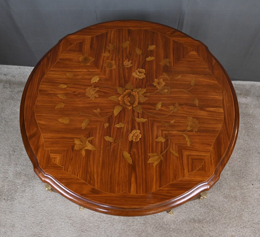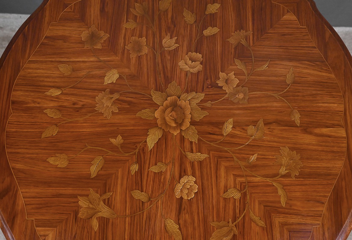 Cette table de salon de style Louis XV séduit par l’élégance de son dessus marqueté, orné d’un délicat décor fleuri mêlant bois clair et bois teinté, harmonieusement disposés sur un fond en placage de bois de rose. Le plateau, souligné d’un quart‑de‑rond inversé, affirme la finesse de son dessin et la qualité de son exécution.