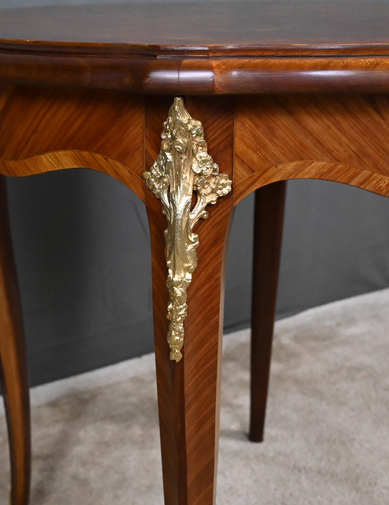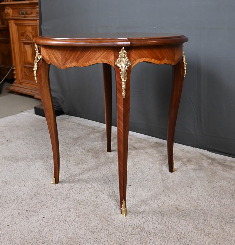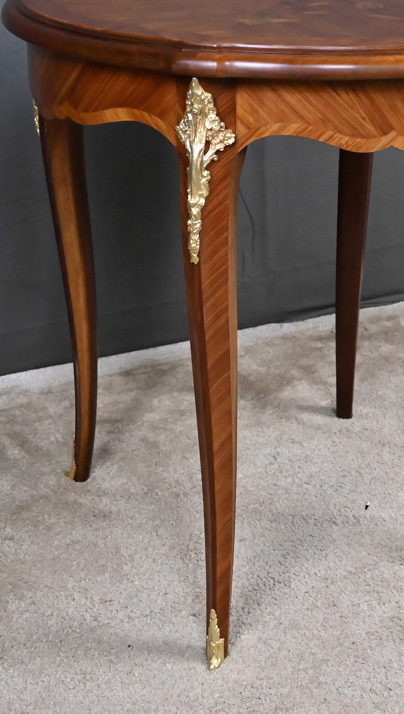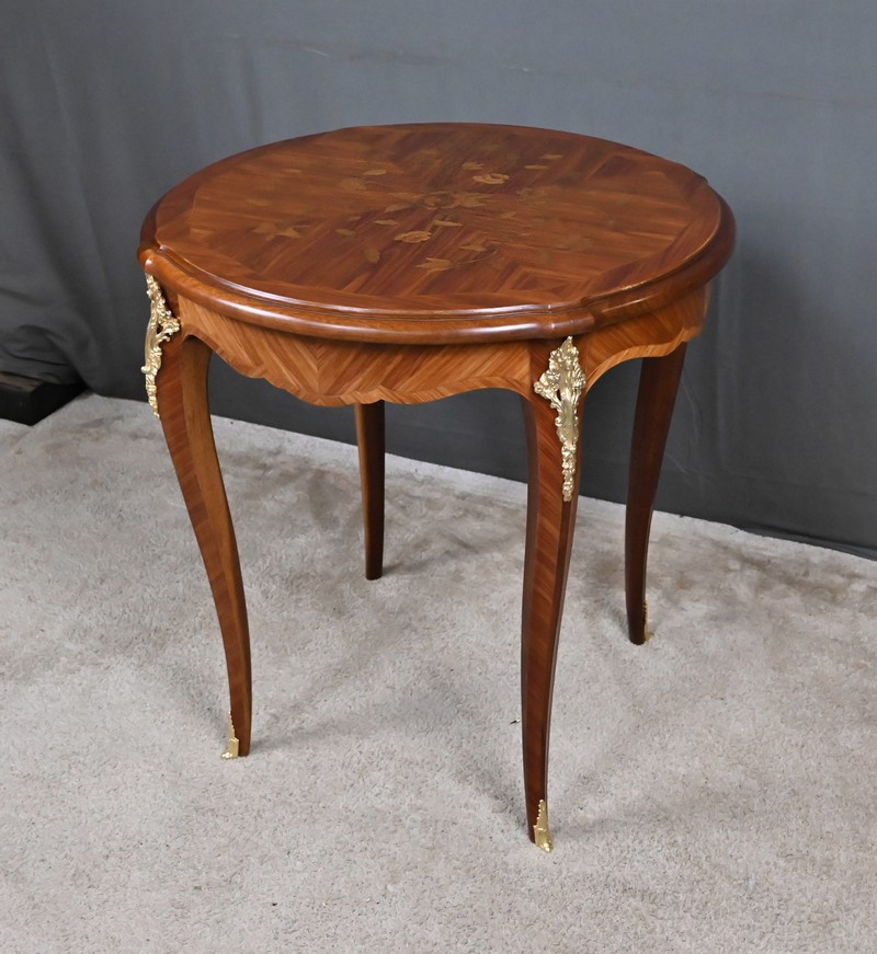 Cette table de salon de style Louis XV séduit par l’élégance de son dessus marqueté, orné d’un délicat décor fleuri mêlant bois clair et bois teinté, harmonieusement disposés sur un fond en placage de bois de rose. Le plateau, souligné d’un quart‑de‑rond inversé, affirme la finesse de son dessin et la qualité de son exécution.