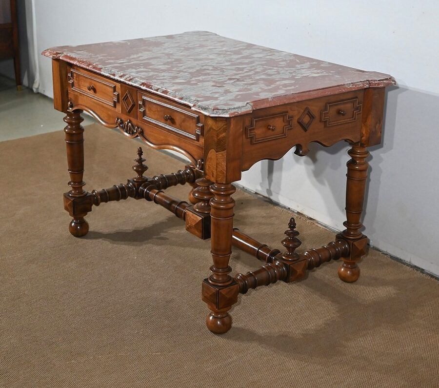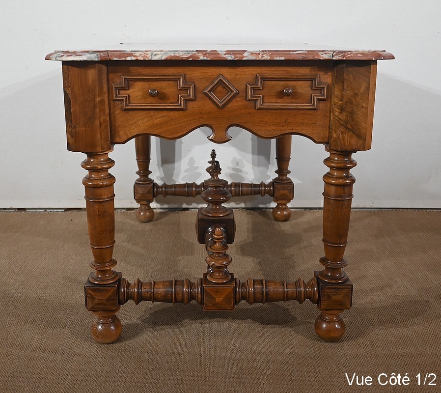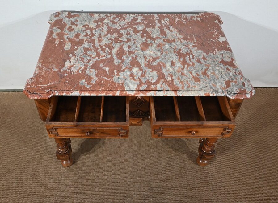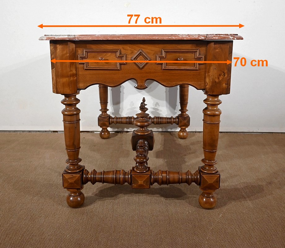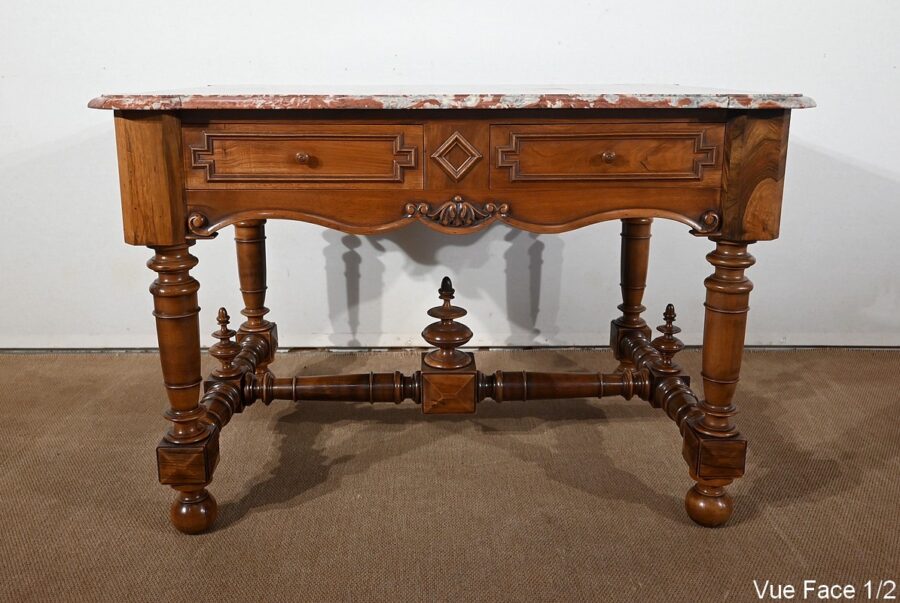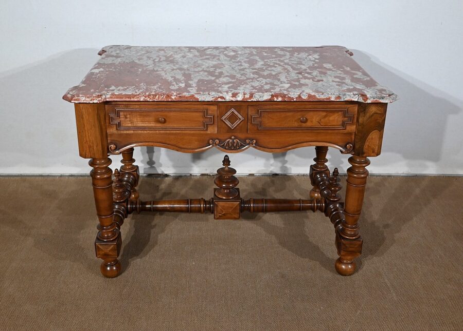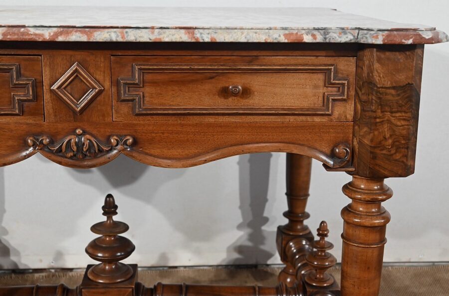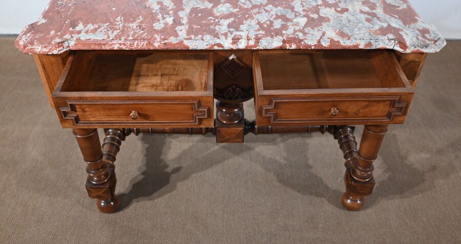 Cette rare table de goût Louis XIII vous séduira par son marbre prestigieux, ses quatre tiroirs originaux et son petit dimensionnel.