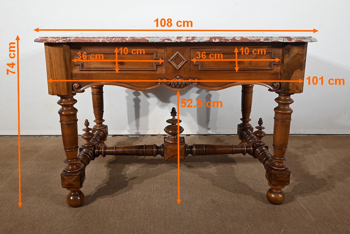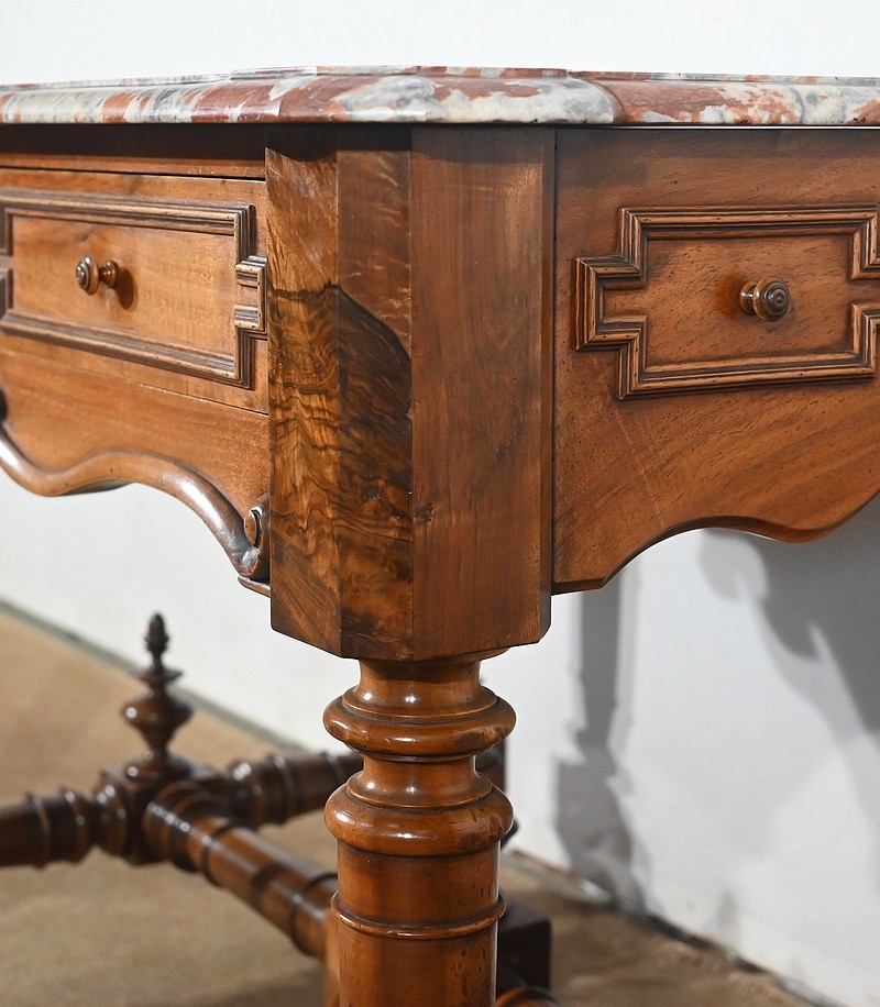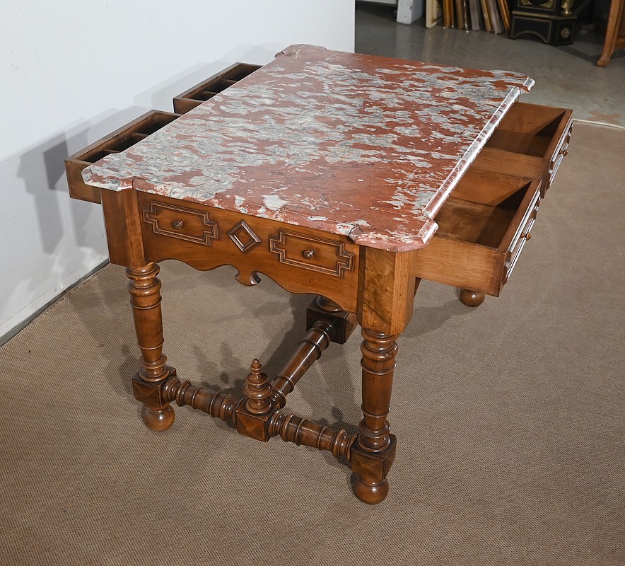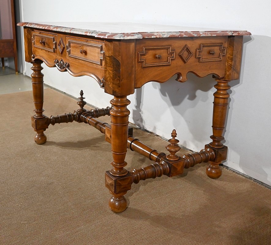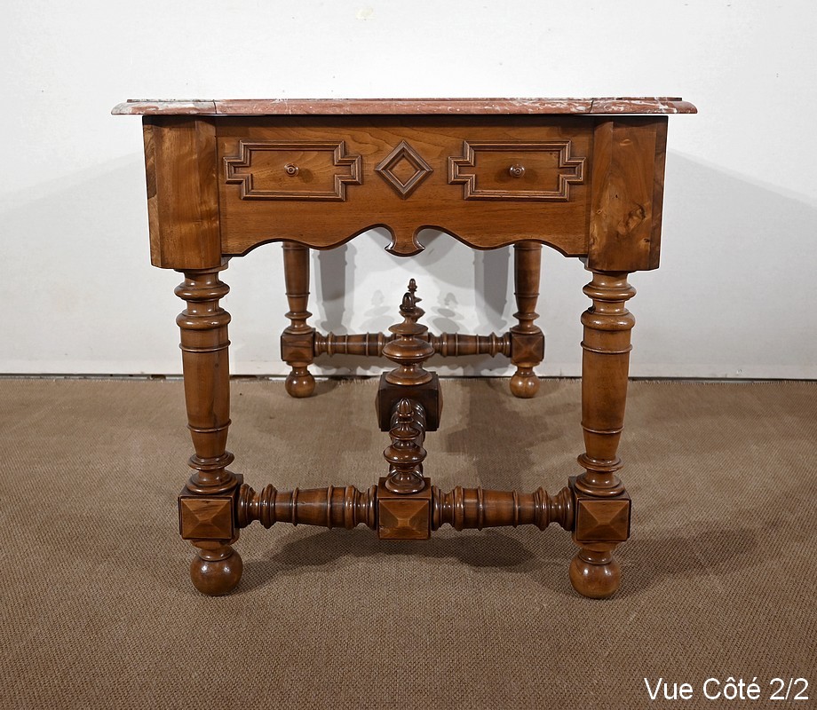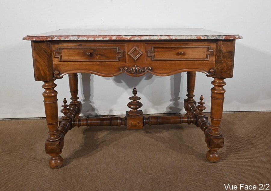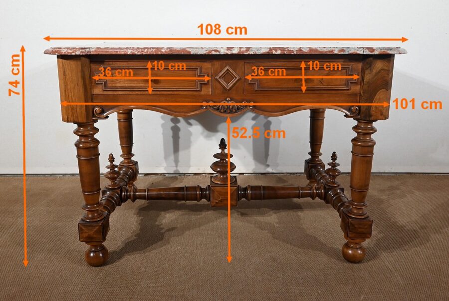 Cette rare table de goût Louis XIII vous séduira par son marbre prestigieux, ses quatre tiroirs originaux et son petit dimensionnel.