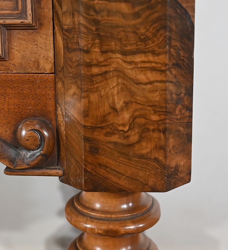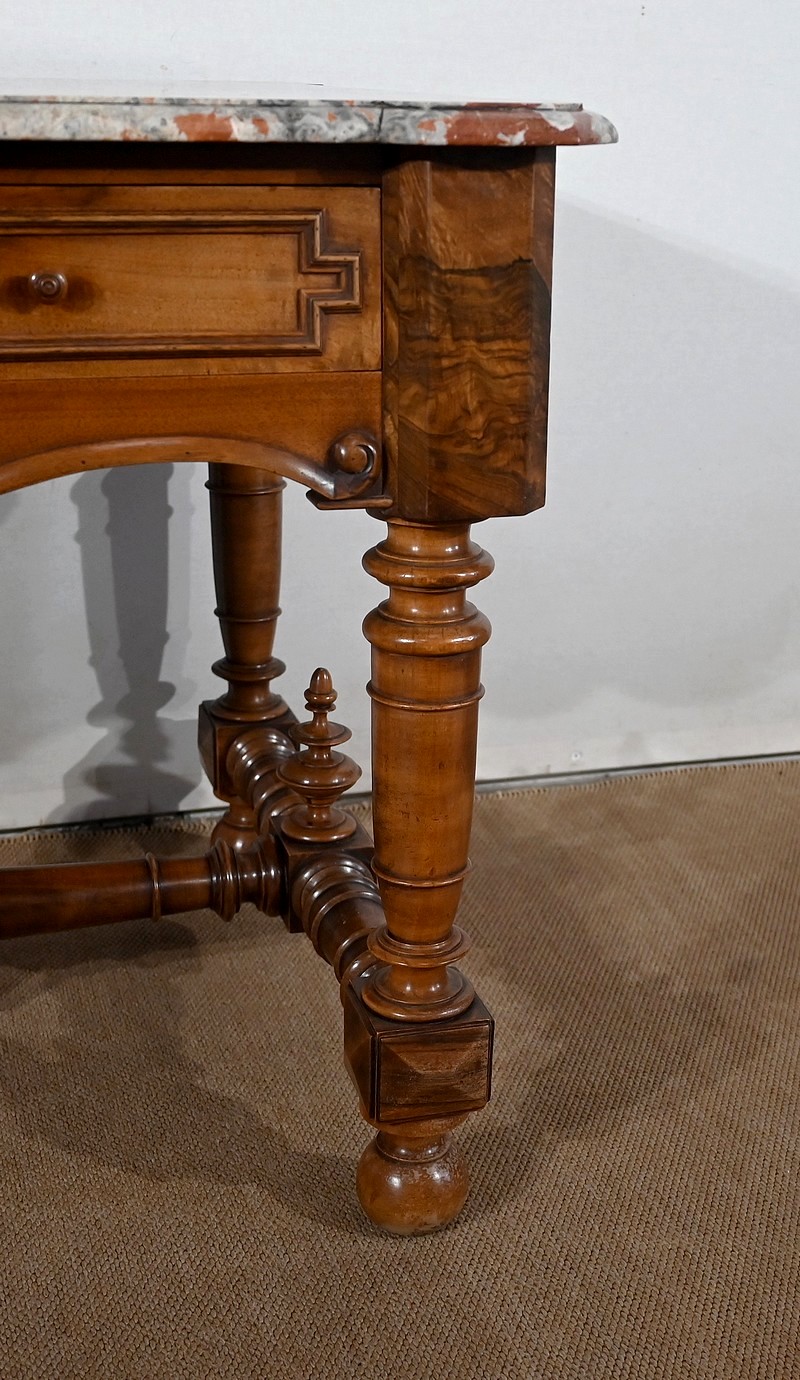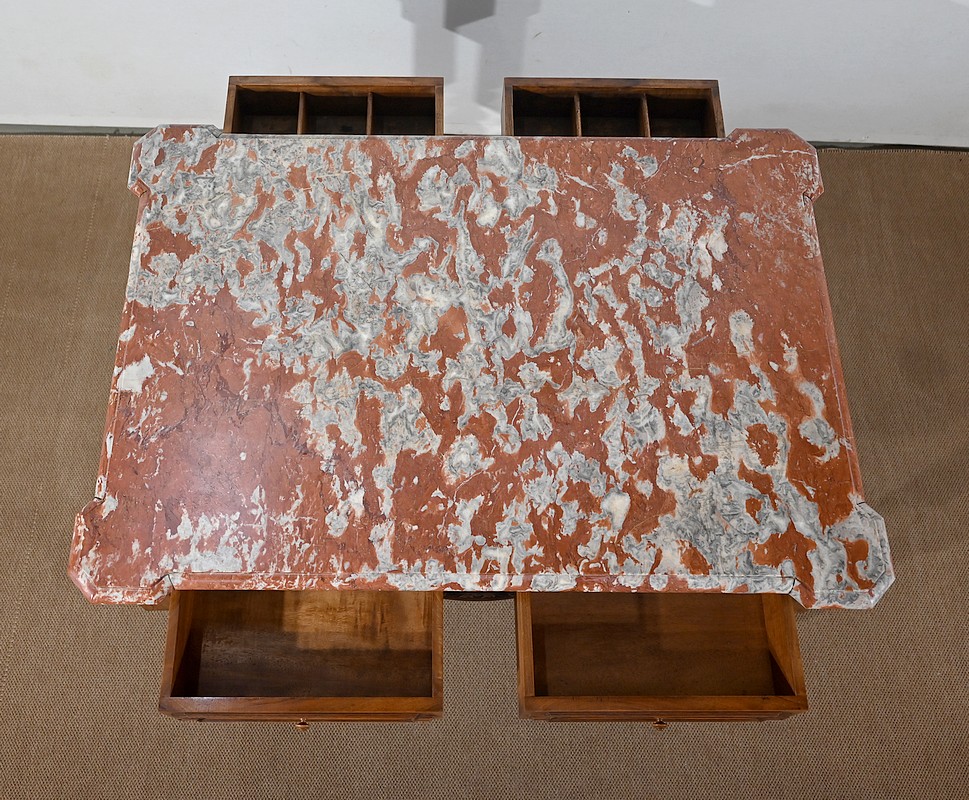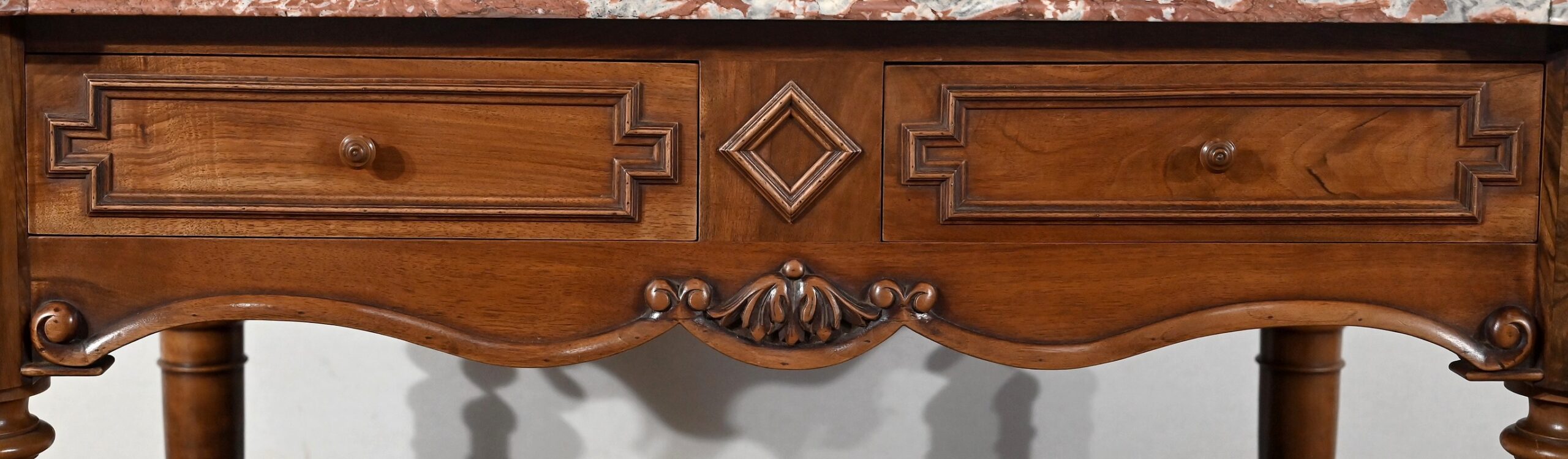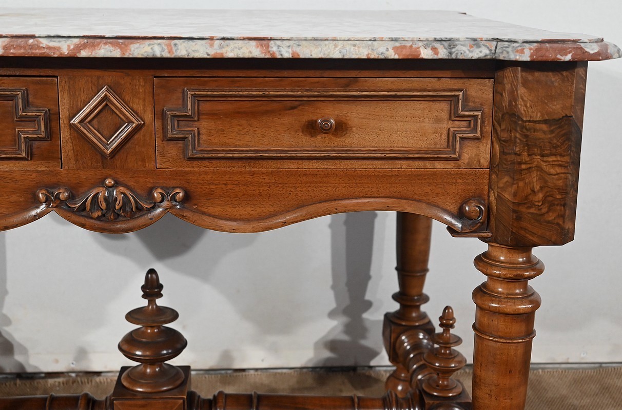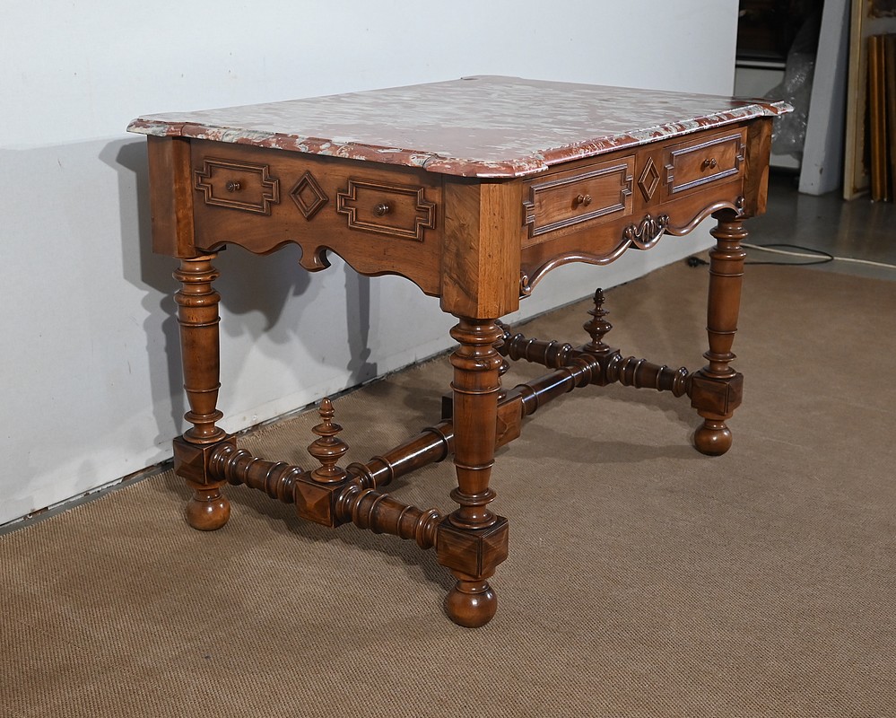 Cette rare table de goût Louis XIII vous séduira par son marbre prestigieux, ses quatre tiroirs originaux et son petit dimensionnel.