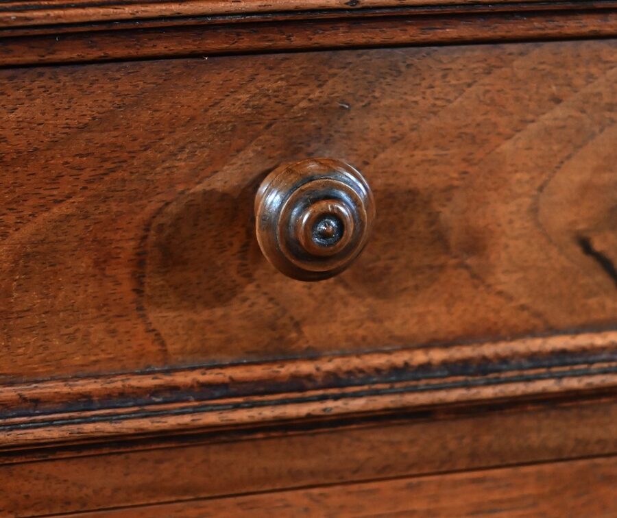 Les façades des tiroirs sont habillées de moulures géométriques harmonieuses et séparées par un grand carré renversé.