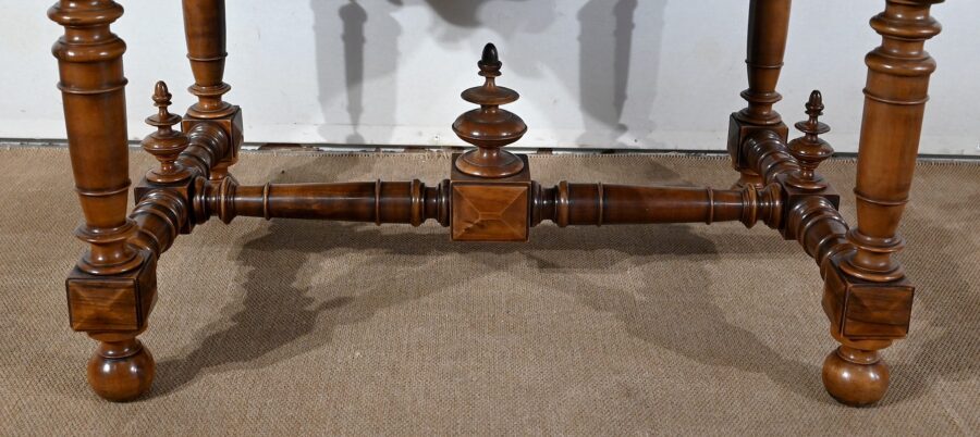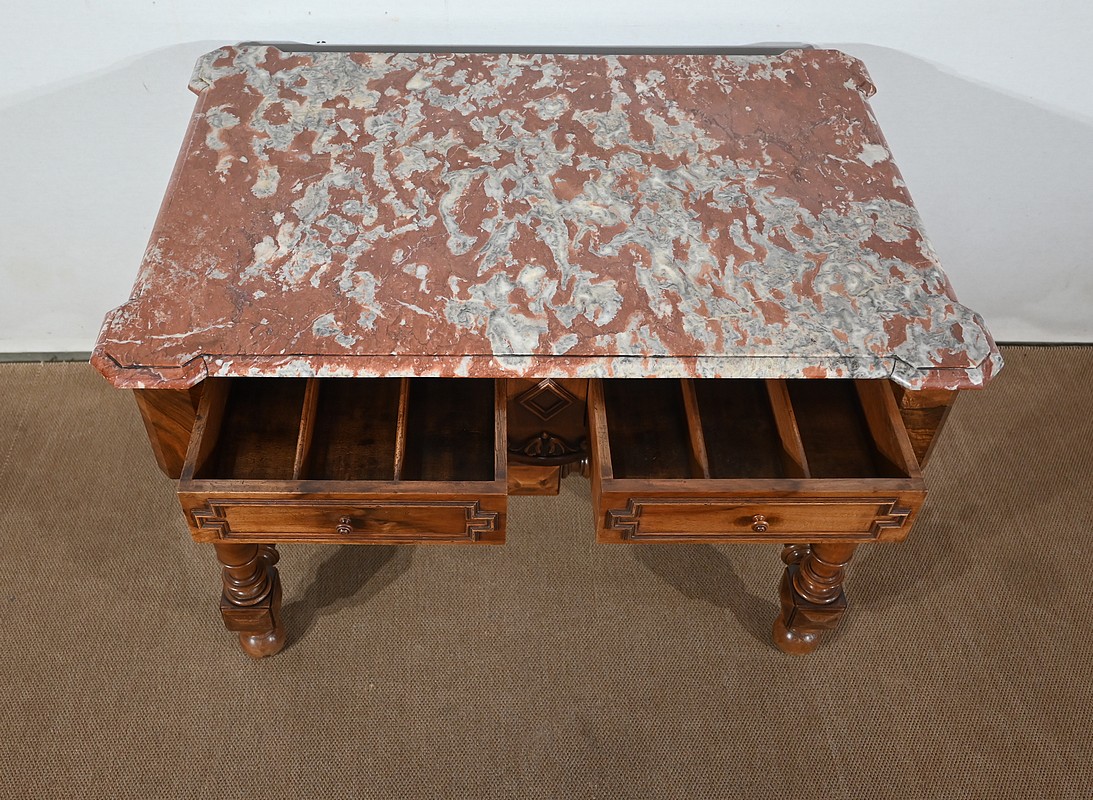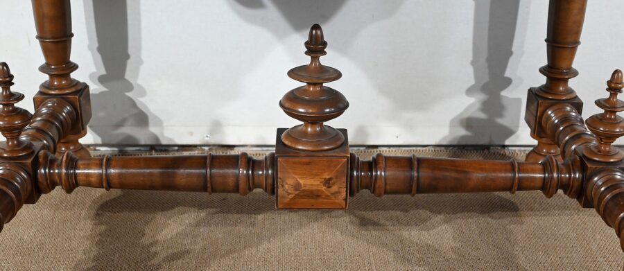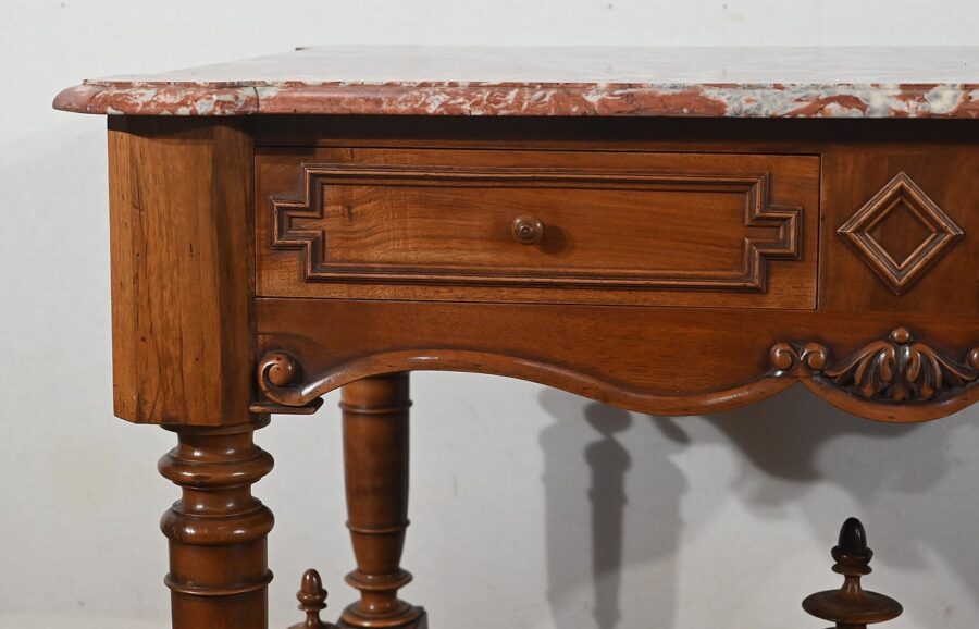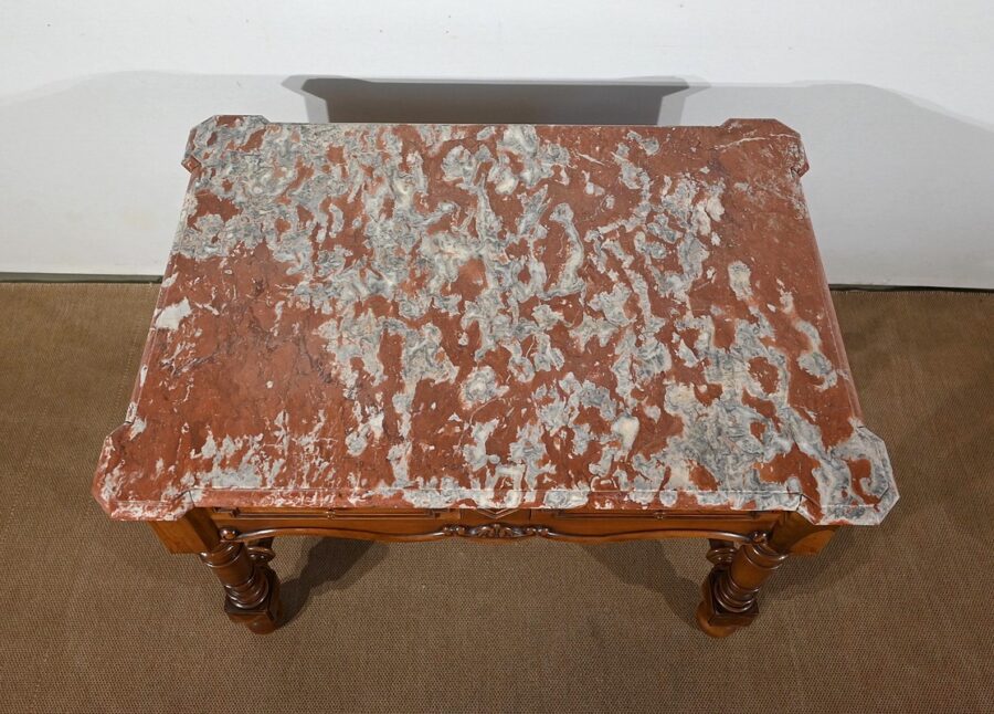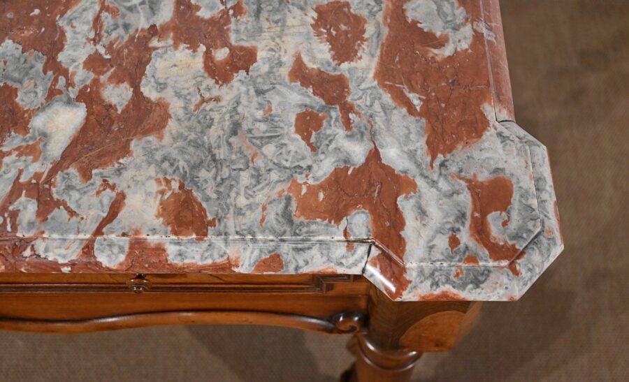 Atypique table de salon en noyer massif sommée d’un magnifique marbre Incarnat Turquin, provenant de Caunes-Minervois dans l’Aude. Ce marbre fût utilisé pour les cheminées du château de Versailles.
