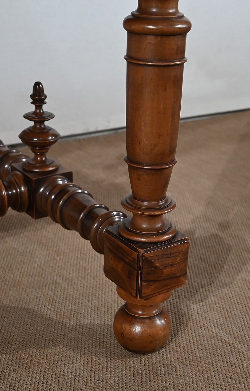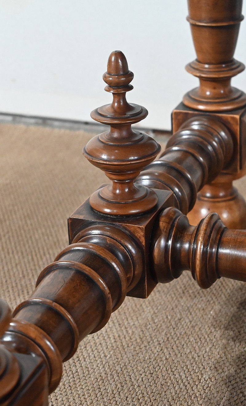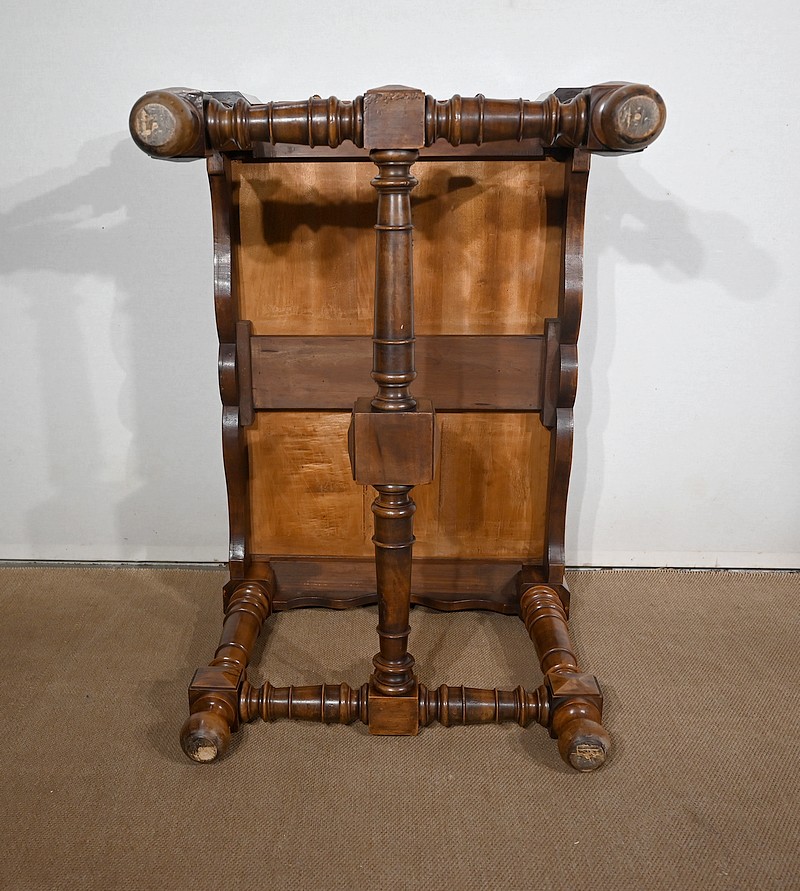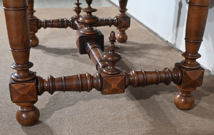 Atypique table de salon en noyer massif sommée d’un magnifique marbre Incarnat Turquin, provenant de Caunes-Minervois dans l’Aude. Ce marbre fût utilisé pour les cheminées du château de Versailles.