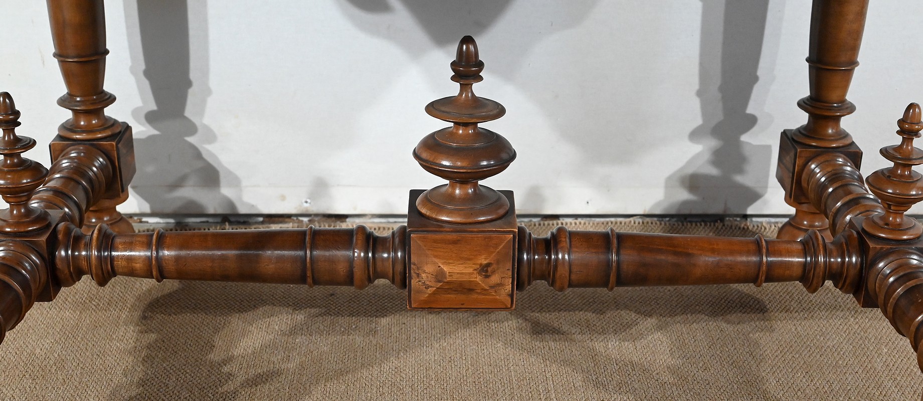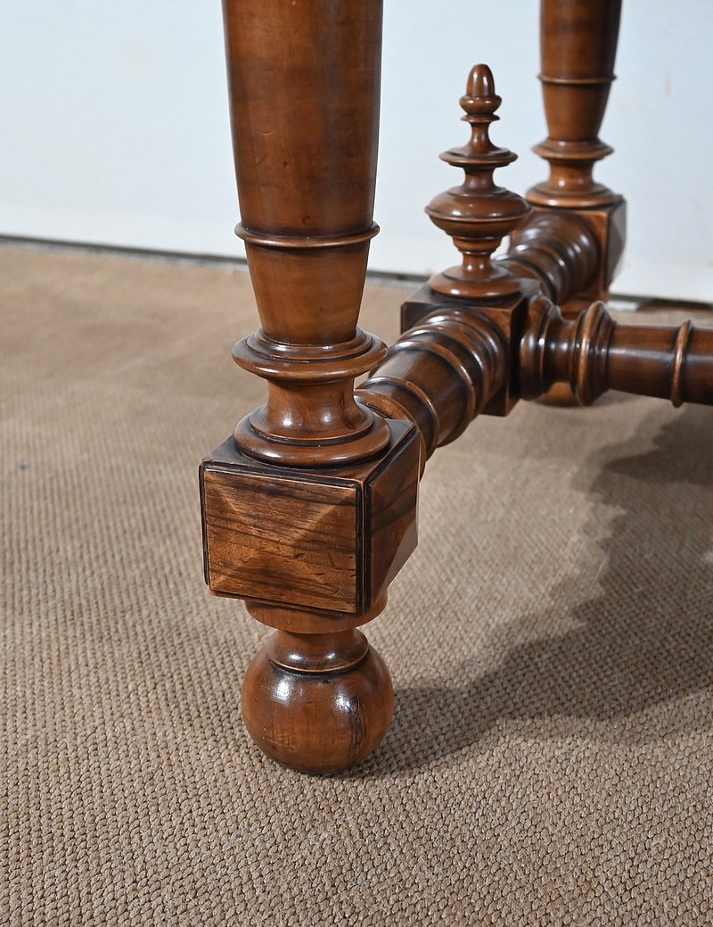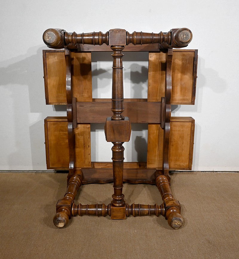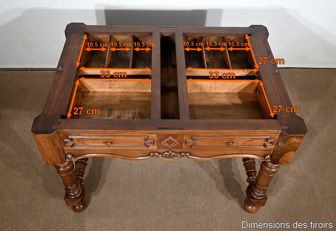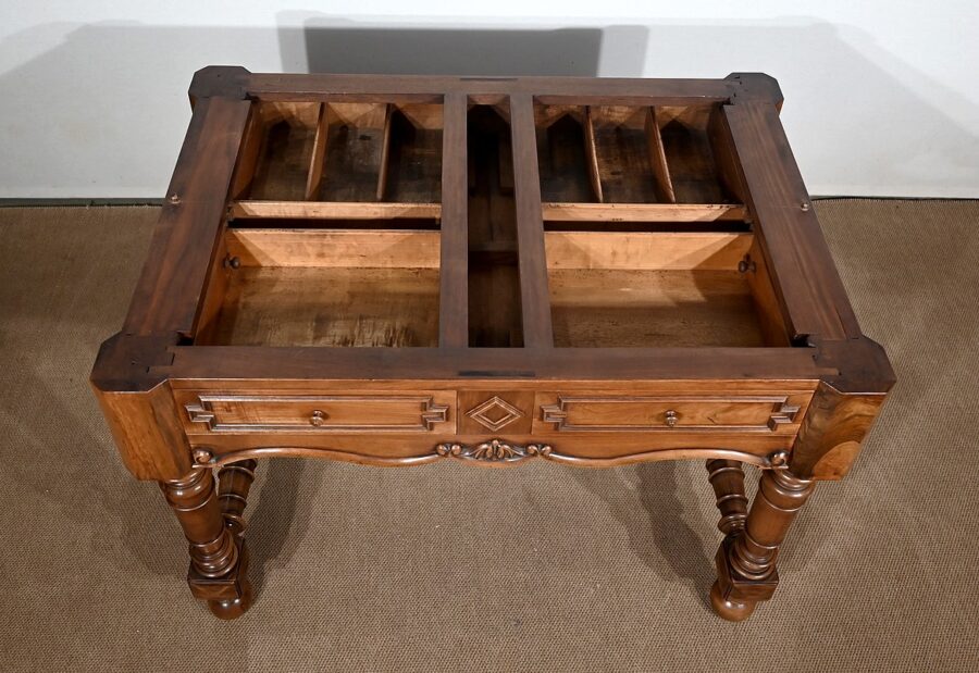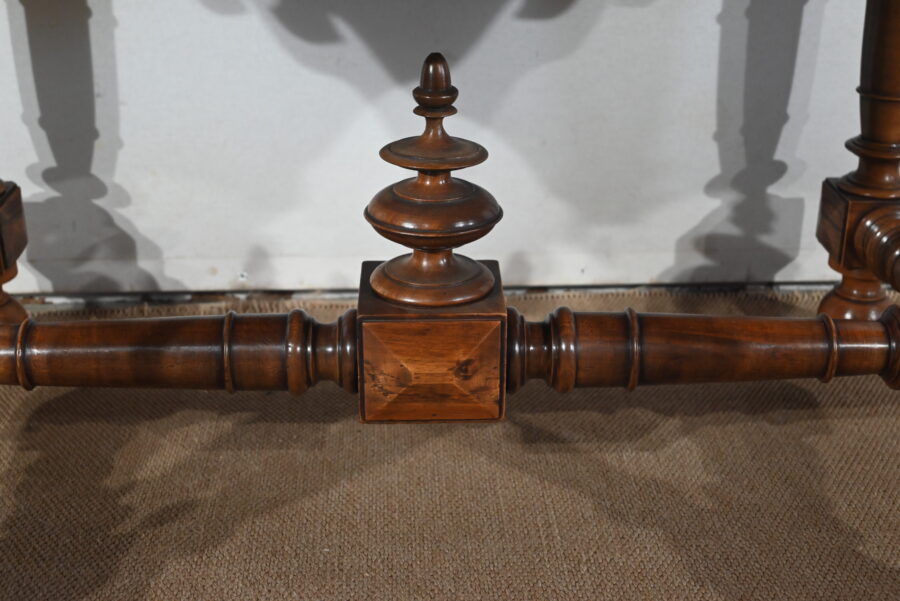 Cette table à pour particularité de présenter quatre tiroirs en parallèle. Deux grandes ceintures sont munies de deux tiroirs se tirant chacun par un bouton bois et des faux tiroirs sont présents sur les côtés.