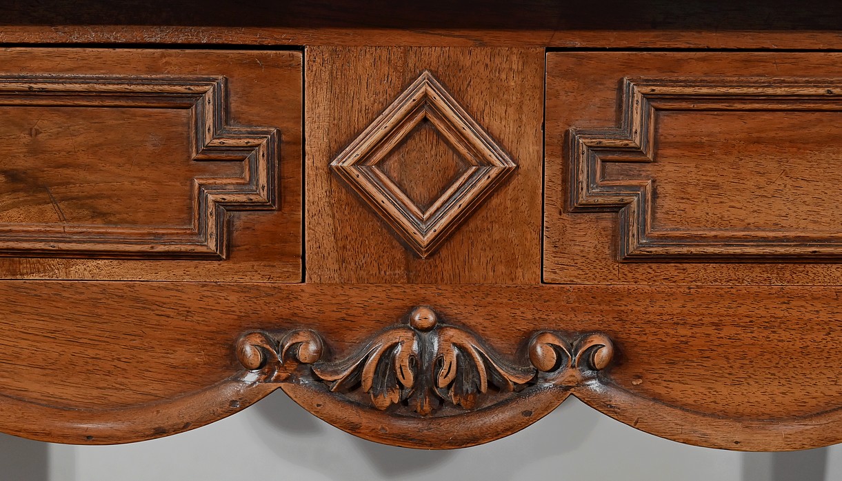 La large ceinture entourant cette table possède une traverse basse légèrement découpée faisant ressortir une baguette à volutes et au centre une importante sculpture feuillagée.