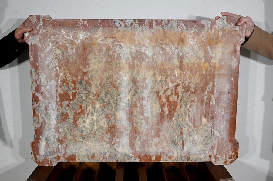 Le marbre rouge incarnat turquin, allie des tons roses, oranges, blancs et gris. Il est doté d’angles à ressauts et à facettes avec un pourtour en bec-de-corbin.