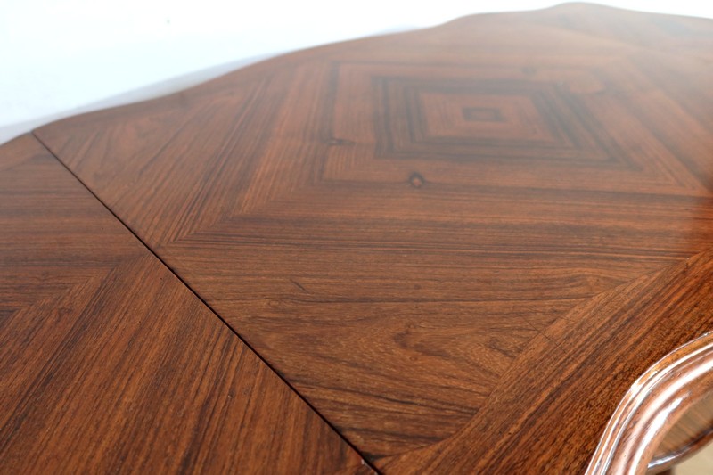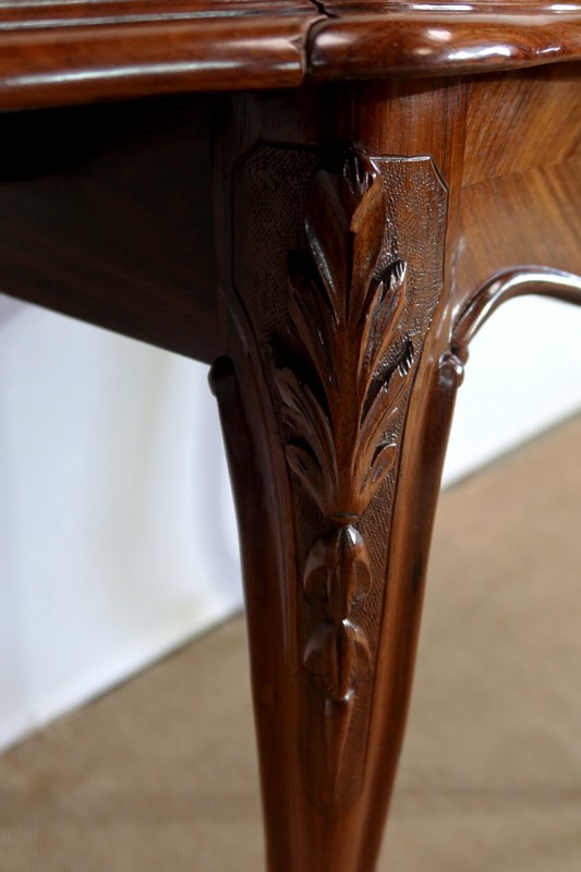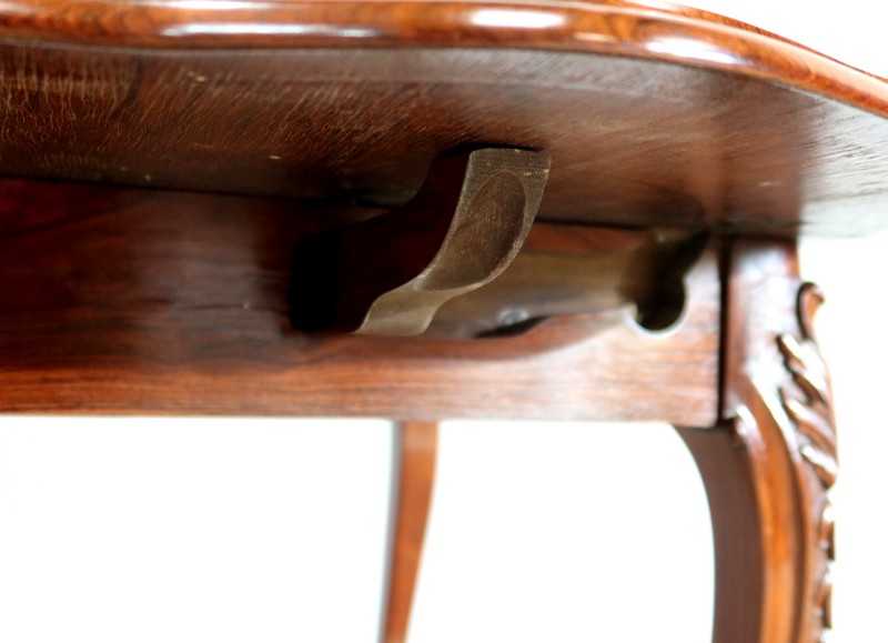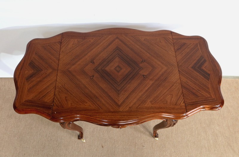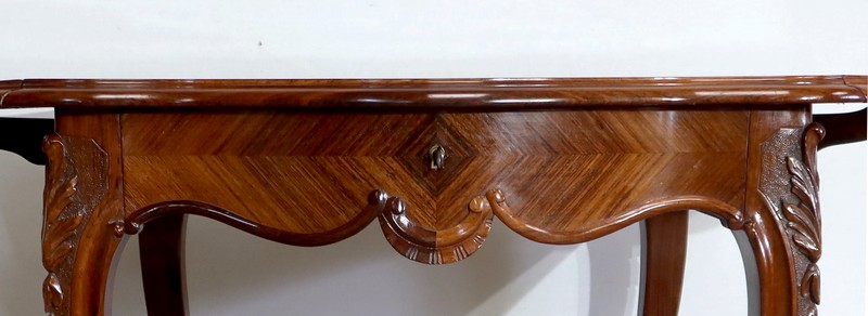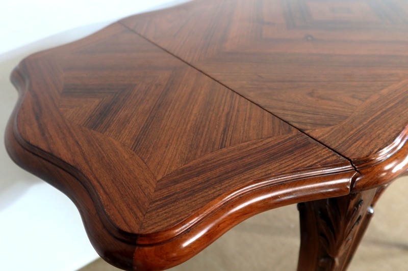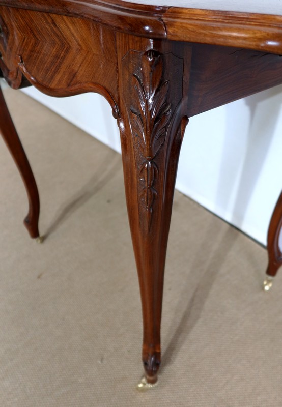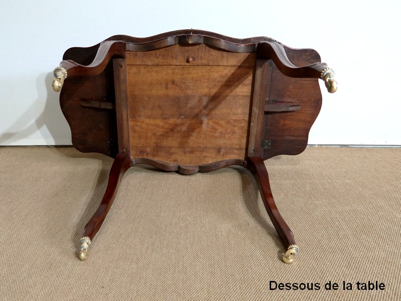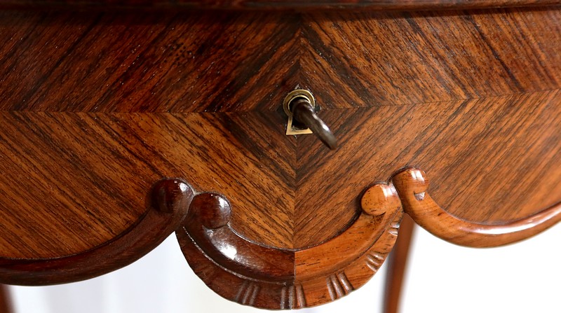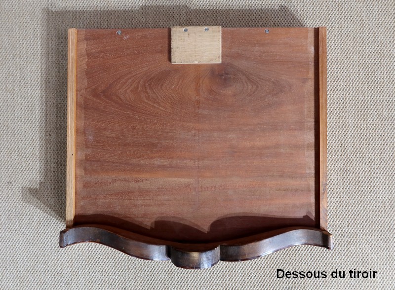 Le dessus est composé d’un placage de palissandre de Rio à quatre feuilles, et d’un encadrement mouvementé à coupe d’onglet en palissandre massif, façon bec de corbin et gorge à l’arête.