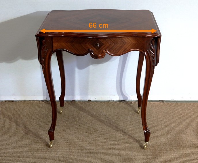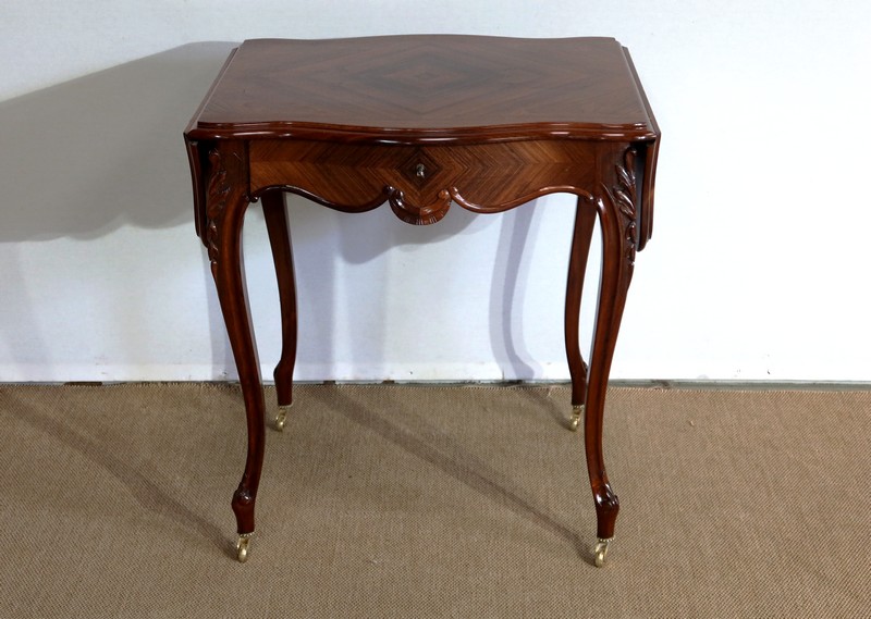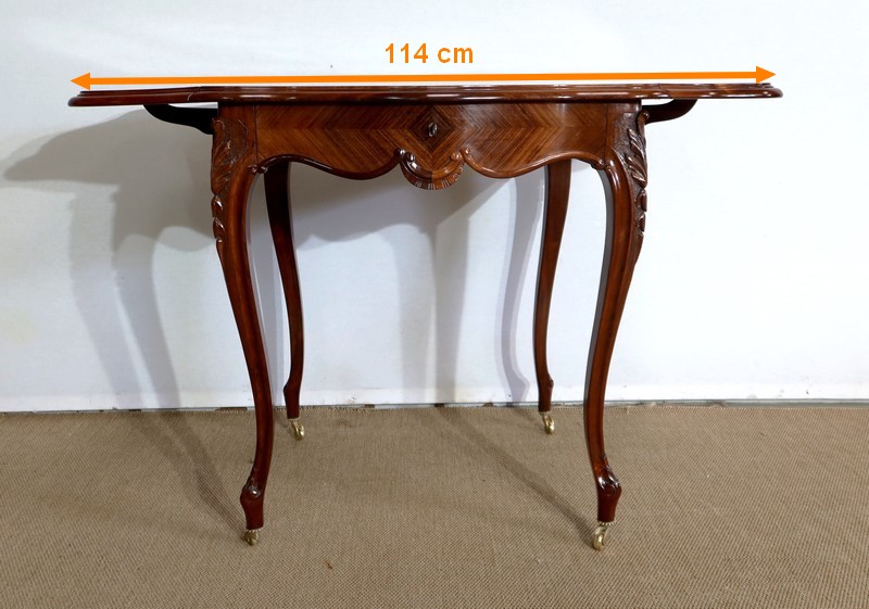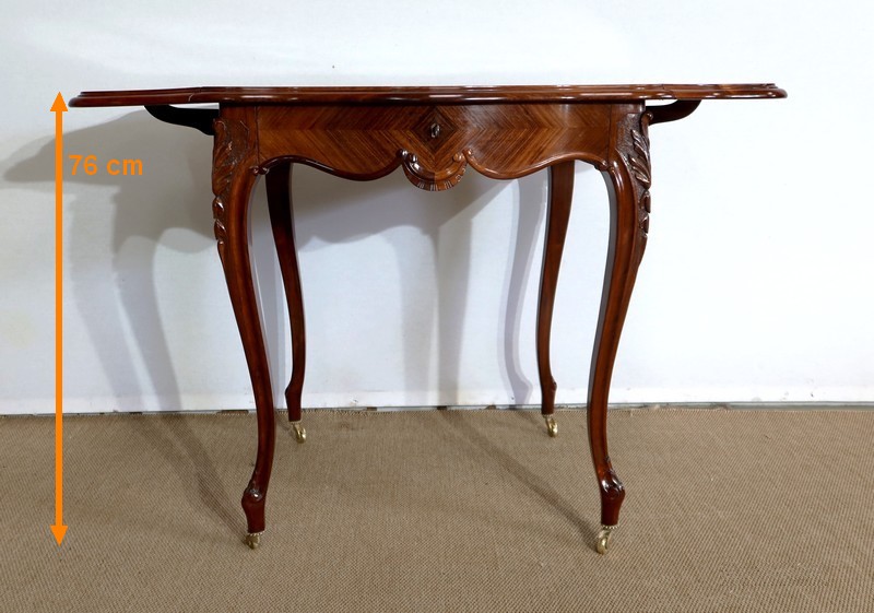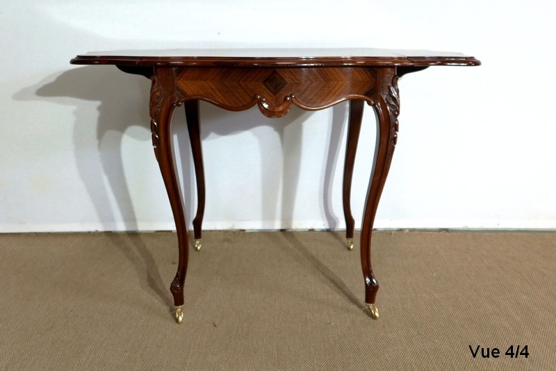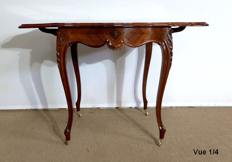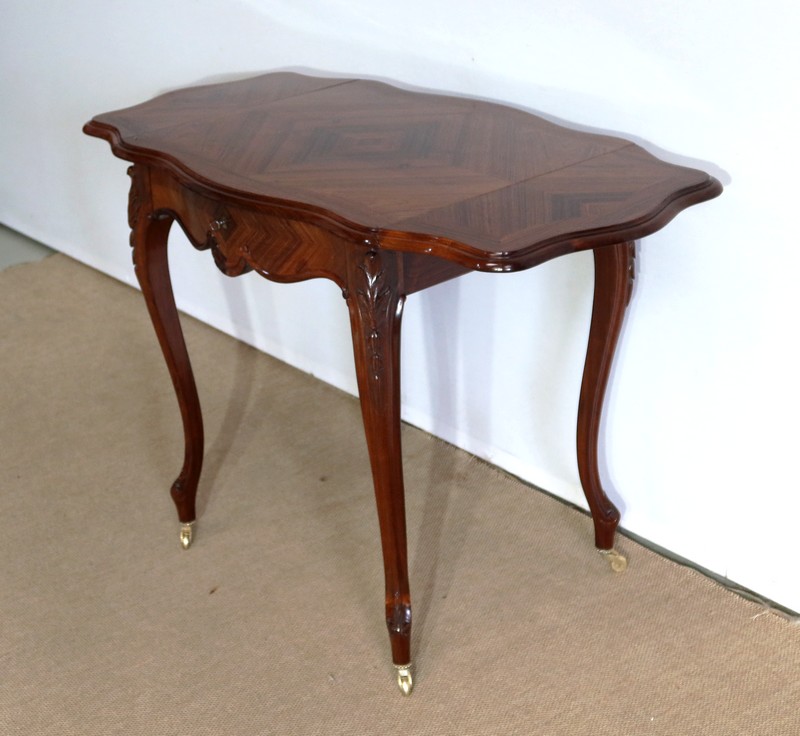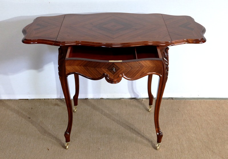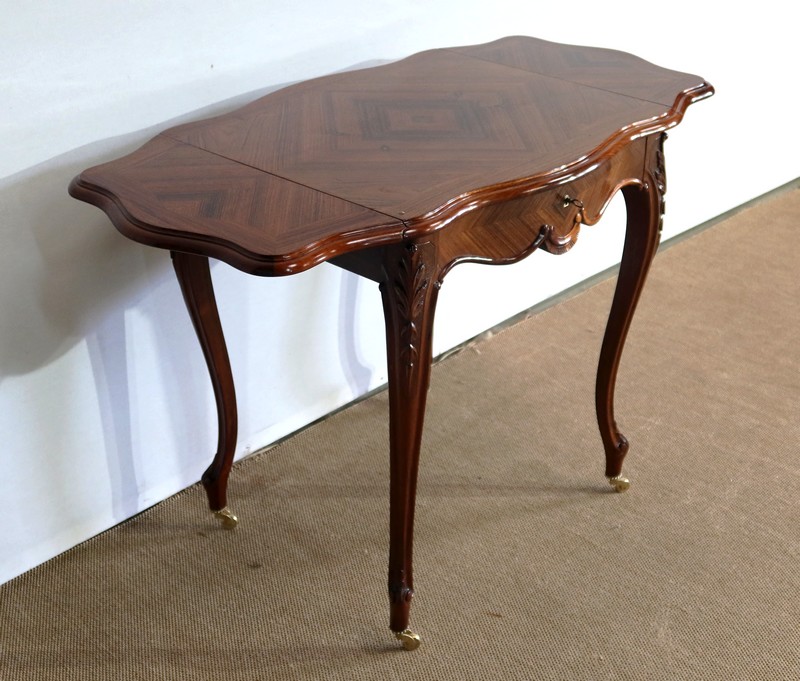 Le dessus est composé d’un placage de palissandre de Rio à quatre feuilles, et d’un encadrement mouvementé à coupe d’onglet en palissandre massif, façon bec de corbin et gorge à l’arête.