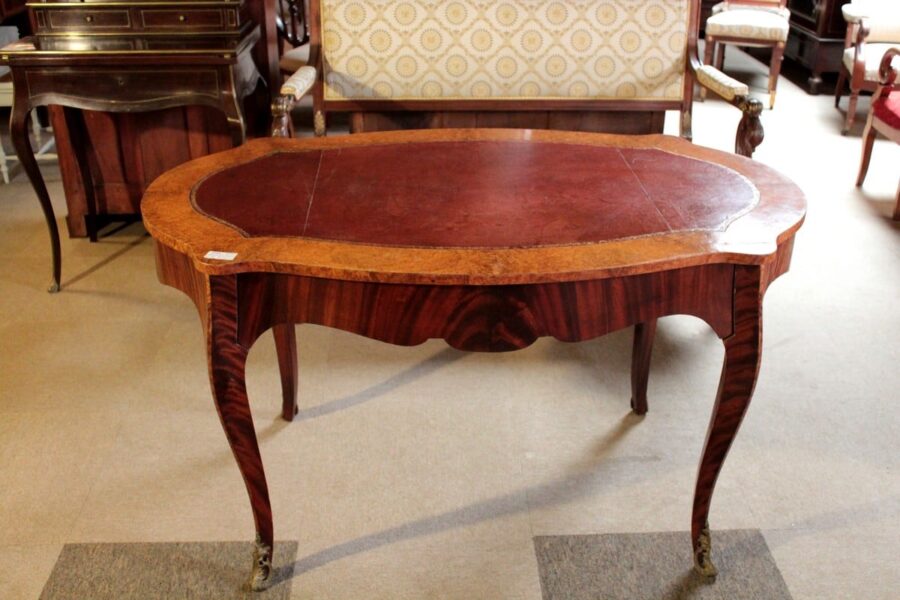 Table de salon de style Louis XV en Acajou. Son dessus est recouvert d’un cuir de couleur bordeaux entouré d’une bande de loupe de thuya. Elle ouvre par un grand tiroir dans le bandeau et repose sur 4 pieds galbés terminés par des sabots de bronze. Époque : fin XIXe