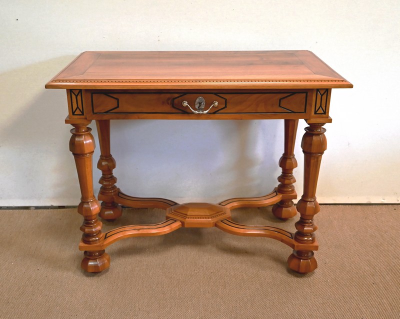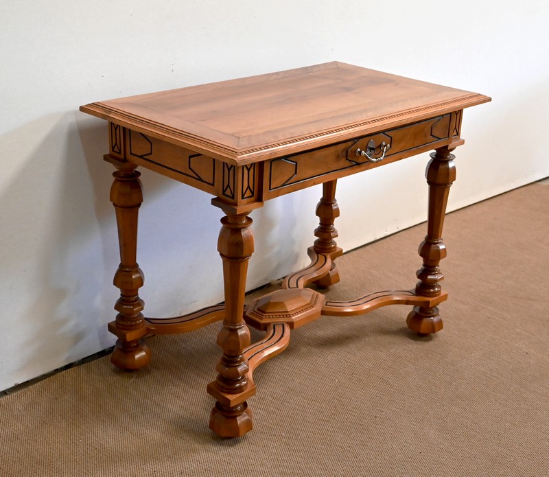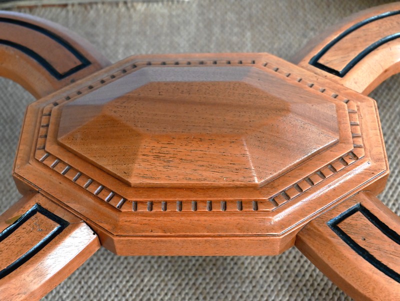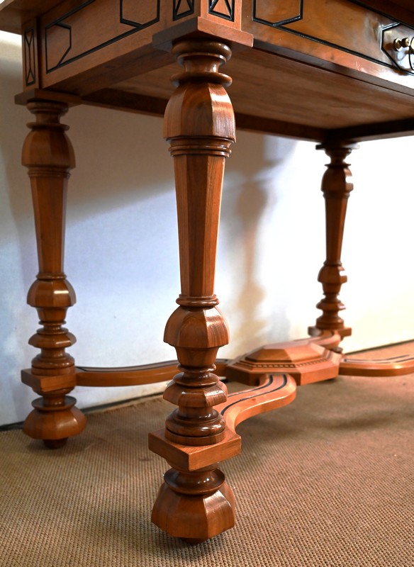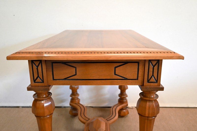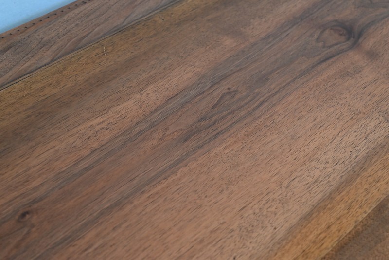 Cette table en noyer massif offre un dessus à encadrement à coupe d’onglet composé d’une seule planche en son centre. Son pourtour est mouluré et sculpté de petits motifs.