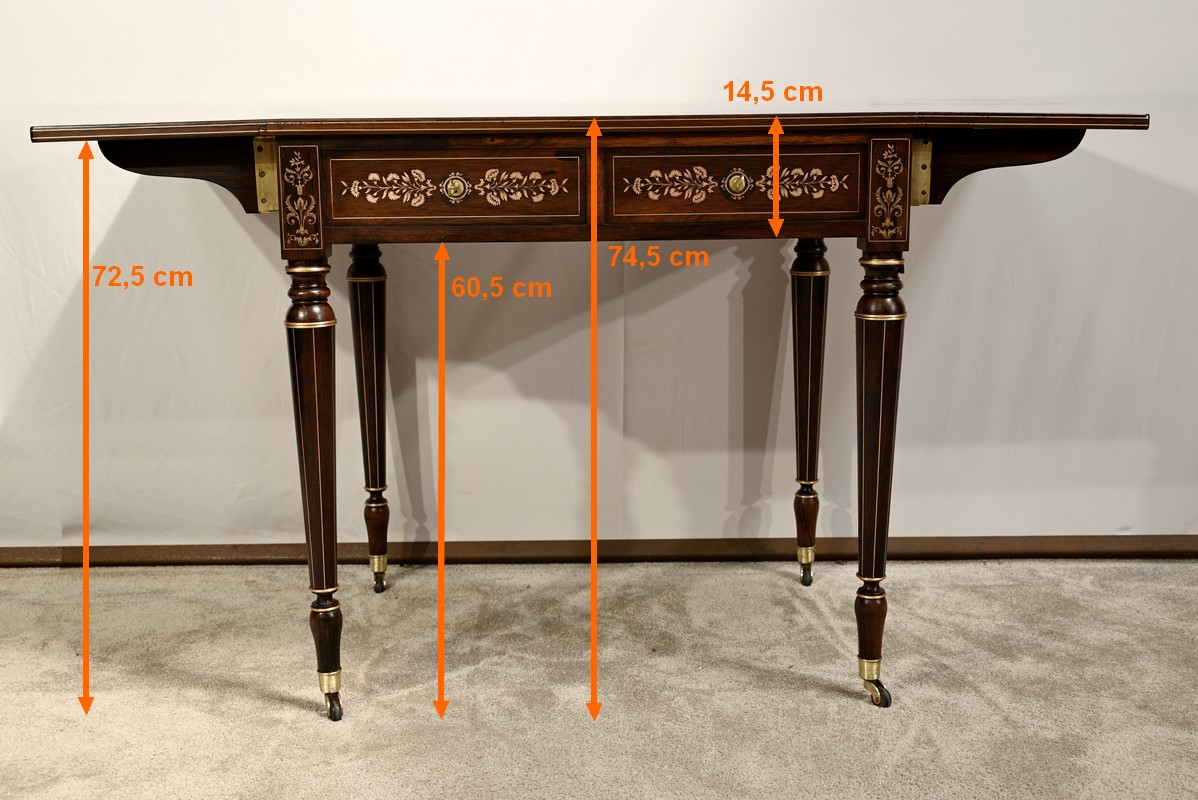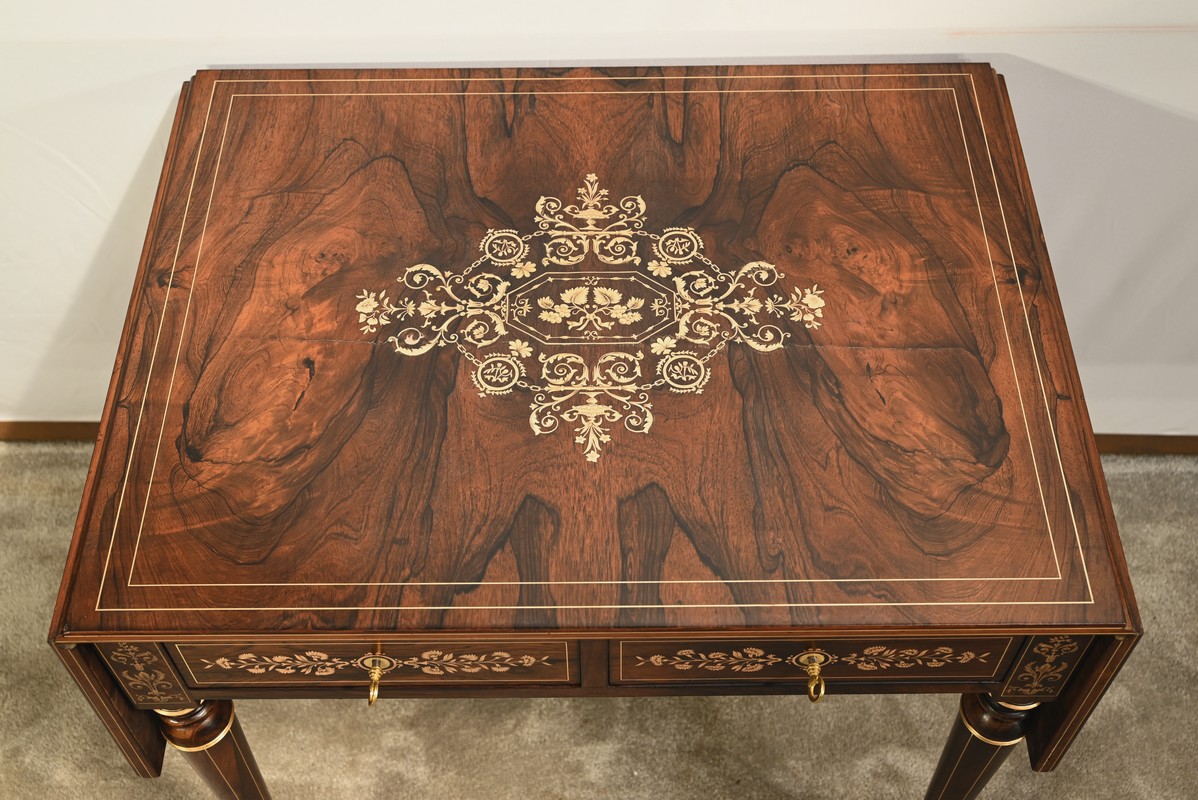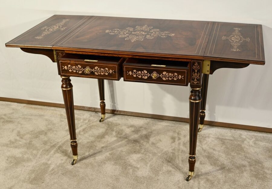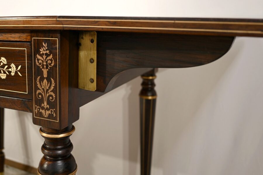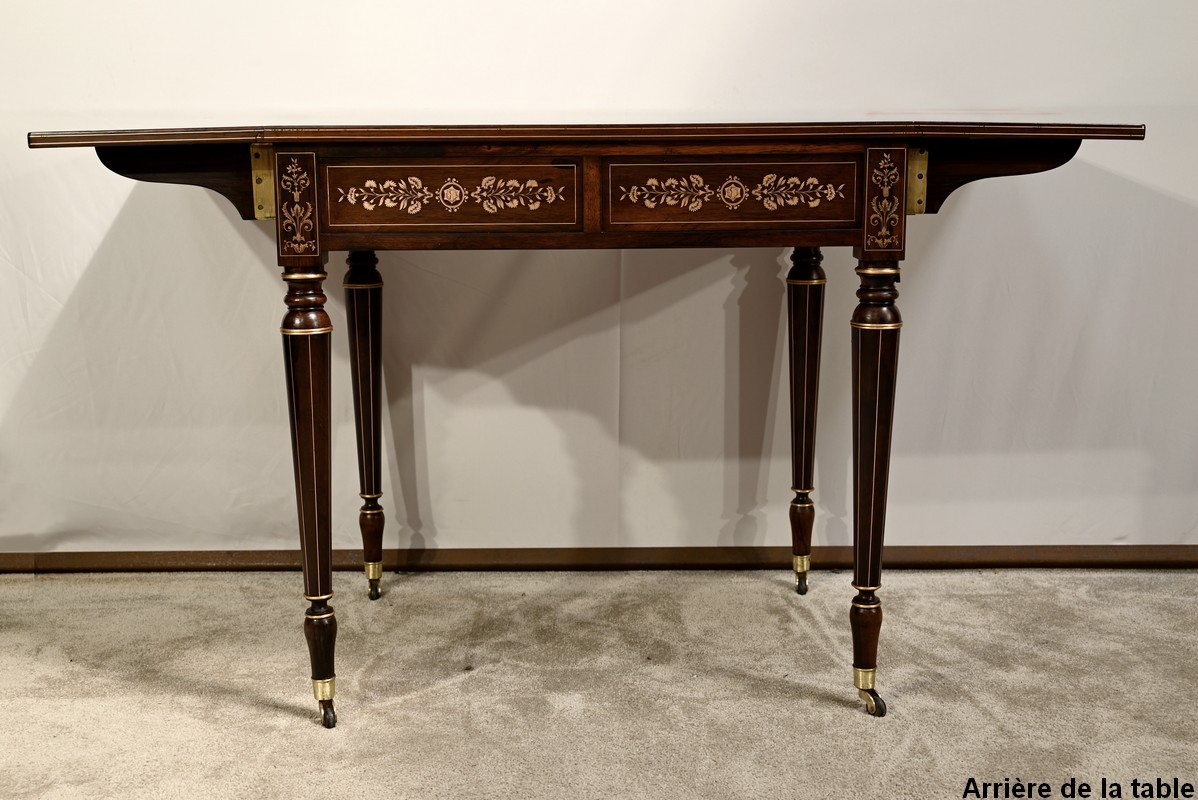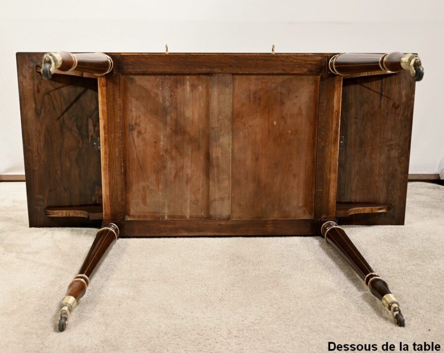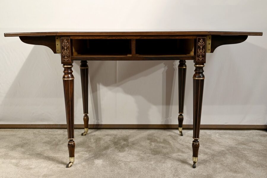 Table, en palissandre massif et plaqué, toutes faces et modulable, à deux abattants aux extrémités, permettant d’obtenir une plus grande surface.