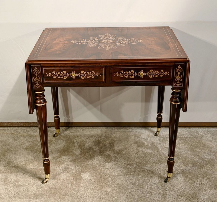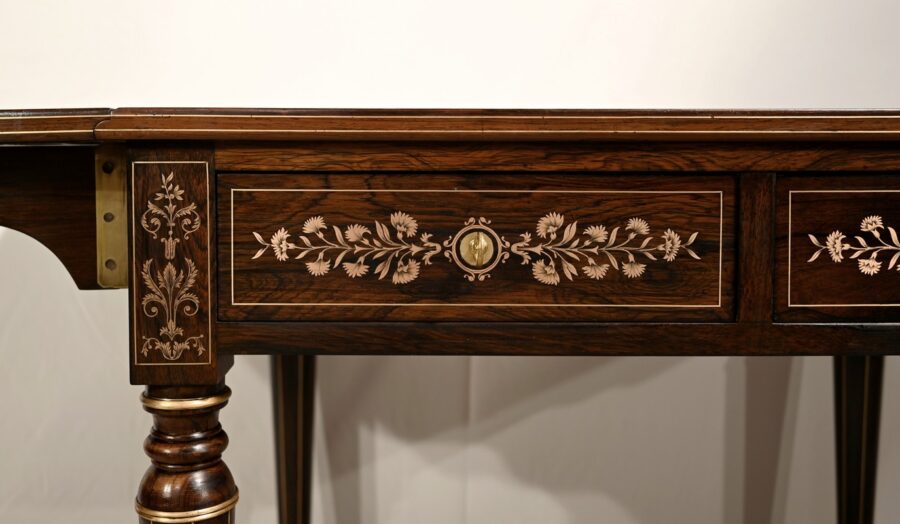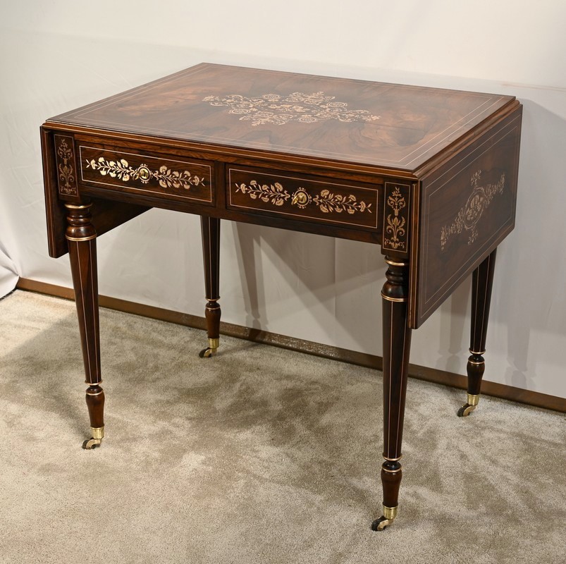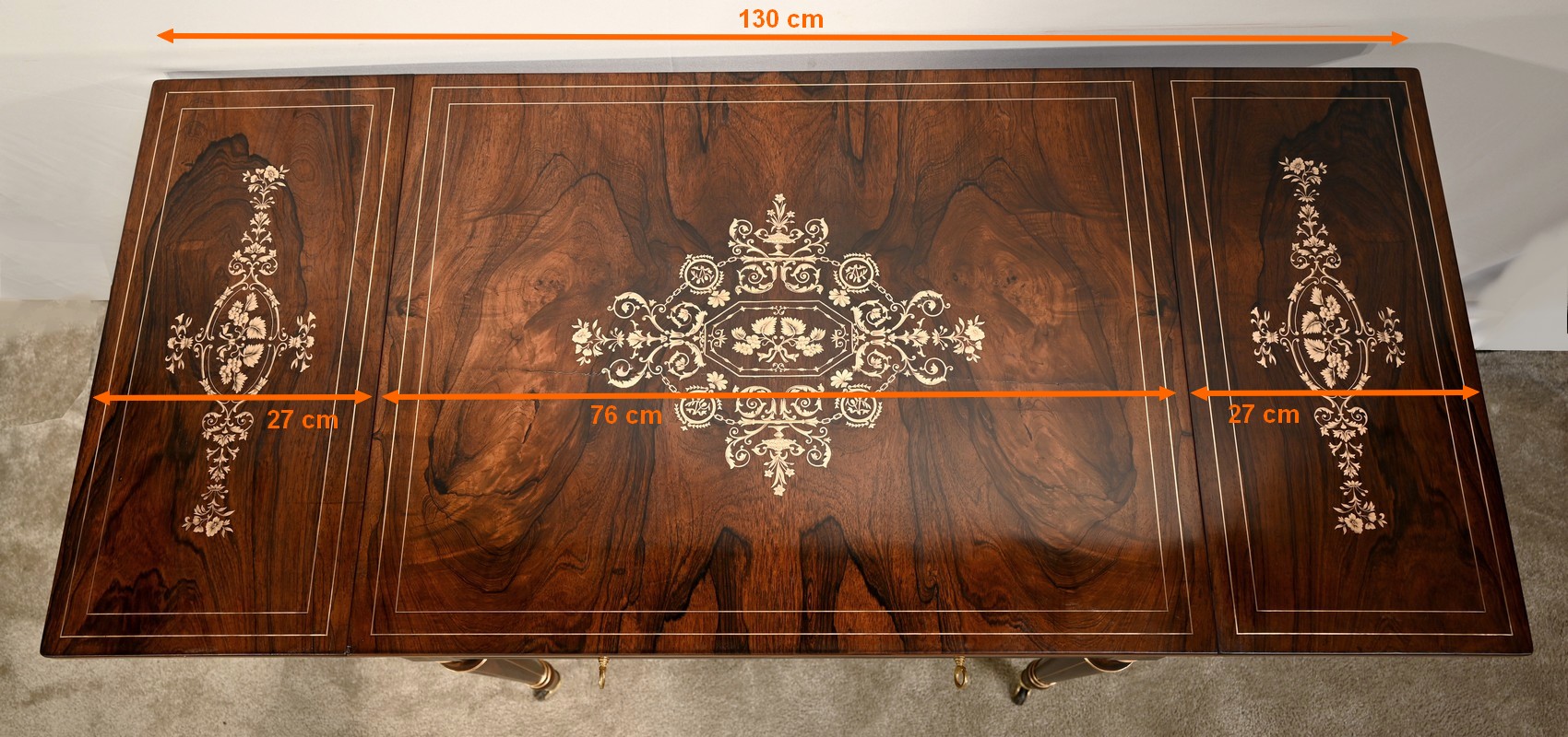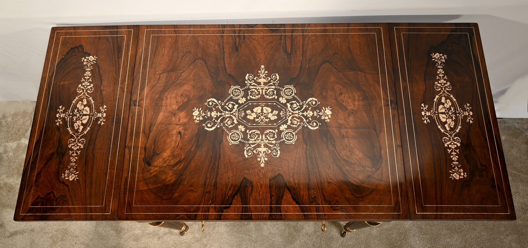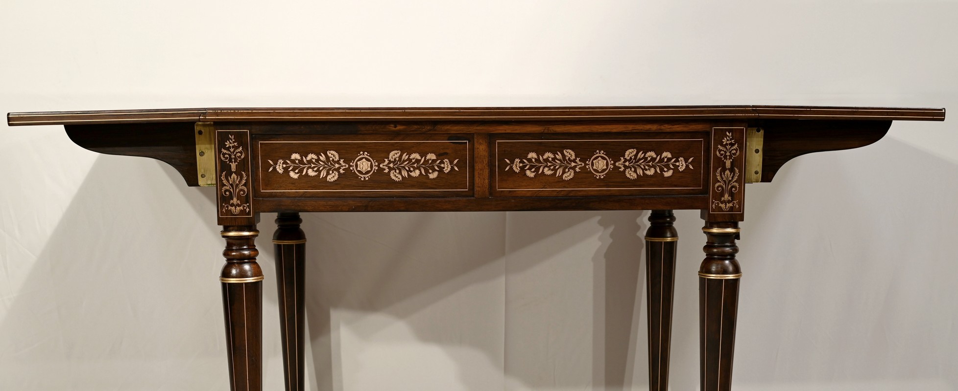 Table, en palissandre massif et plaqué, toutes faces et modulable, à deux abattants aux extrémités, permettant d’obtenir une plus grande surface.