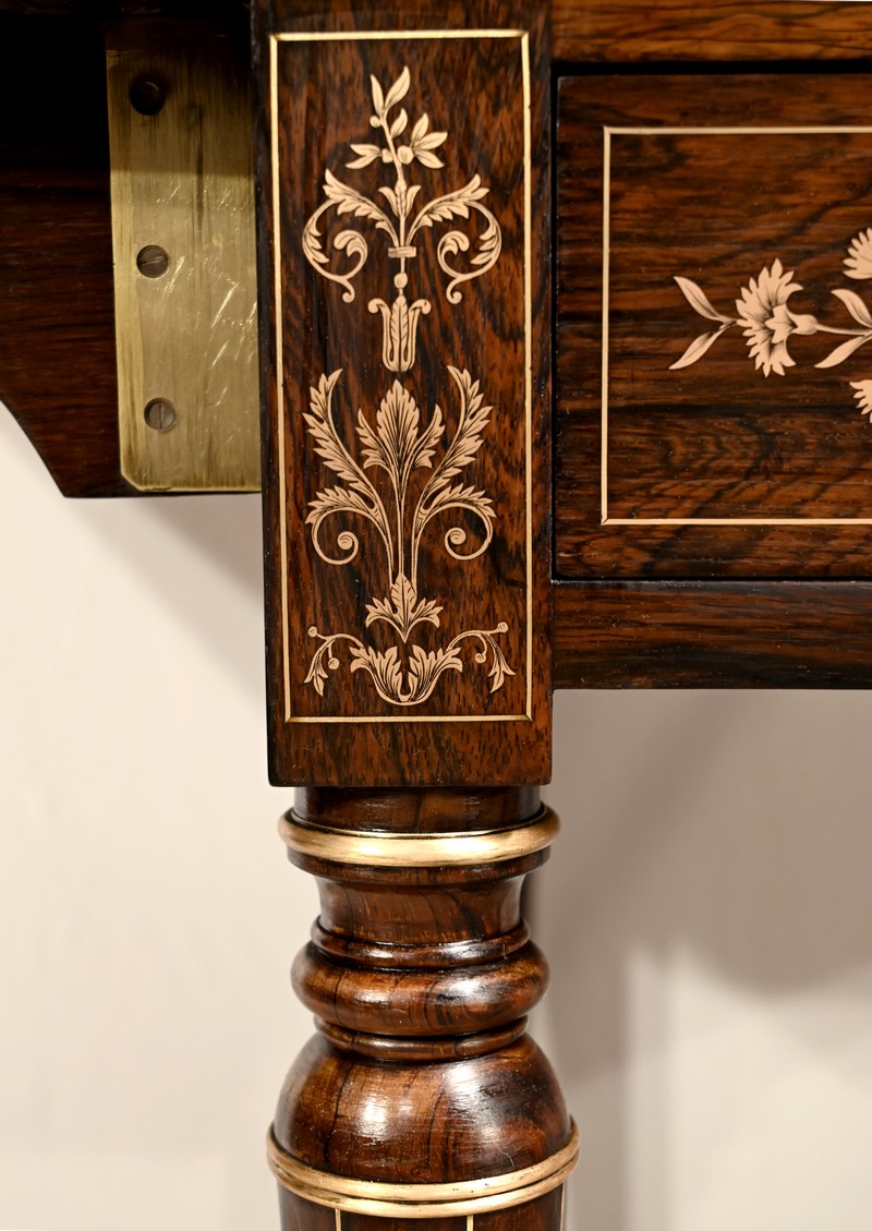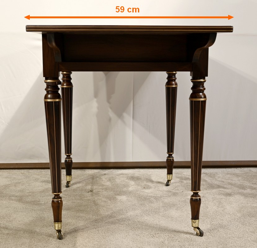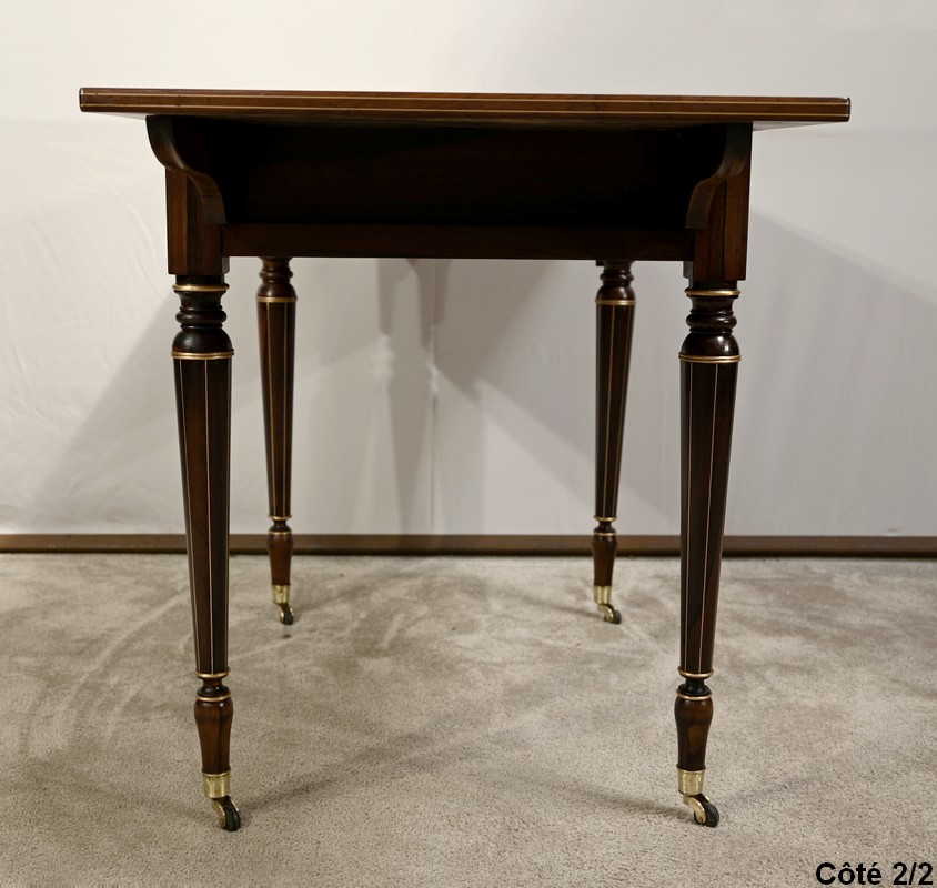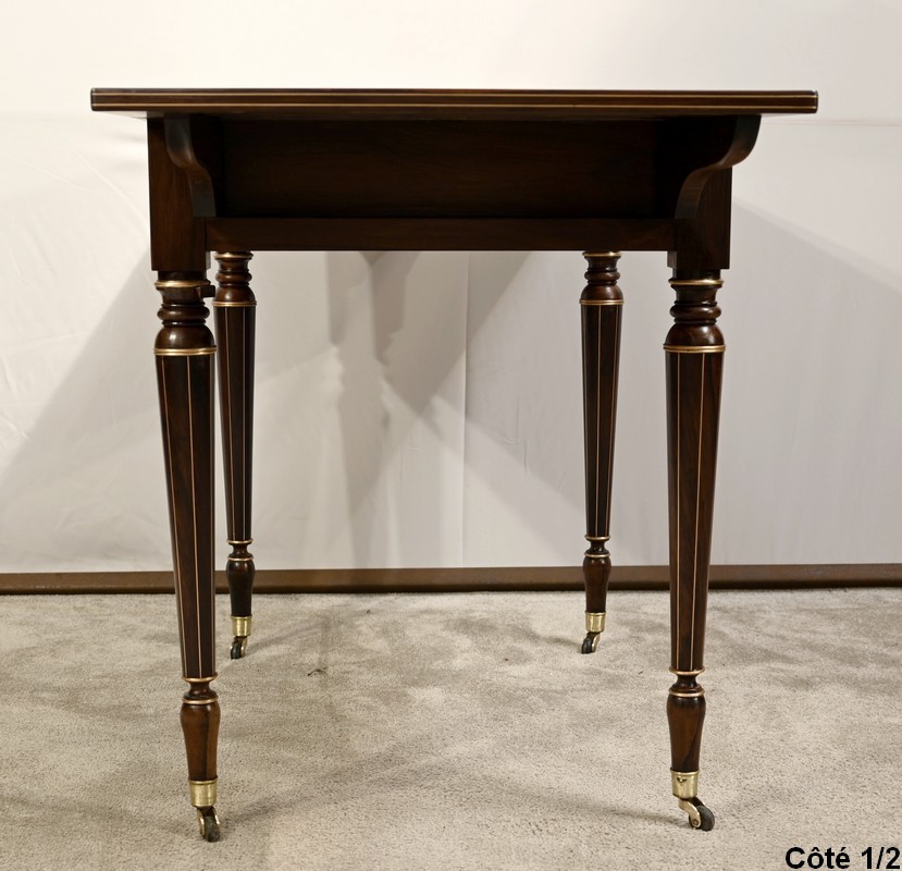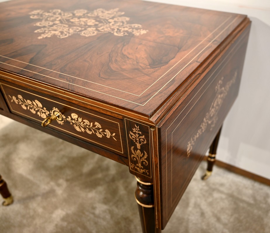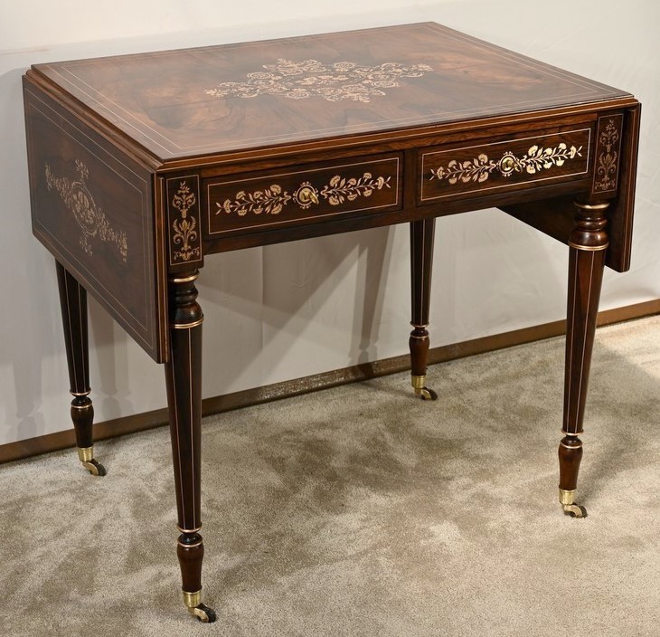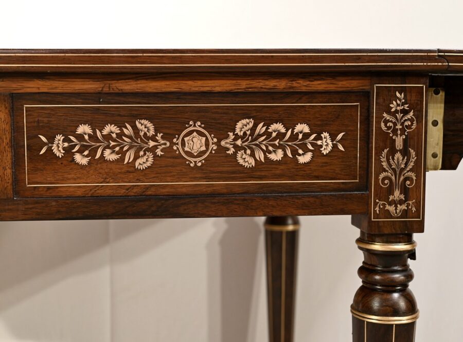 Table, en palissandre massif et plaqué, toutes faces et modulable, à deux abattants aux extrémités, permettant d’obtenir une plus grande surface.