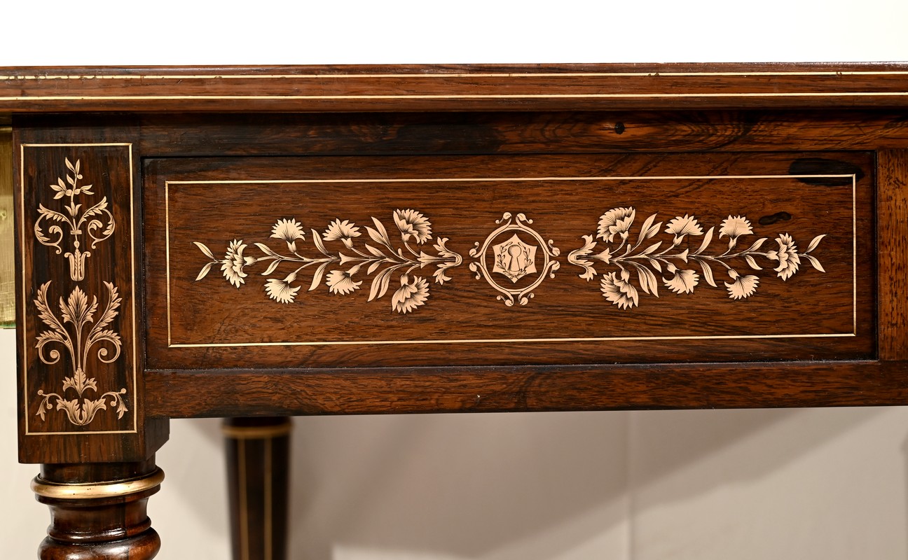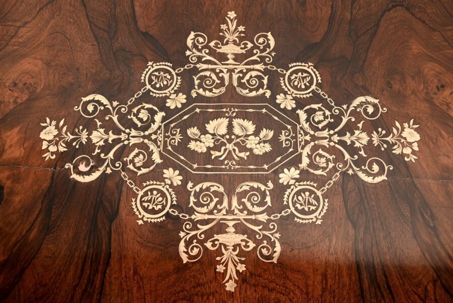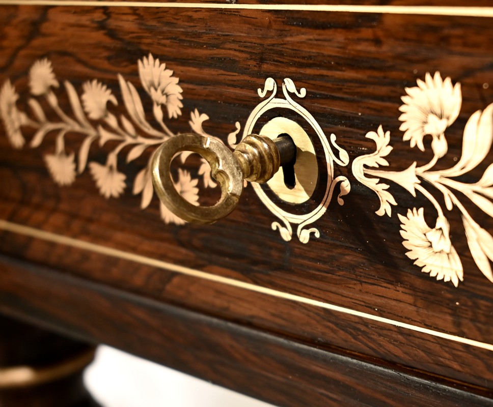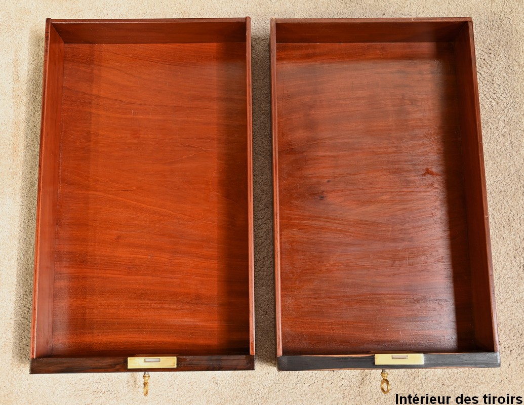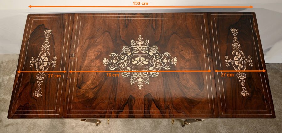 Le dessus est composé d’un développé, avec joint central invisible, agrémenté de double filet et d’importantes compositions en laiton finement ciselé.