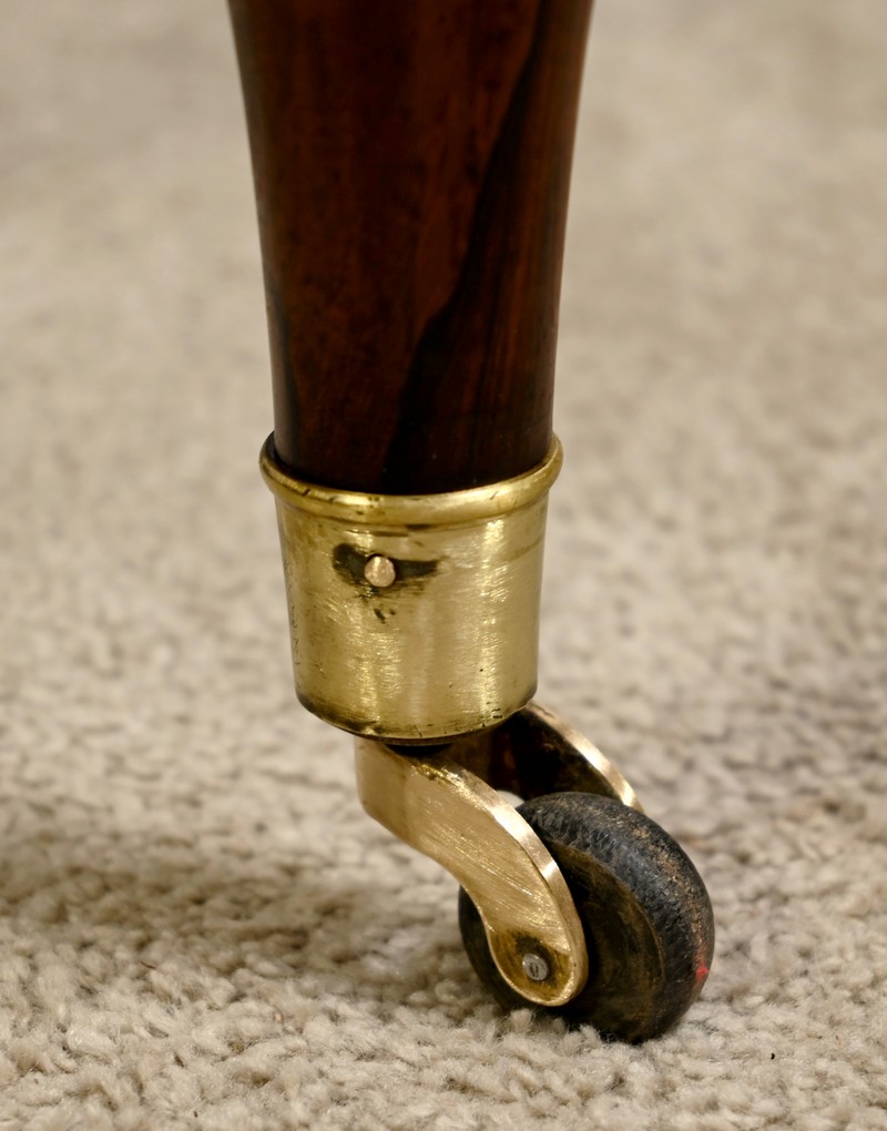Ce piètement repose sur quatre sabots à roulettes pour faciliter le déplacement.