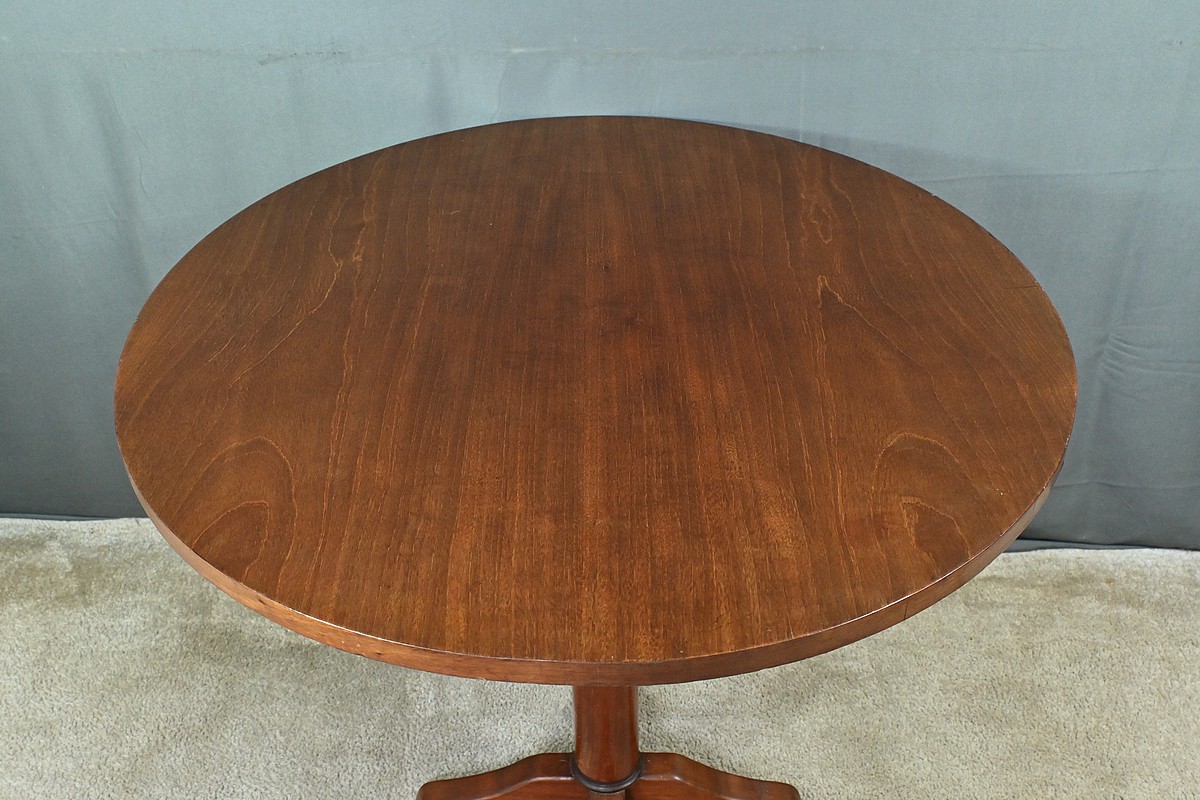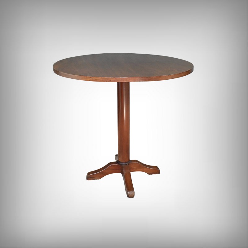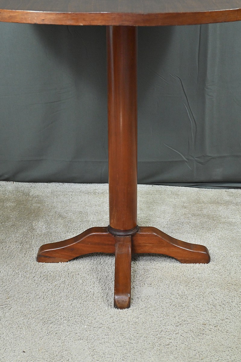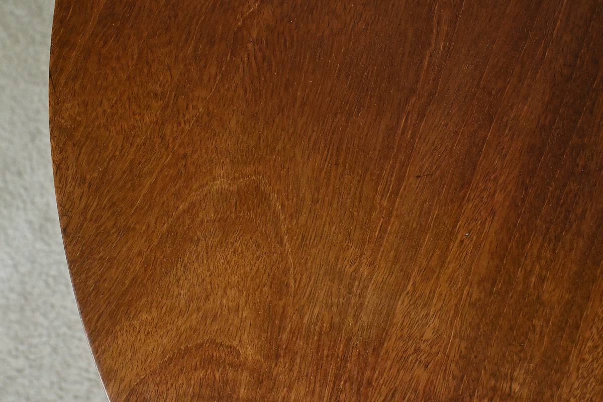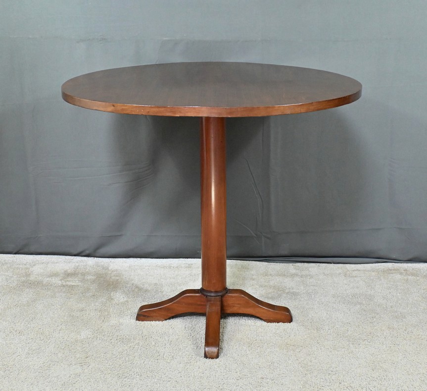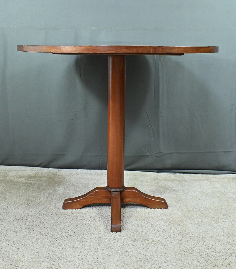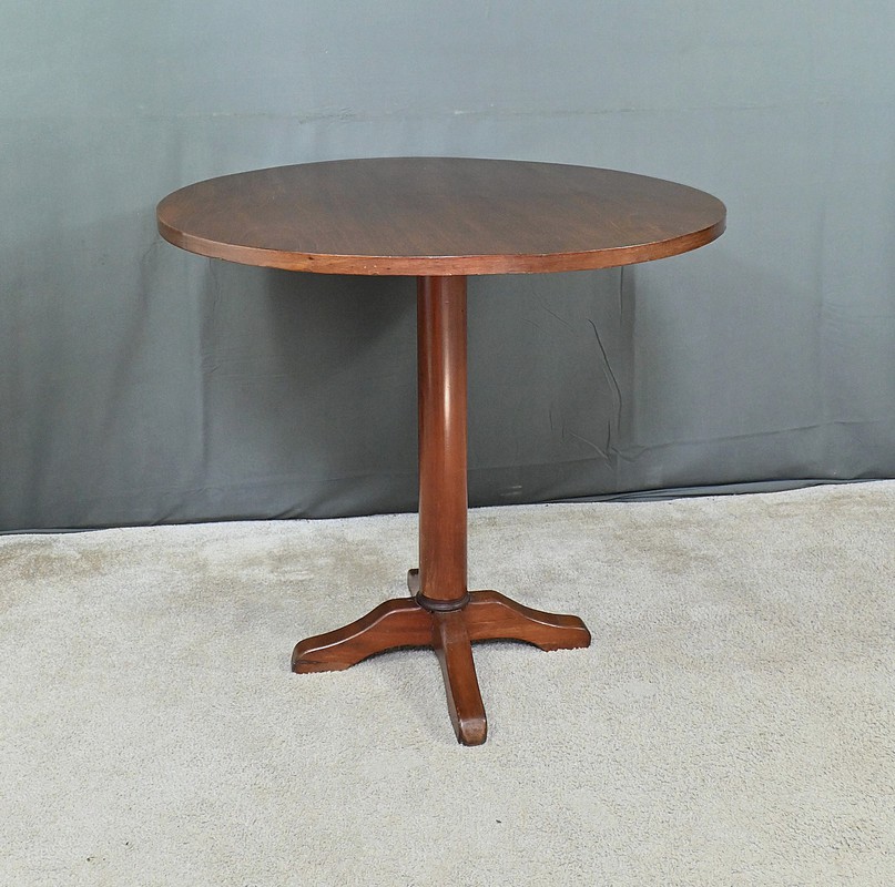 Élégante petite table ronde réalisée en acajou, dont le plateau laisse apparaître la chaleur et la profondeur de son veinage. Elle repose sur un fût central élancé se terminant par quatre pieds mouvementés aux lignes galbées, assurant à la fois stabilité et raffinement. Son style sobre et fonctionnel, typique du début du XXe siècle, en fait une pièce polyvalente, idéale aussi bien comme table d’appoint que comme élément décoratif dans un intérieur classique ou éclectique.