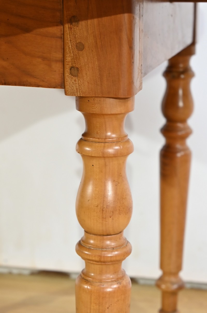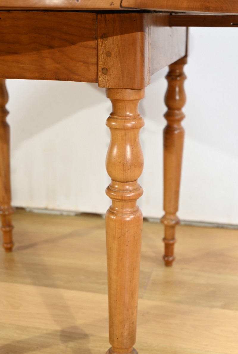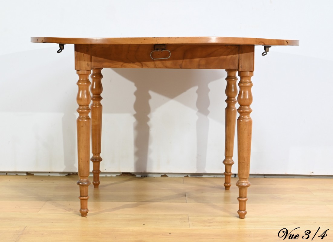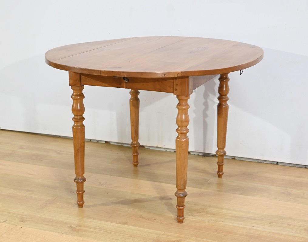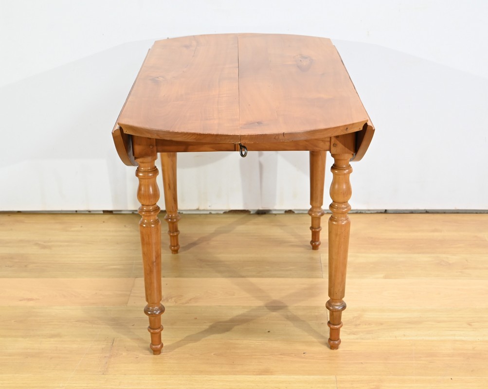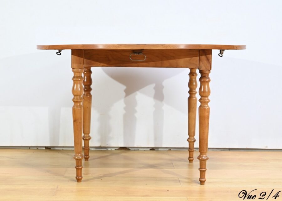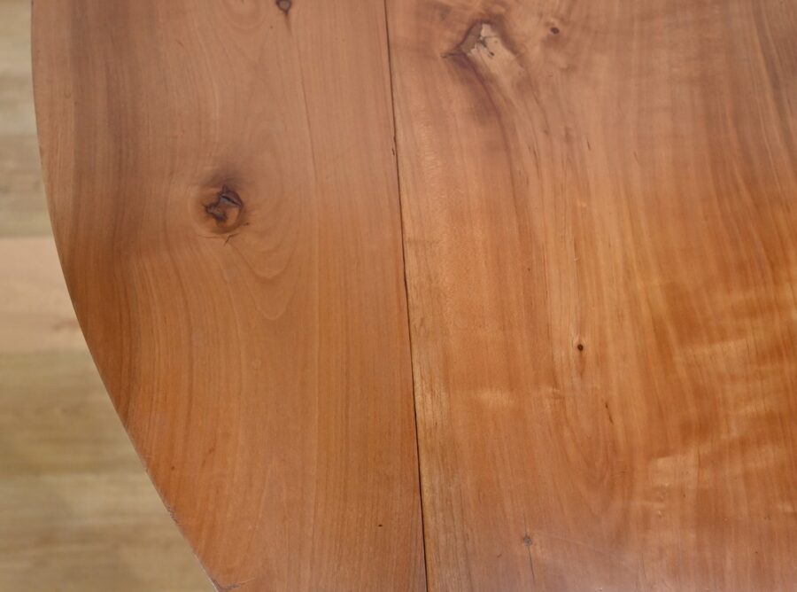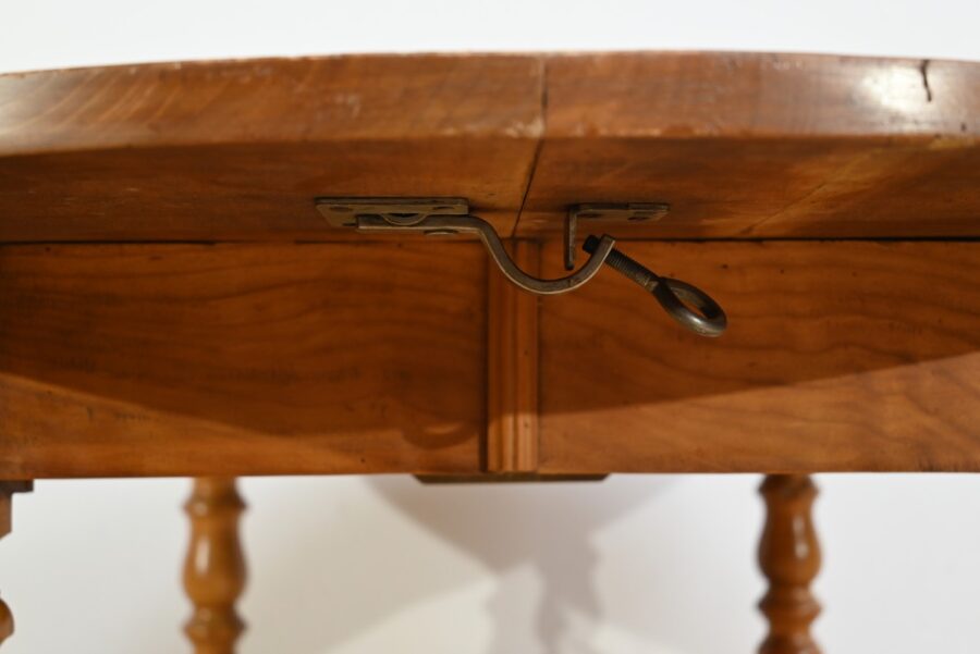 Cette table légèrement ovale repose sur quatre pieds tournés à étranglement