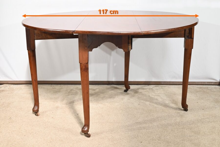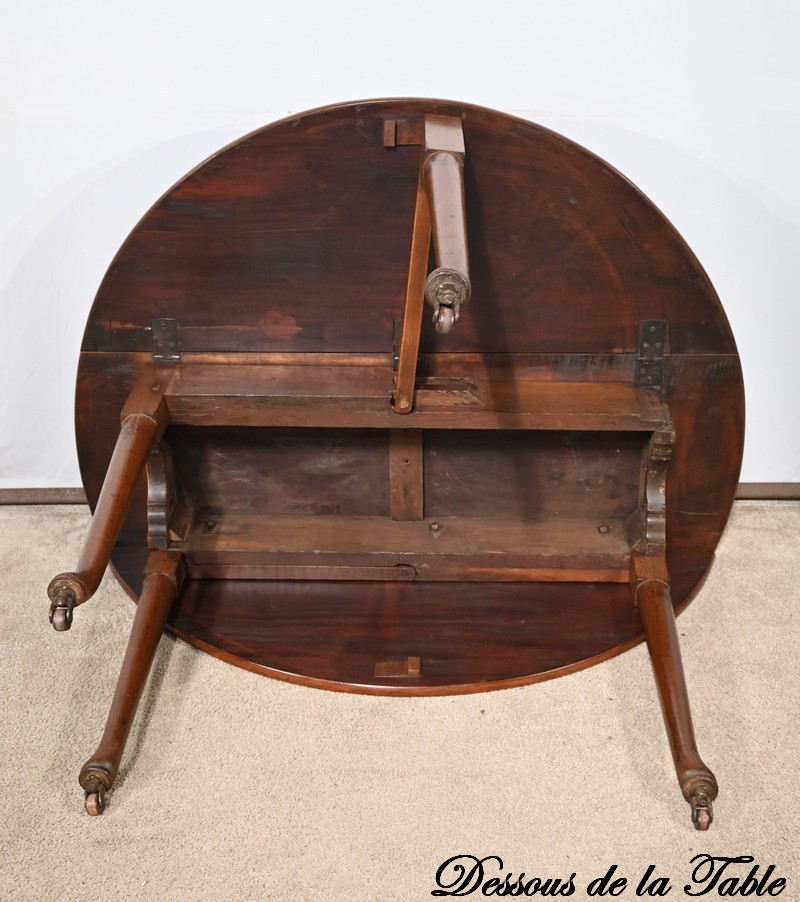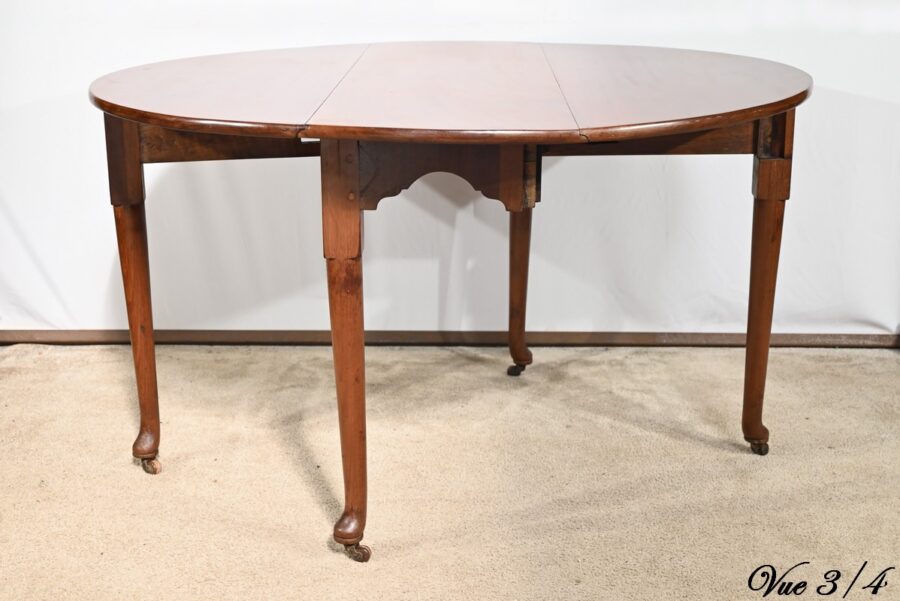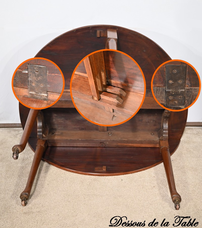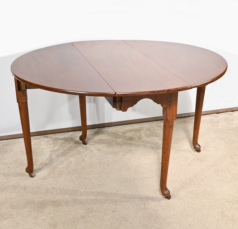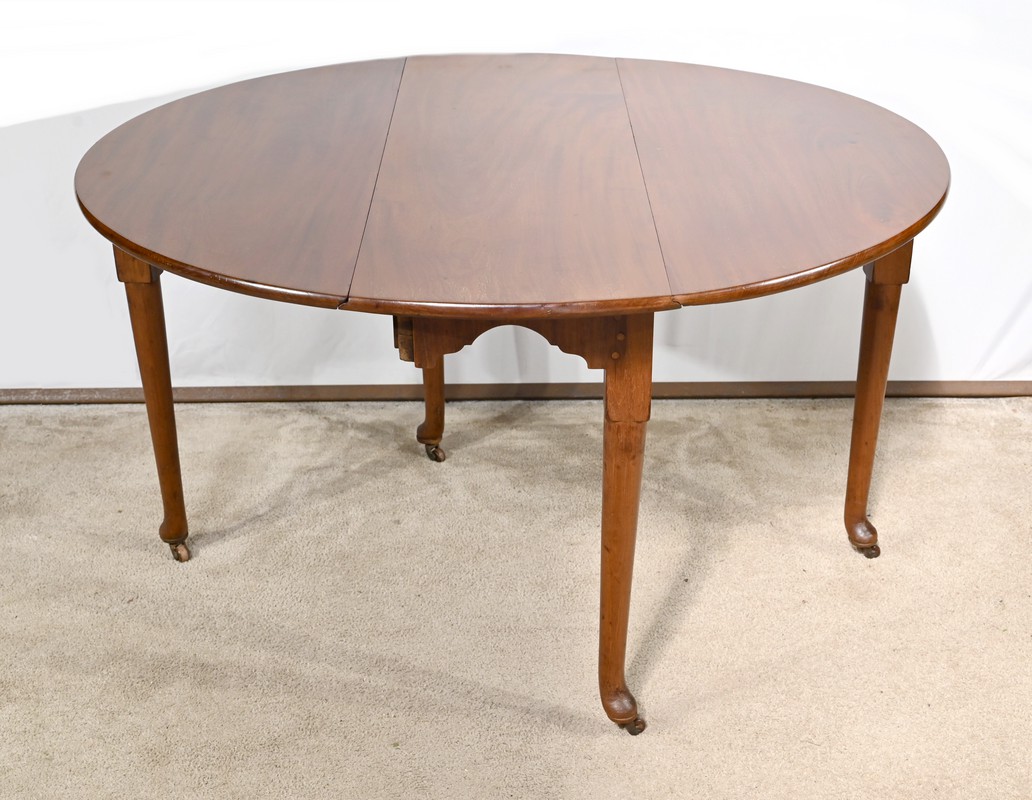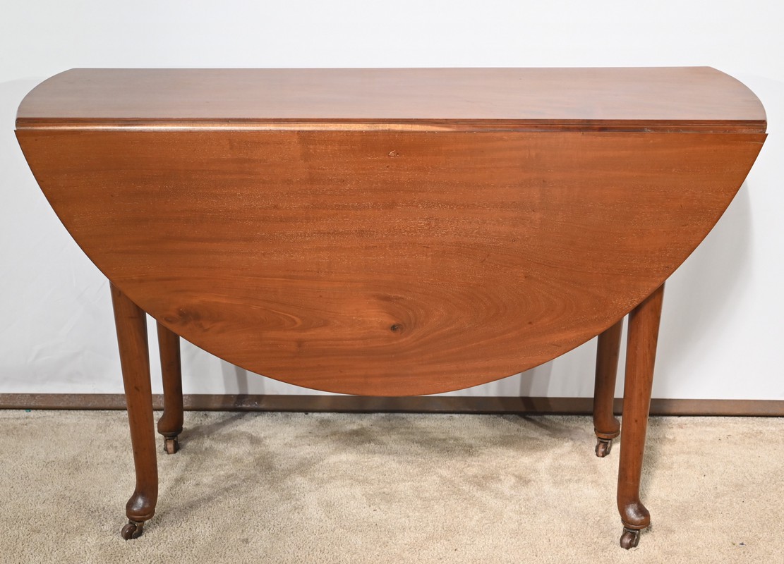 Cette table en acajou, de travail anglais et de forme légèrement ovale, comporte deux abattants soutenus par deux pieds rabattables.