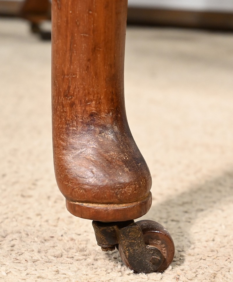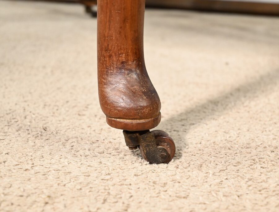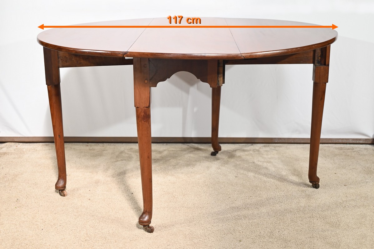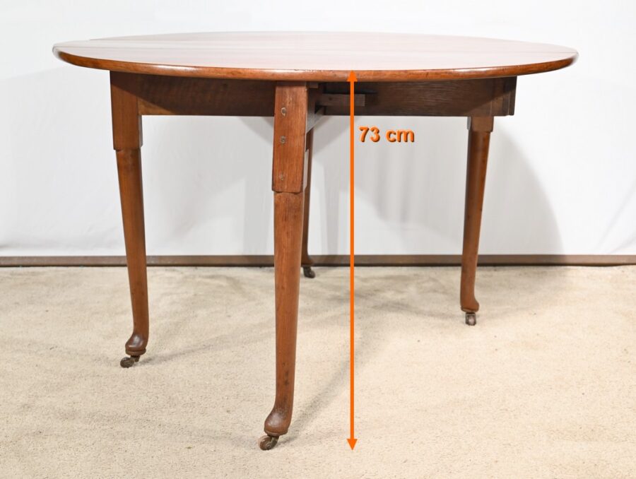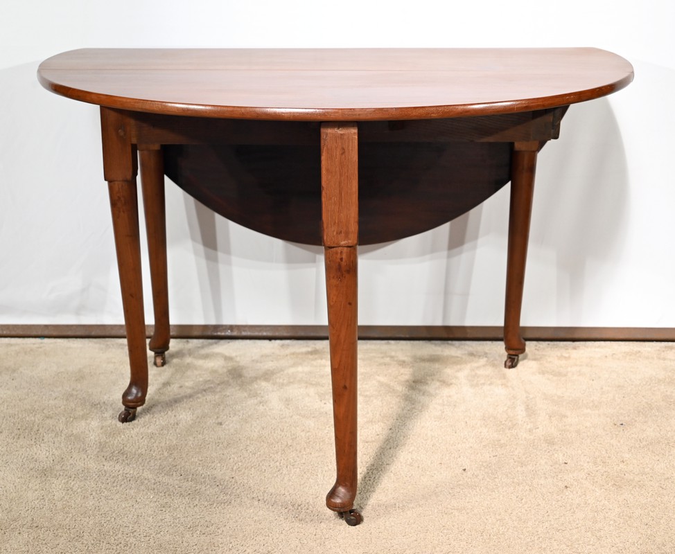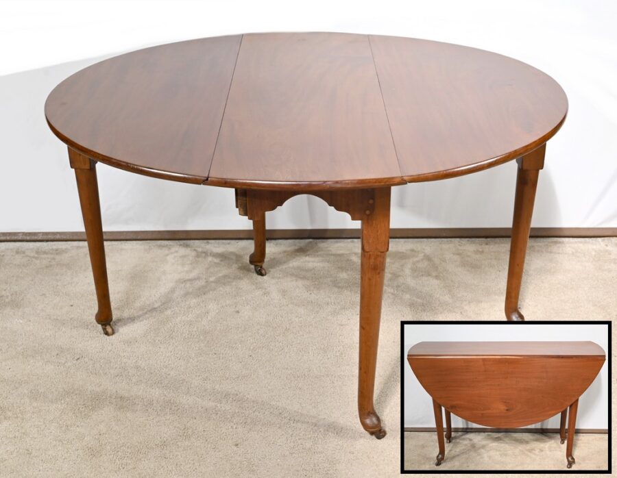 Cette table en acajou, de travail anglais et de forme légèrement ovale, comporte deux abattants soutenus par deux pieds rabattables.