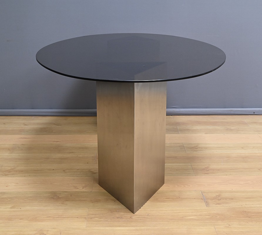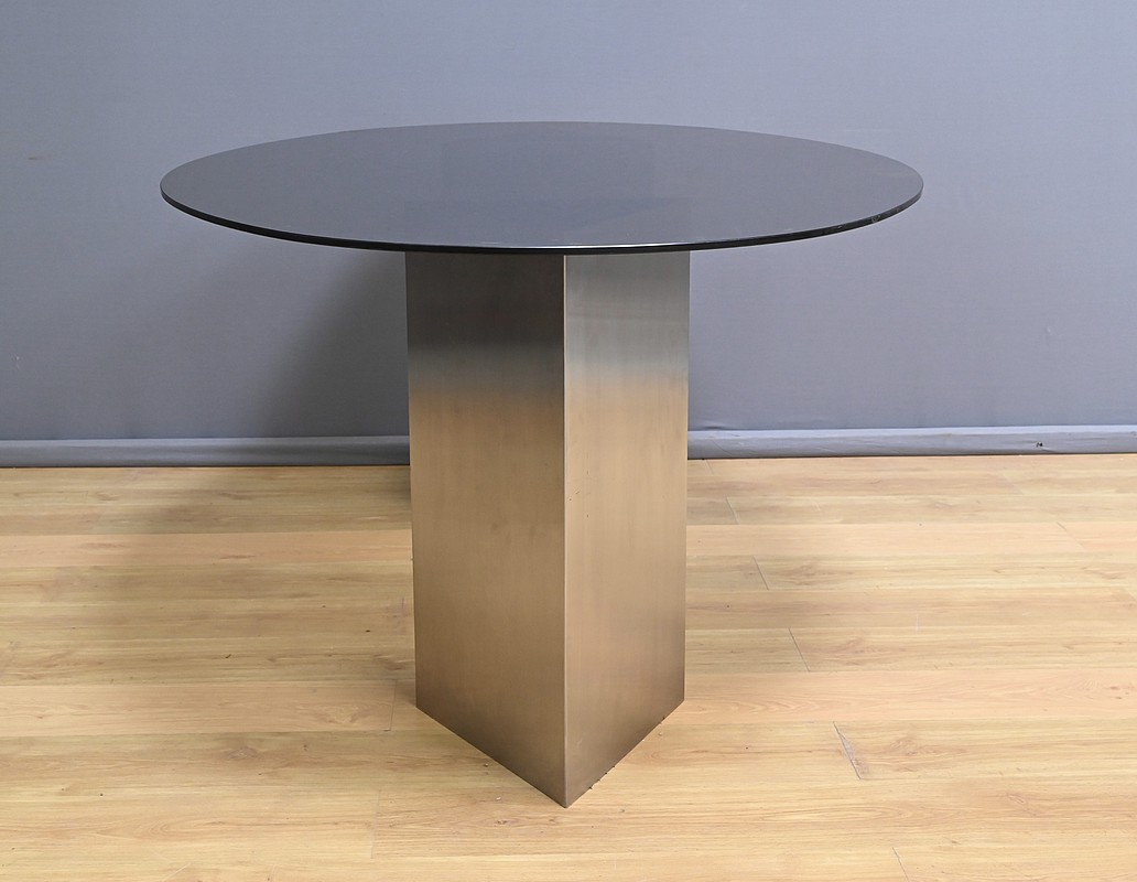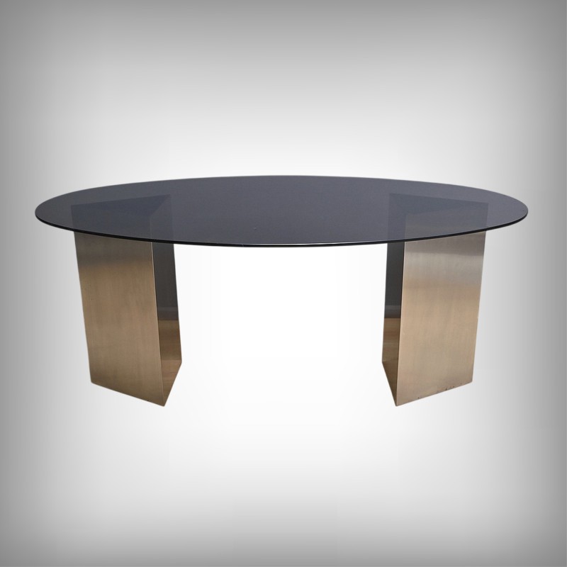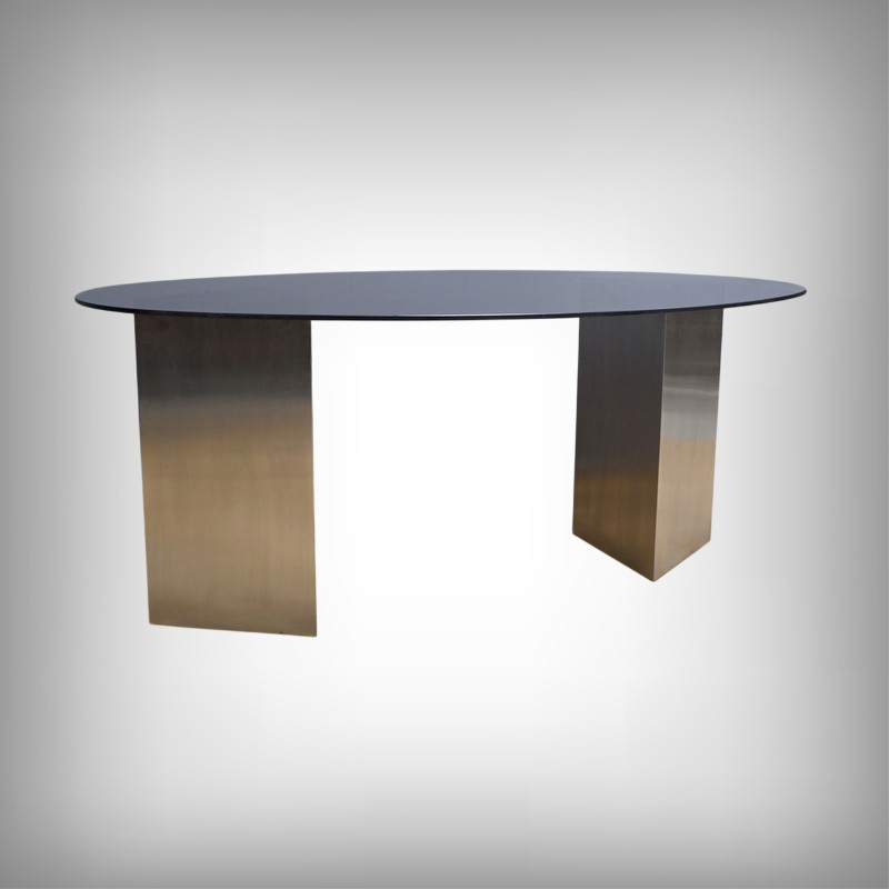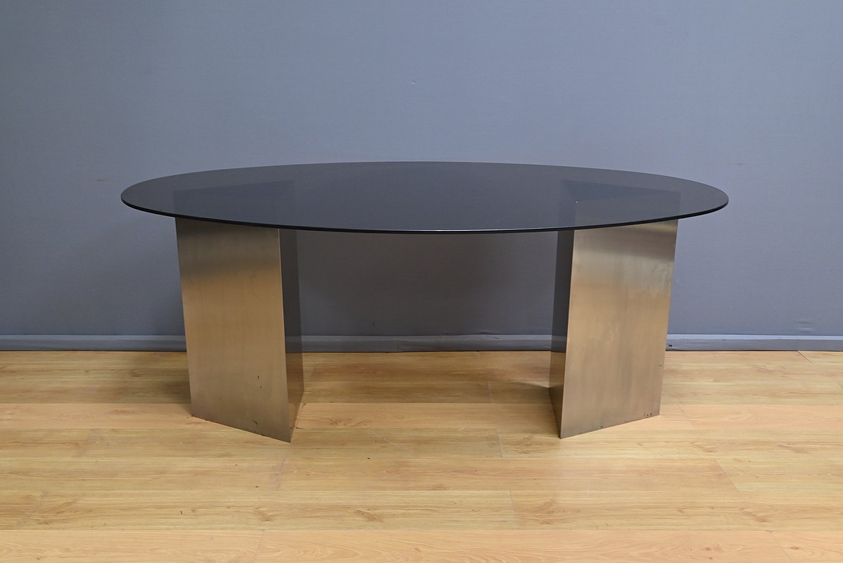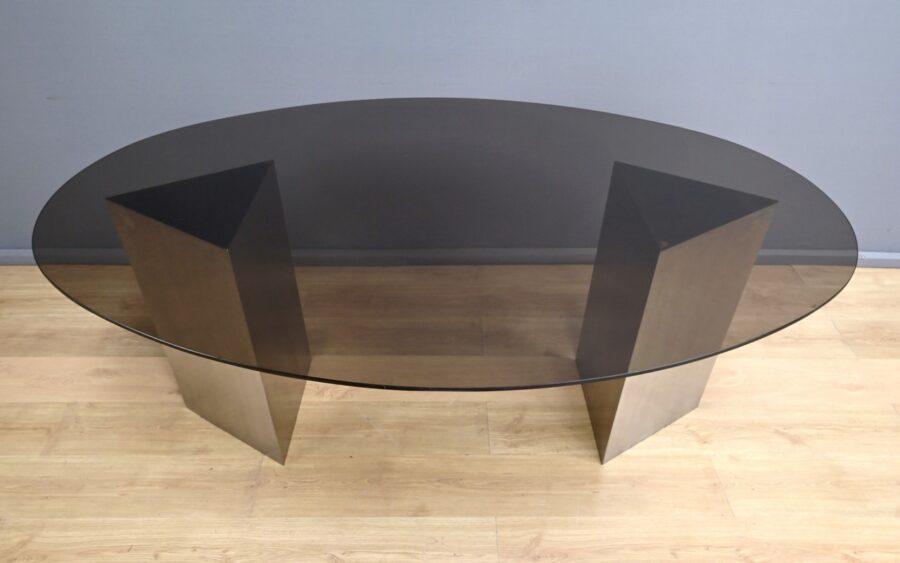 Offrez à votre intérieur une pièce emblématique du design des années 1960 avec cette table ovale en verre fumé gris. Son plateau nuancé apporte une touche de mystère et de raffinement, tandis que ses pieds en forme de prisme triangulaire, réalisés en acier brossé, confèrent une stabilité impeccable et une allure résolument sophistiquée. Pensée pour accueillir jusqu’à six personnes, cette table combine à merveille rétro et modernité. Son style intemporel s’harmonise aisément avec divers univers décoratifs, du vintage authentique au contemporain chic. Issue d’un salon des années 60, elle apporte une note nostalgique élégante à votre espace, tout en renforçant son attrait esthétique global.