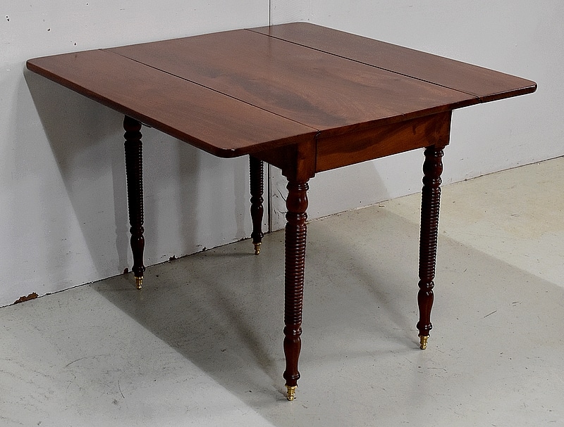 Table Rectangulaire Française, d’époque Louis-Philippe, appareillée d’un Système à Abattants. Caractéristique suffisamment Rare pour être soulignée, sa structure de Qualité est Intégralement conçue en Acajou de Cuba massif.