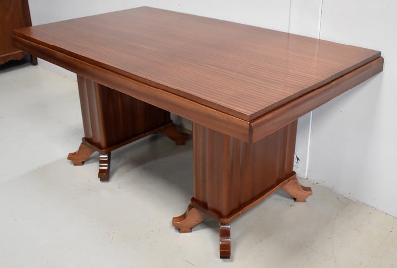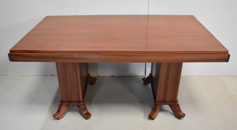 La ceinture de cette Table est en Acajou massif, tout comme les deux Blocs sur lesquels elle repose. Chacun de ces supports est lui même terminé par quatre pieds découpés. On notera la paradoxale alliance de ces Blocs de pieds Massifs inspirant la Robustesse, et de leurs lignes discrètement incurvées apportant de la Finesse à l’ensemble.
