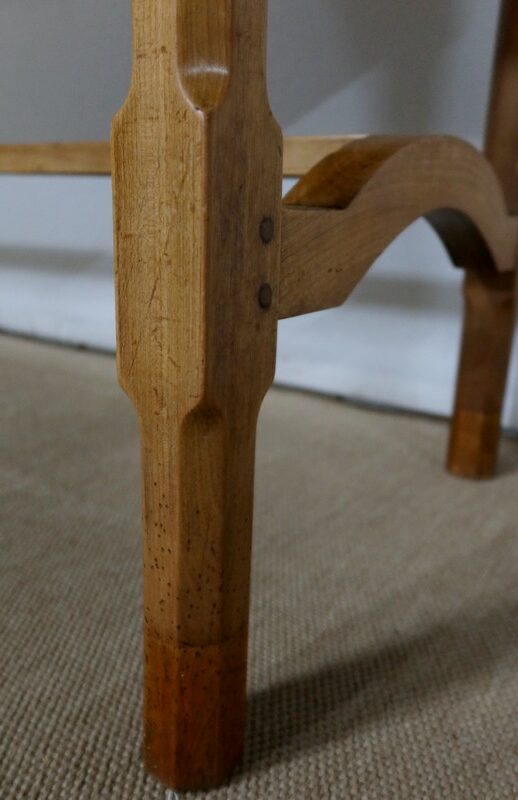 Cette table repose sur quatre pieds à section carrées chanfreinés sur plusieurs zones. Un élément de bois, légèrement en forme de chapeau de gendarme lie les 2 pieds entre eux : une barre à chat, particulièrement élégante avec sa hauteur permettant de disposer vos pieds en dessous, relie les deux côtés ensemble.