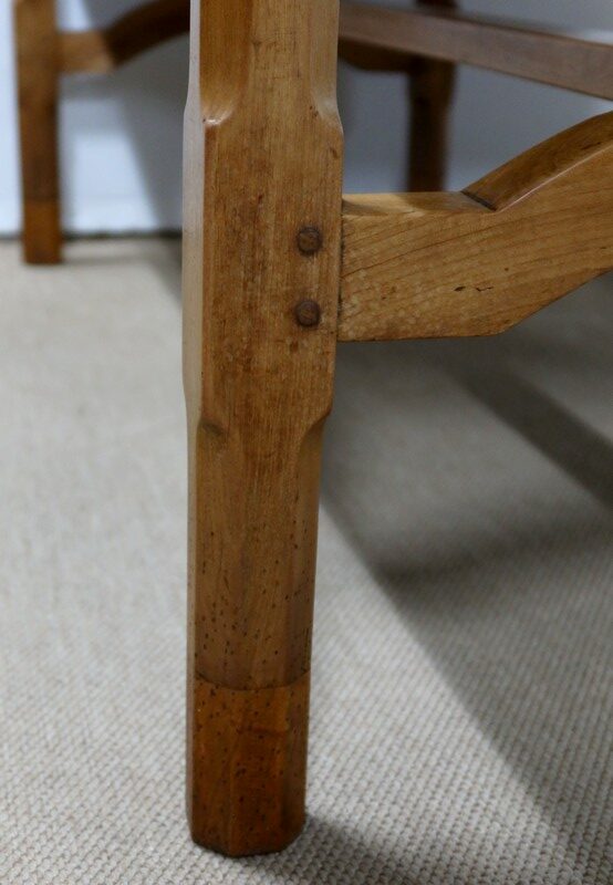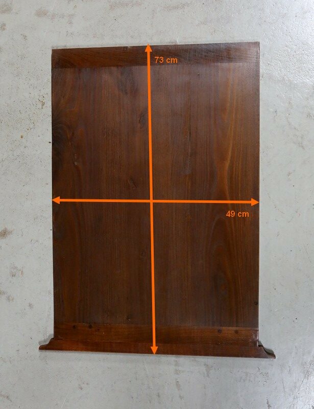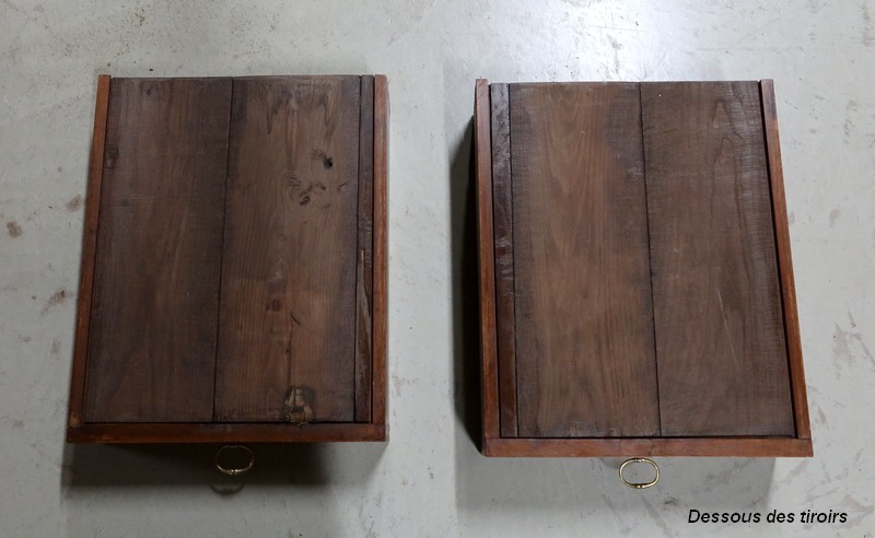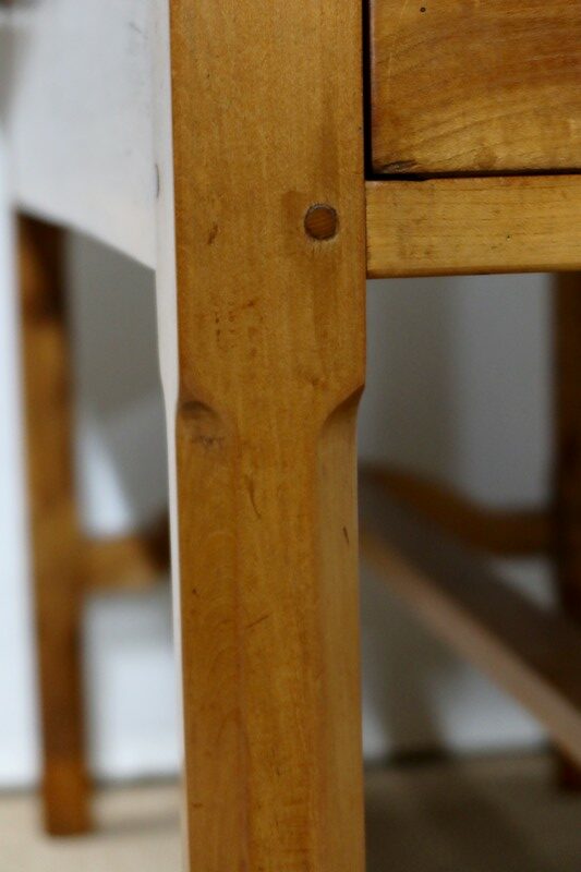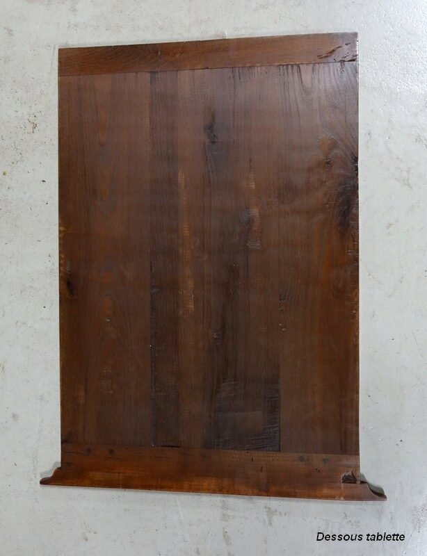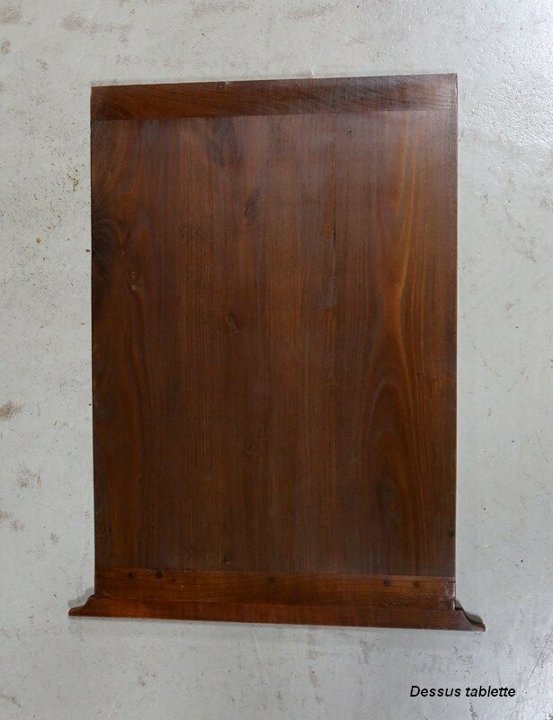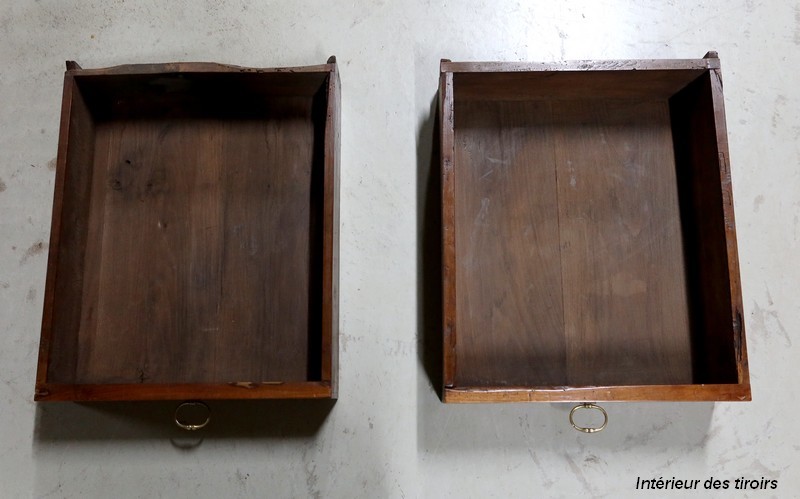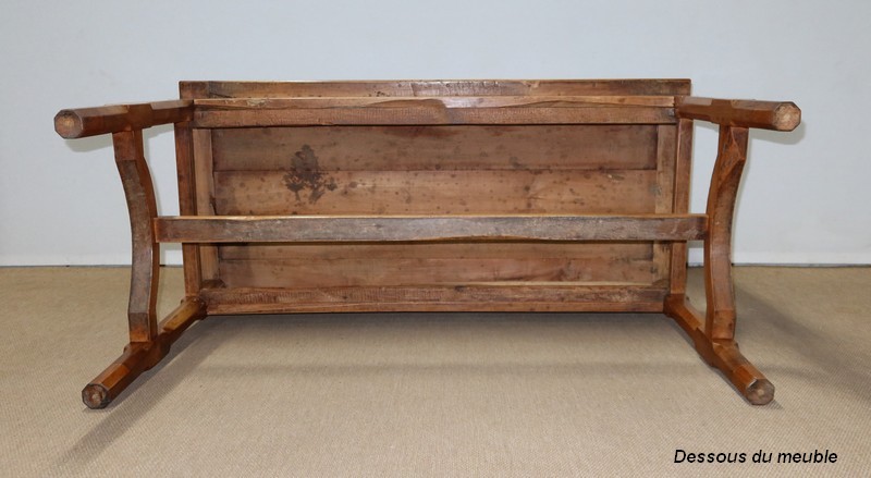 Son dessus se compose de 5 parties de bois chevillées avec emboîtures aux extrémités : à noter que ces joints sont parfaitement exécutés, sans ajout d’élément de bois ou de pâte synthétique. De chaque côté, deux tiroirs viennent aménager ce bien en ceinture, chacun munit d’une poignée de tirage à boucle en laiton : l’un est surmonté d’une tablette dite « à pain », et mesure 12 cm de hauteur, tandis que l’autre affiche 14 cm.