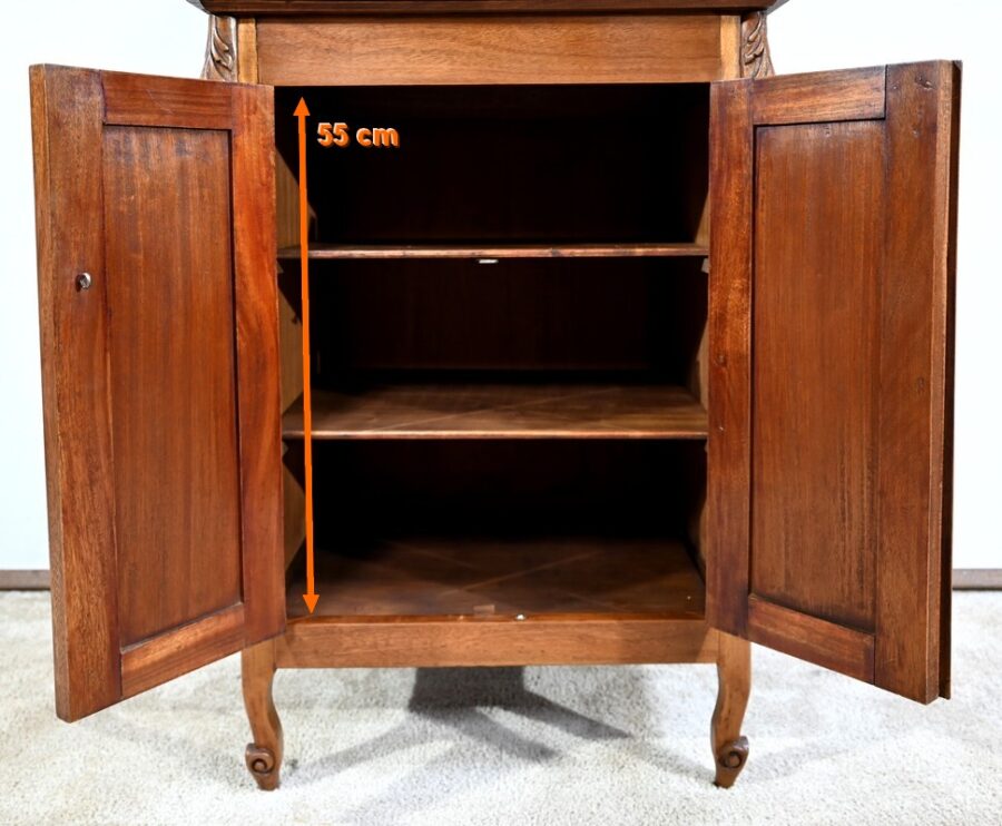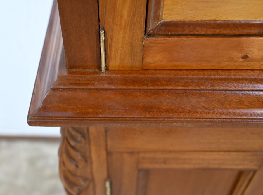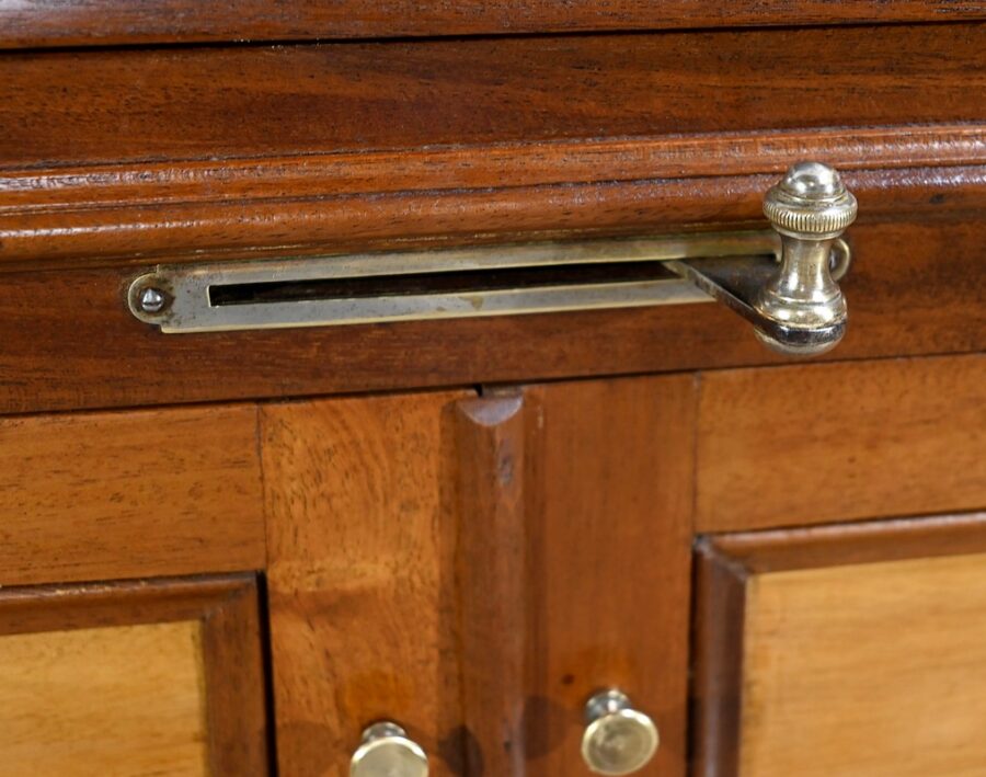 Ce meuble toutes faces, en acajou massif, ouvre par deux portes à boutons bronze, à cadres moulurés. Ces portes sont montées sur charnières laiton et foncées, chacune, d’un panneau central.