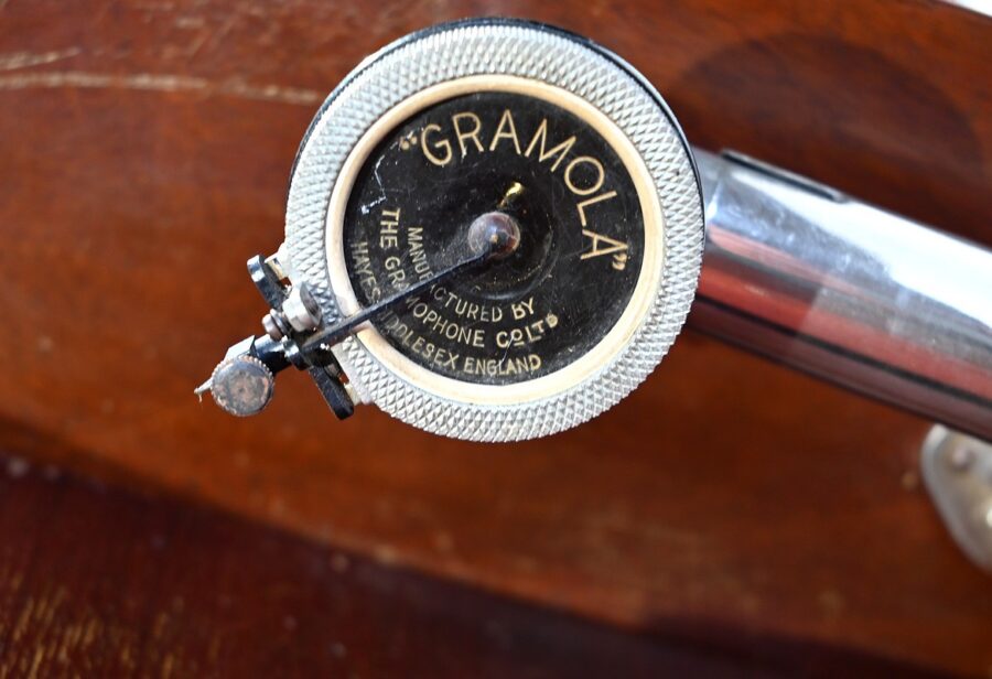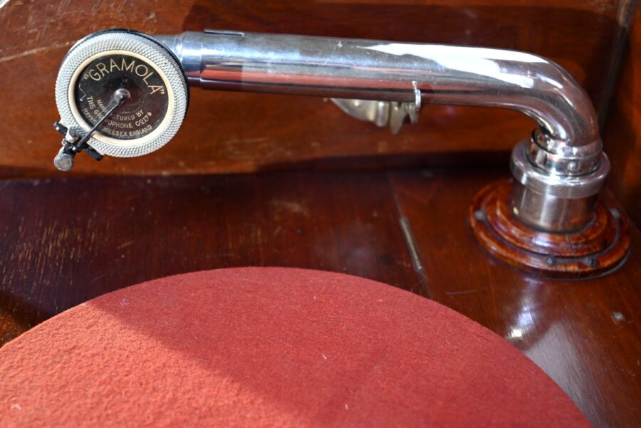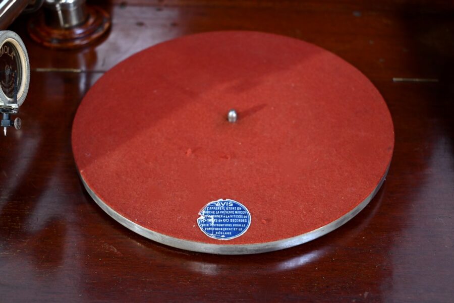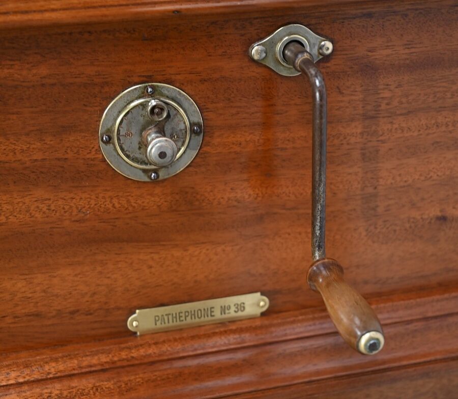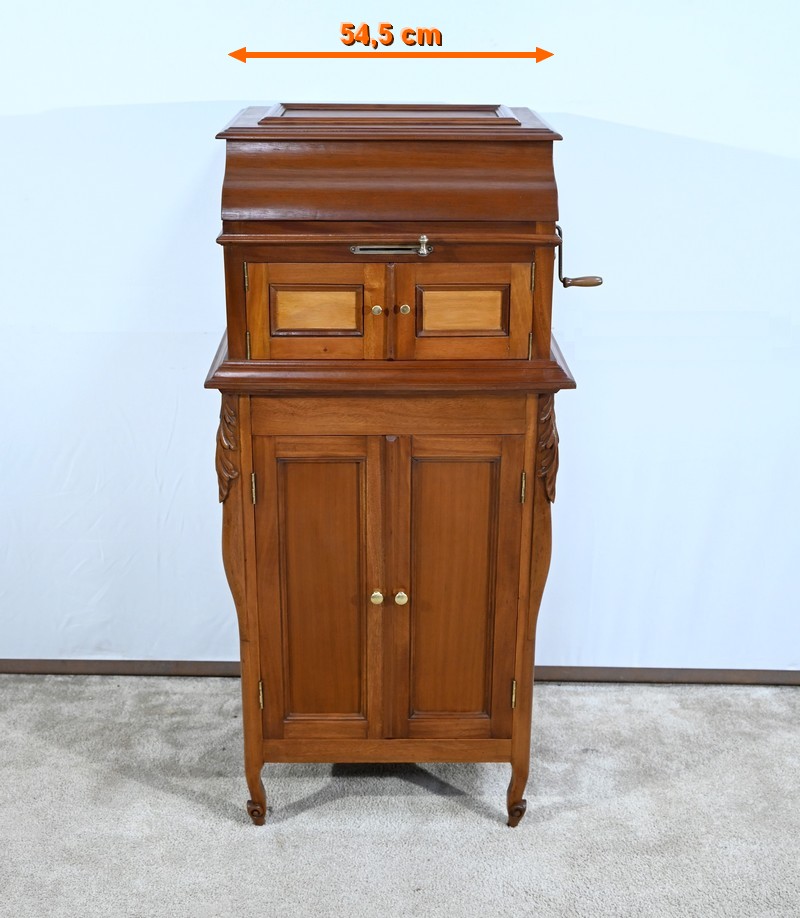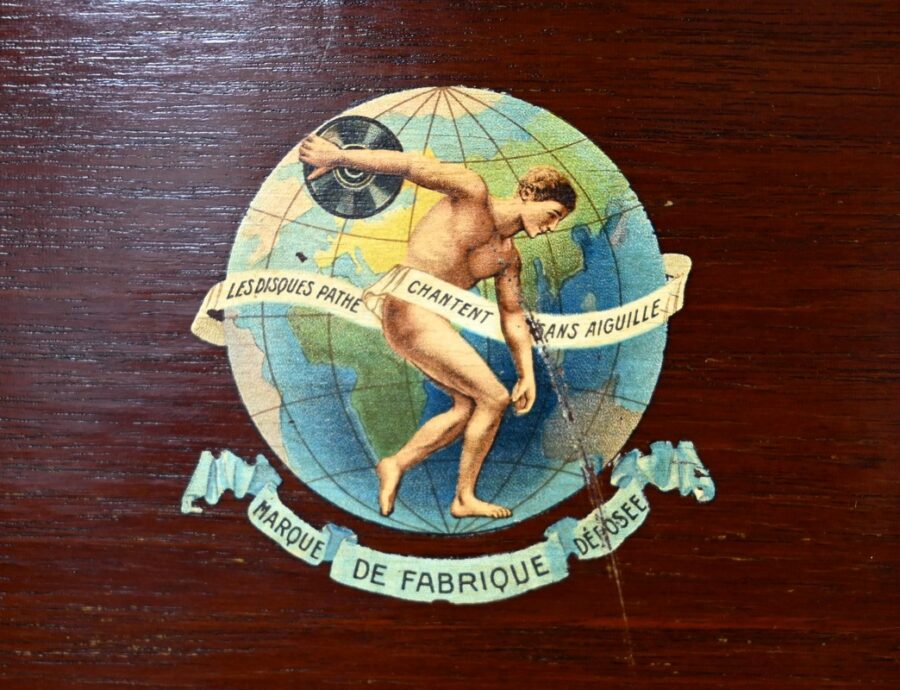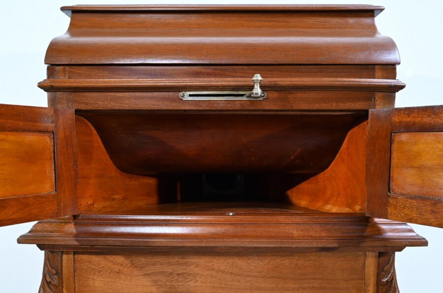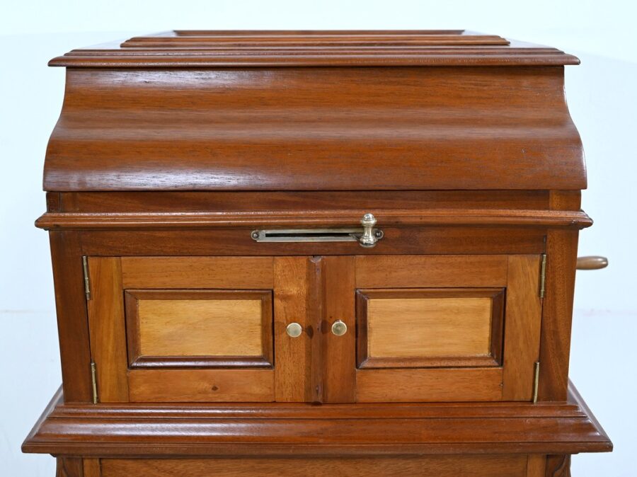 Séparée par une importante moulure intermédiaire, la partie supérieure de ce meuble présente le gramophone n°36 de la marque Française Pathé.