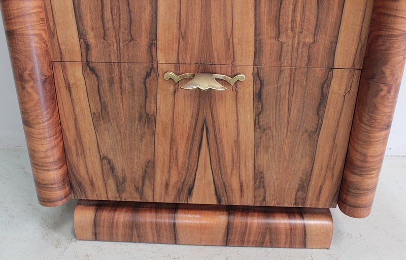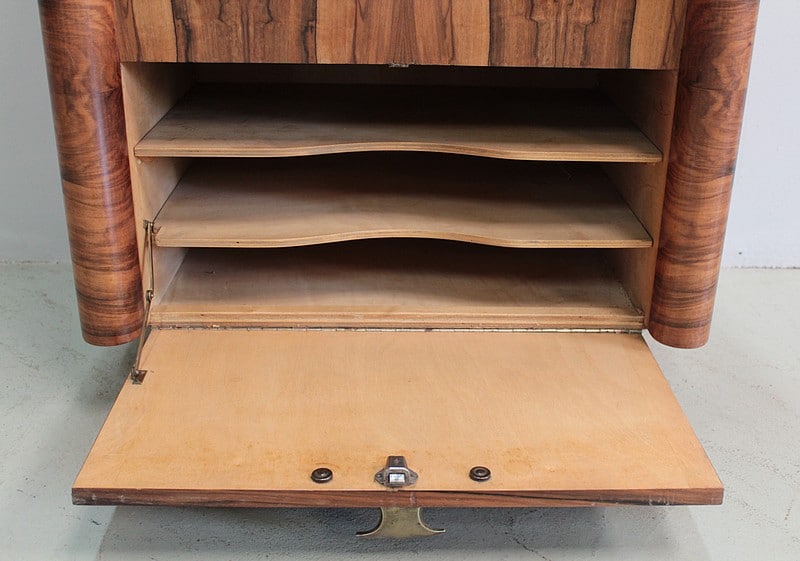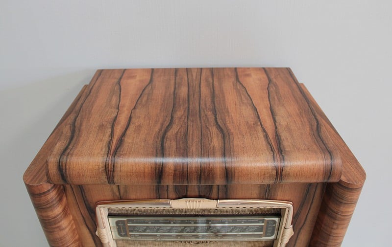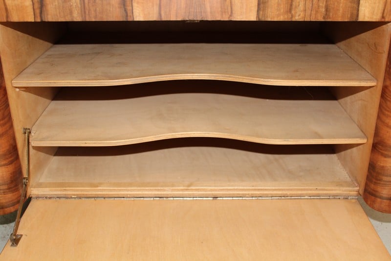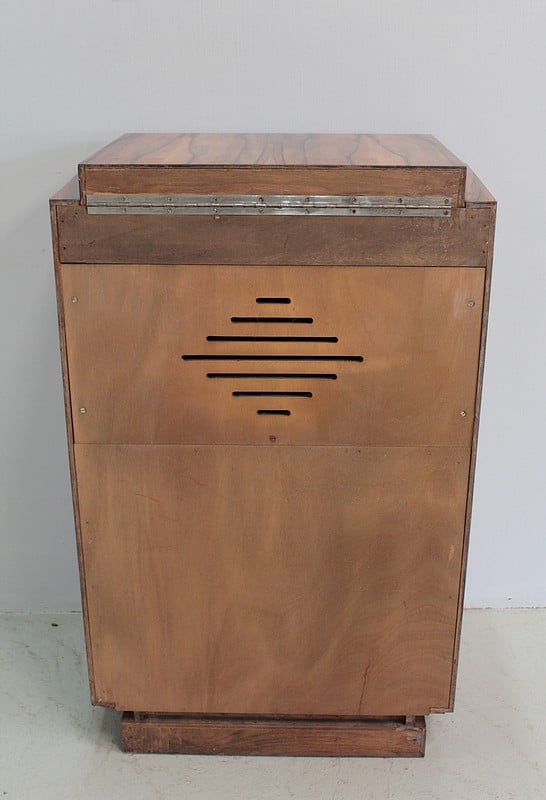 Meuble-radio Art-Déco en placage de noyer avec incrustation de bois exotique encadré de filets de citronnier.