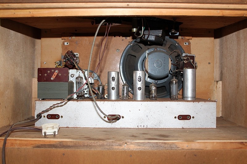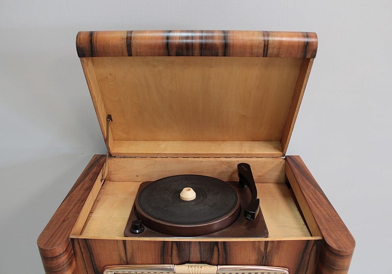 Il ouvre par le dessus sur un tourne-disques et en partie basse par une porte basculante découvrant deux compartiments à disques.