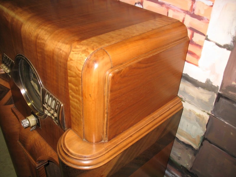 Bois en parfait état. Décapage du verni et finition cirée. Radio en l’état.