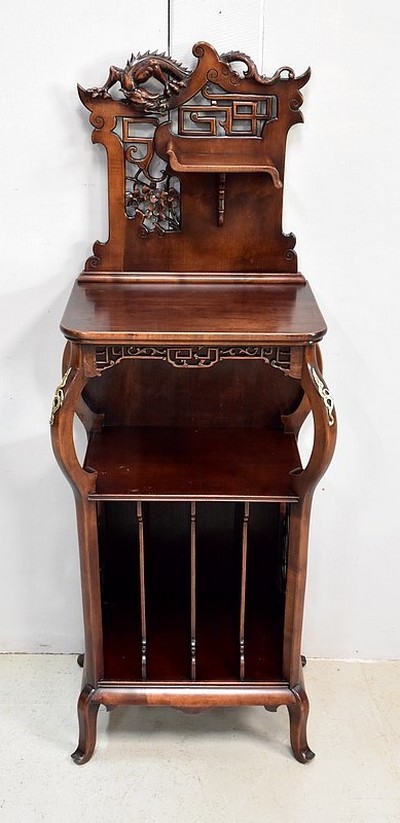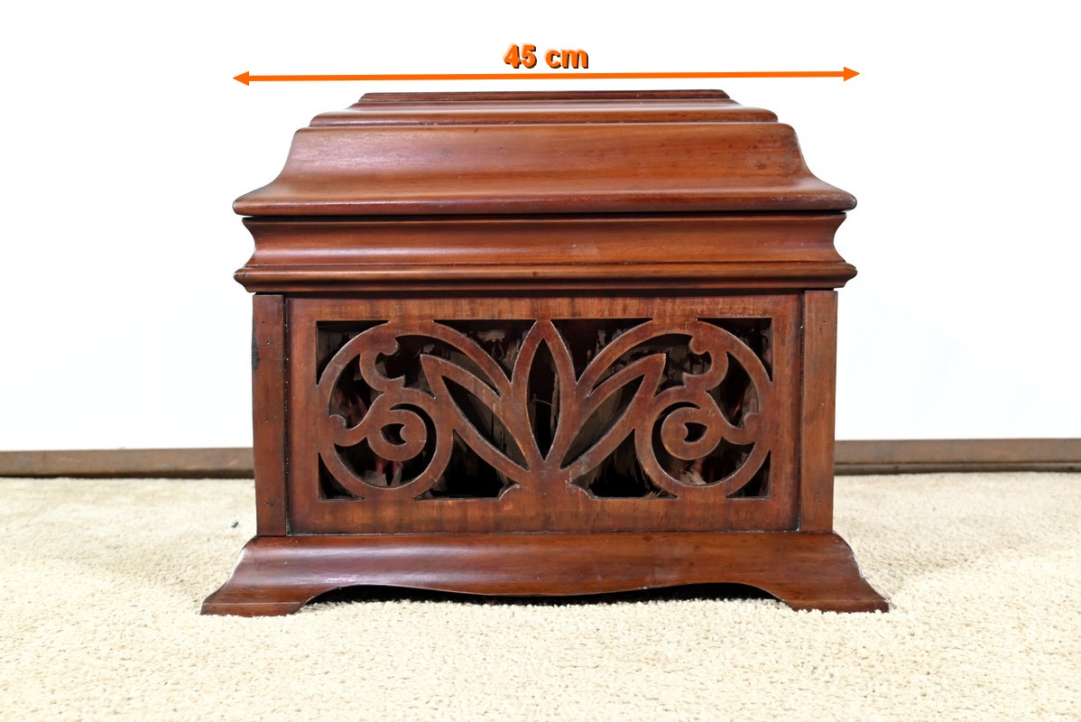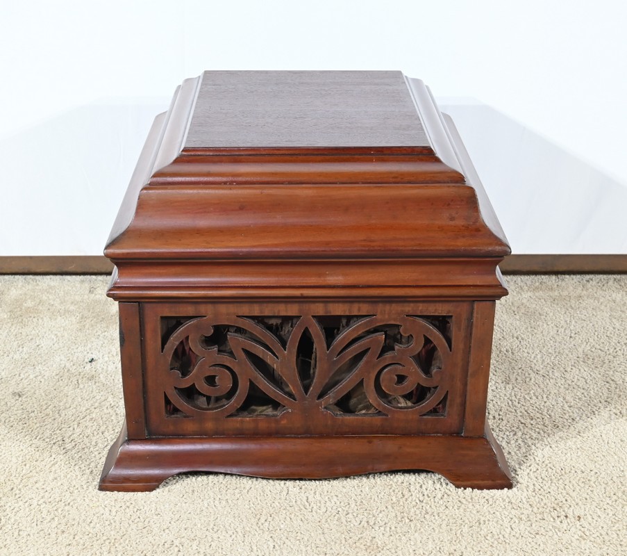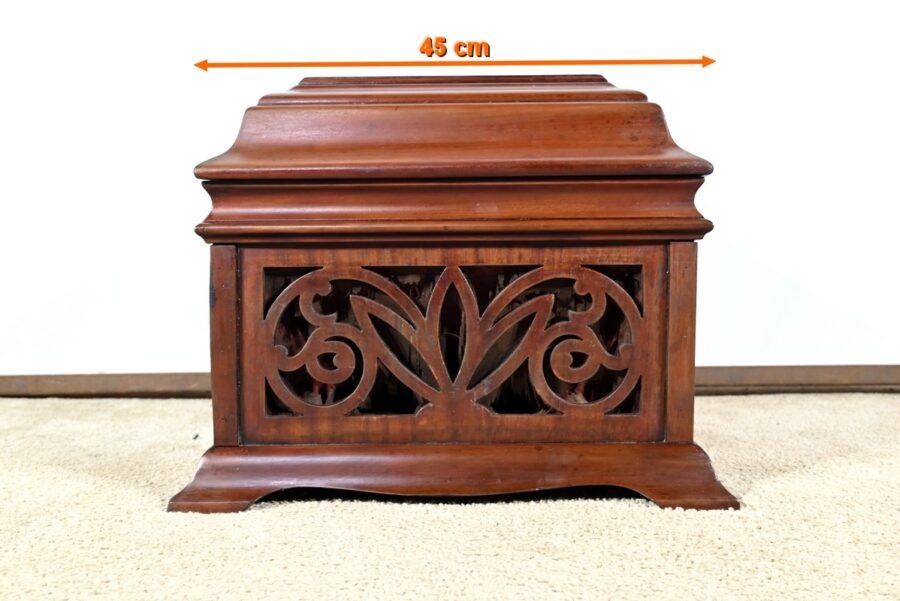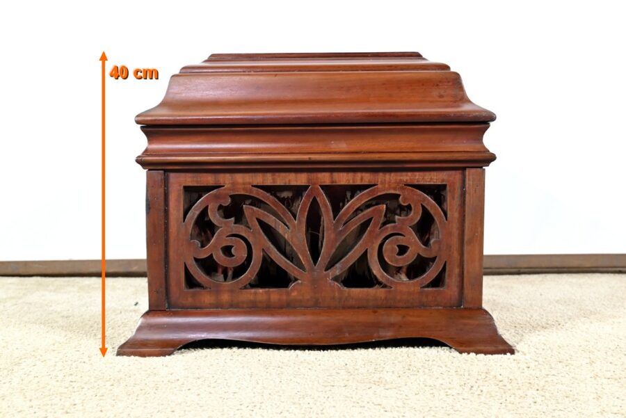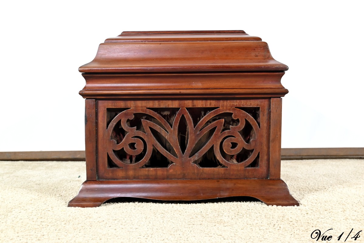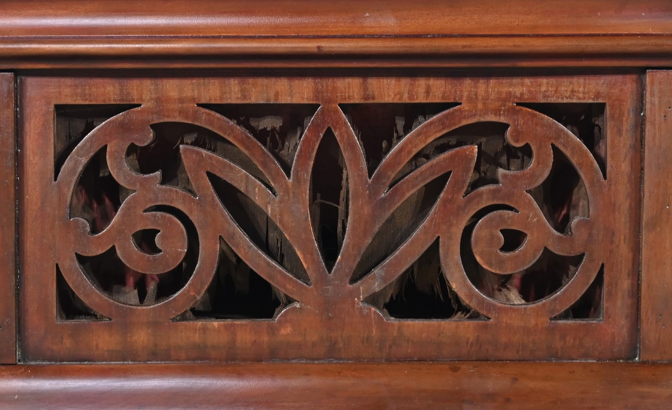 Le coffre de résonance à décors de volutes et de feuilles est ajouré en façade.