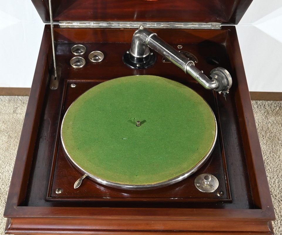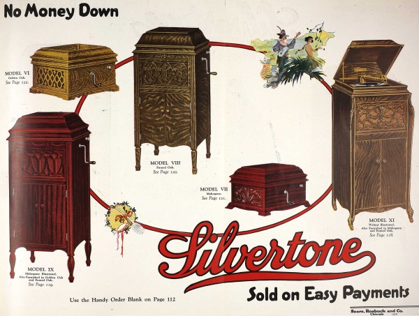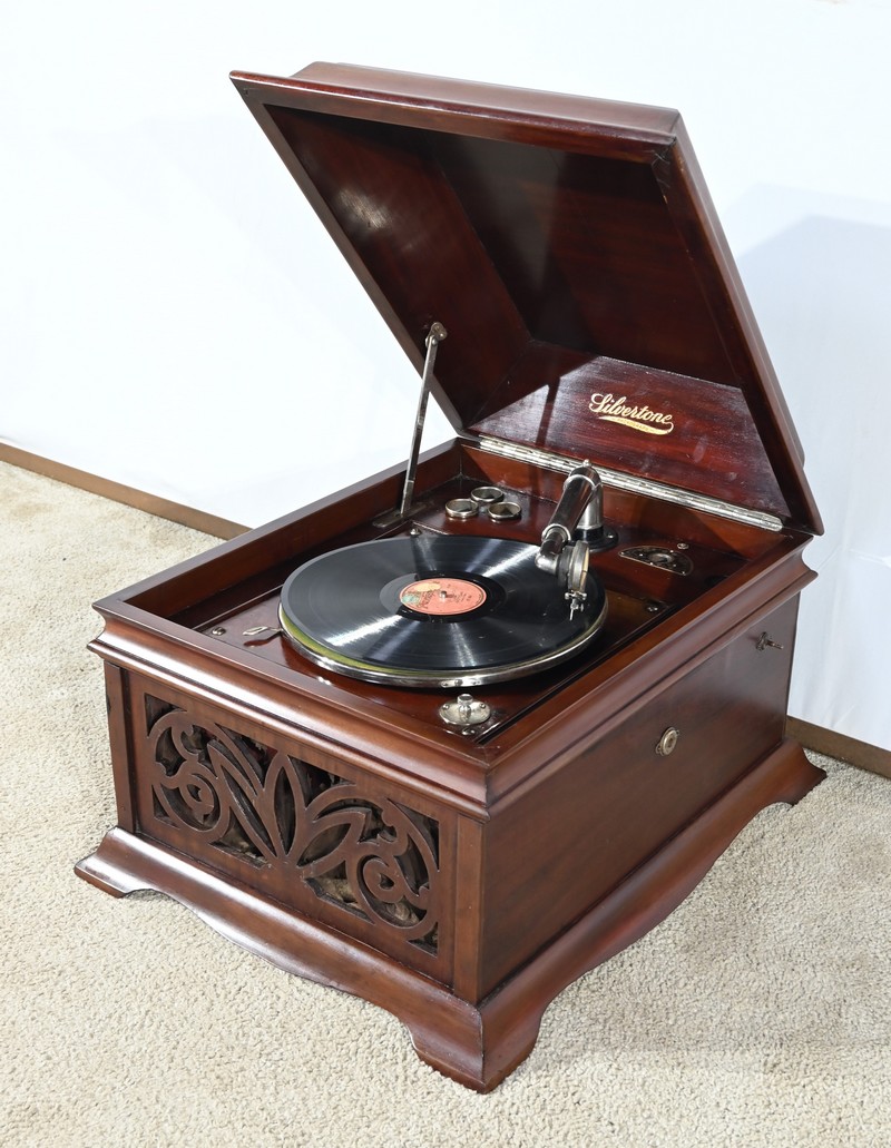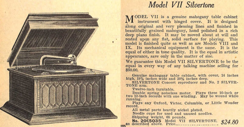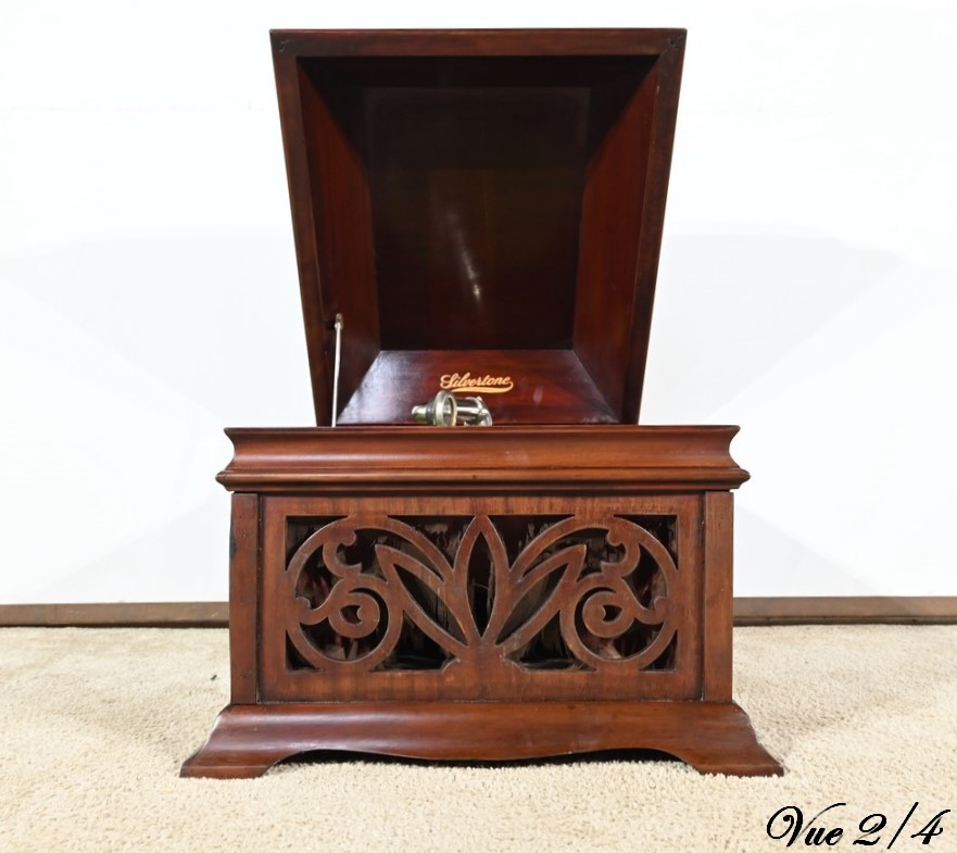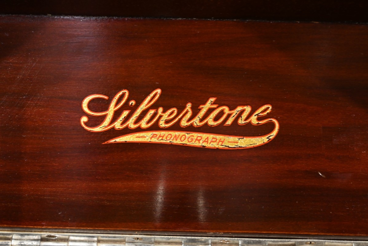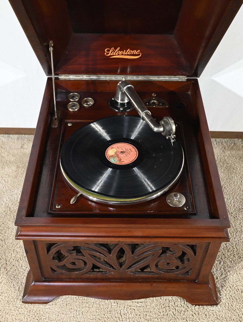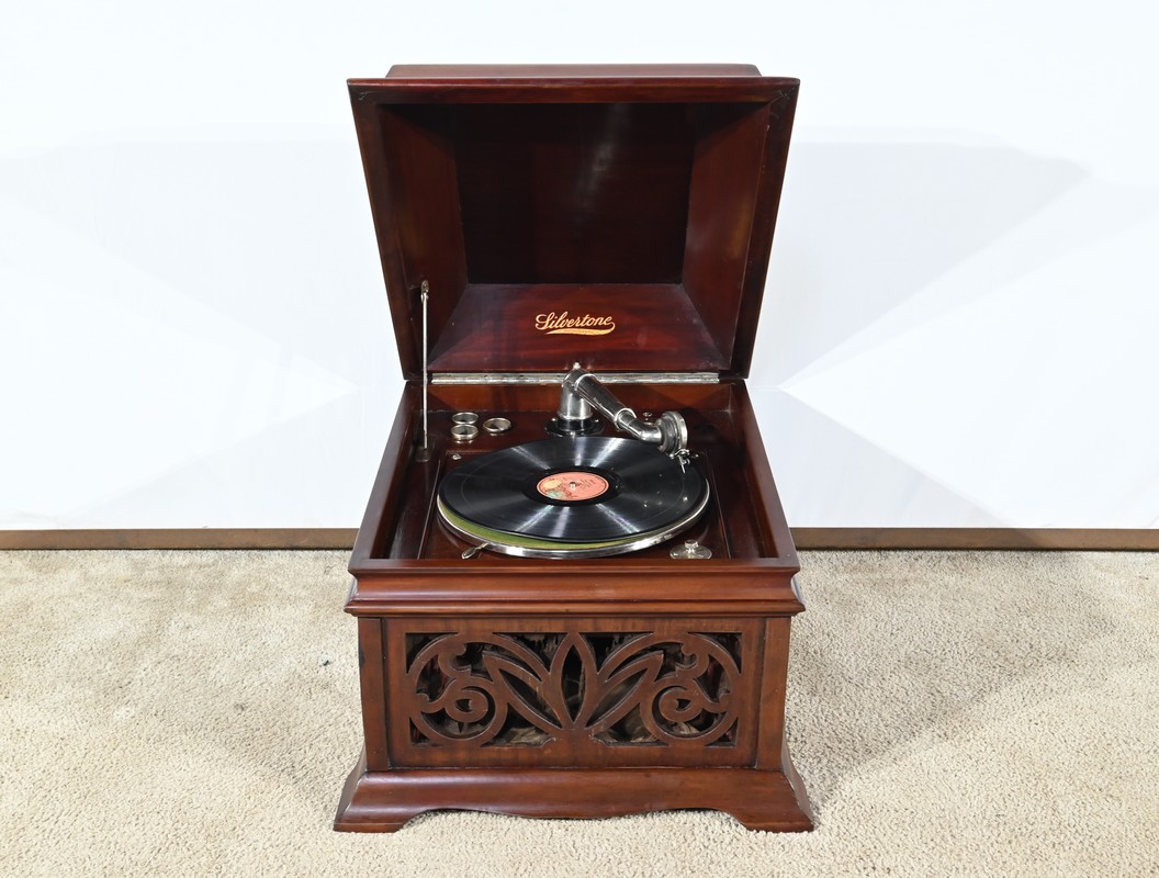 Présent dans le catalogue annuel de l’année 1920 de l’entreprise américaine Silvertone ce phonographe présente un abattant, à diverses moulures, monté sur compas.