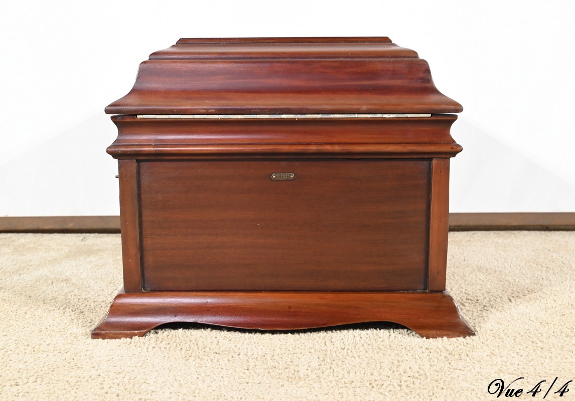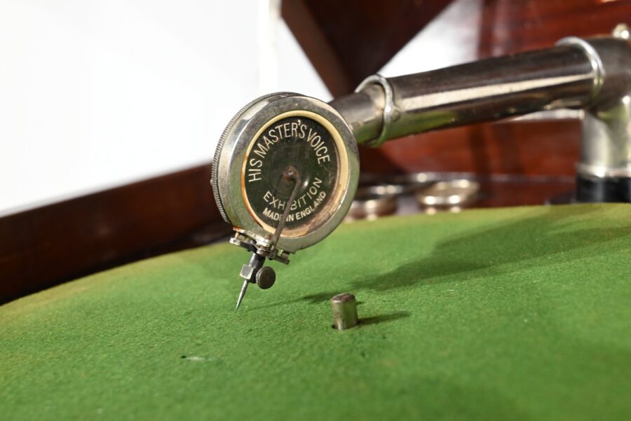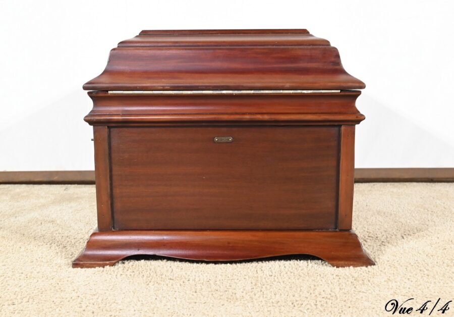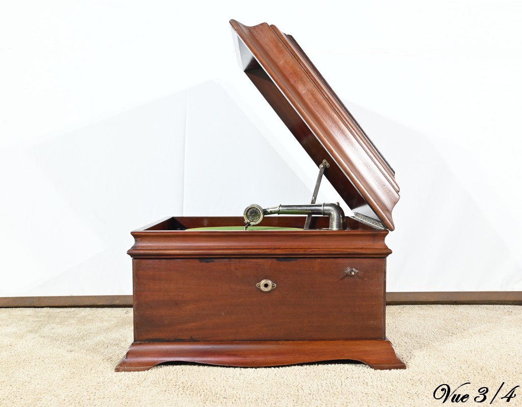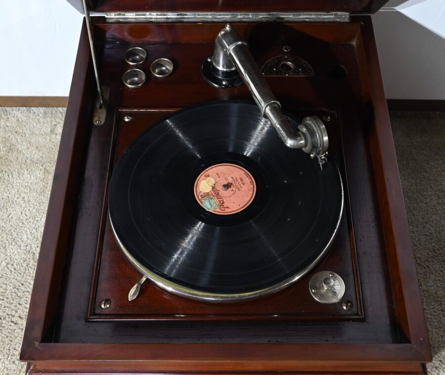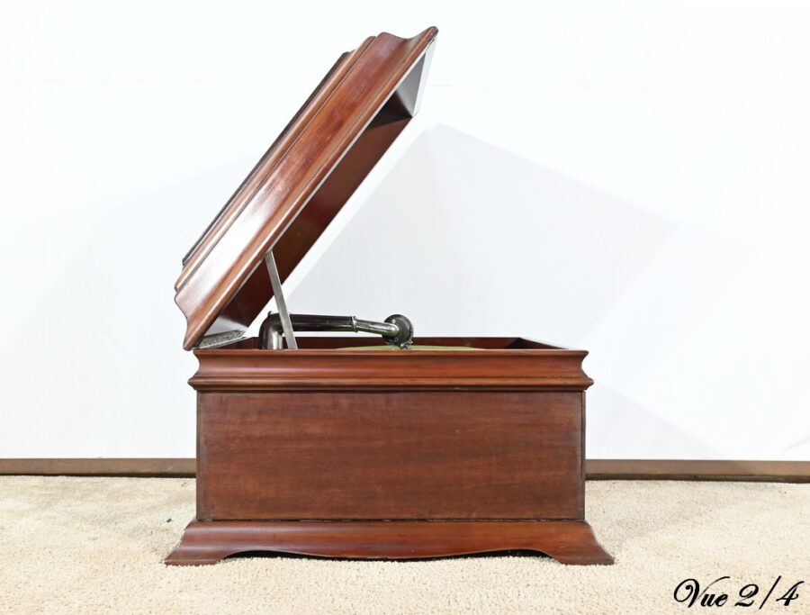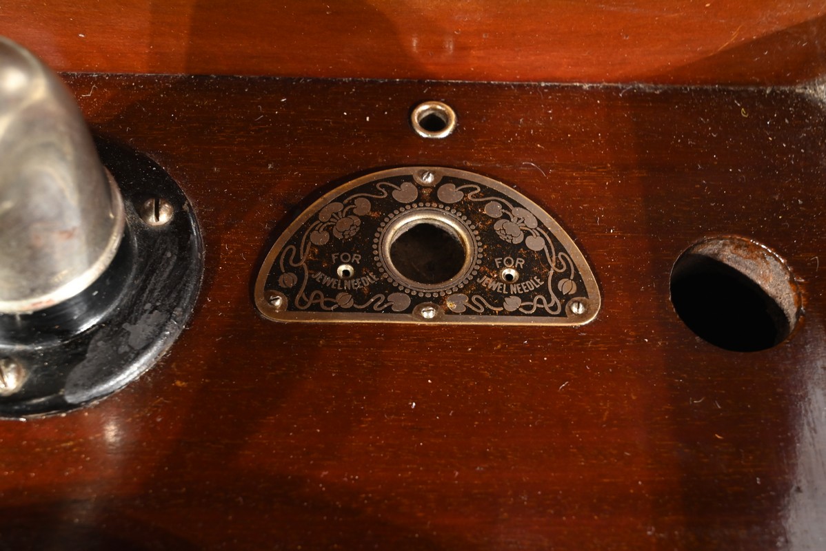 Présent dans le catalogue annuel de l’année 1920 de l’entreprise américaine Silvertone ce phonographe présente un abattant, à diverses moulures, monté sur compas.