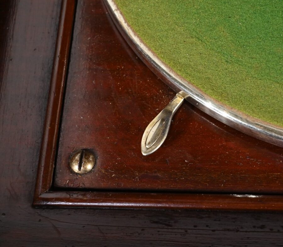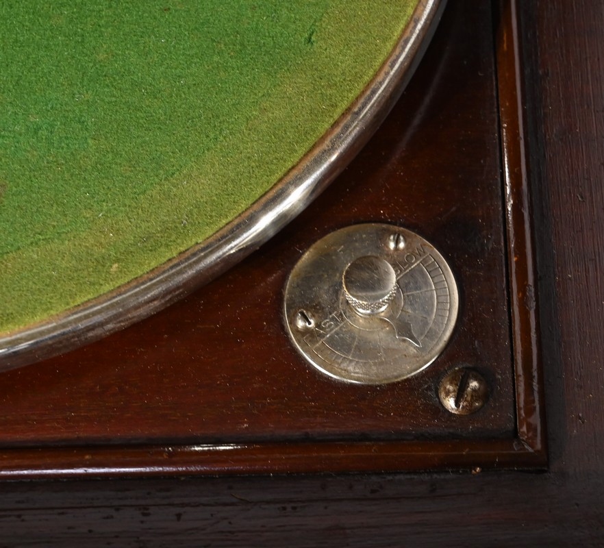 Ouvert, ce phonographe présente une platine 78 tours, habillée d’une feutrine verte, équipée d’un bras Silvertone avec tête à aiguille et d’un régulateur de vitesse.