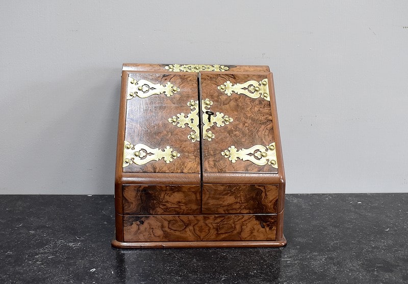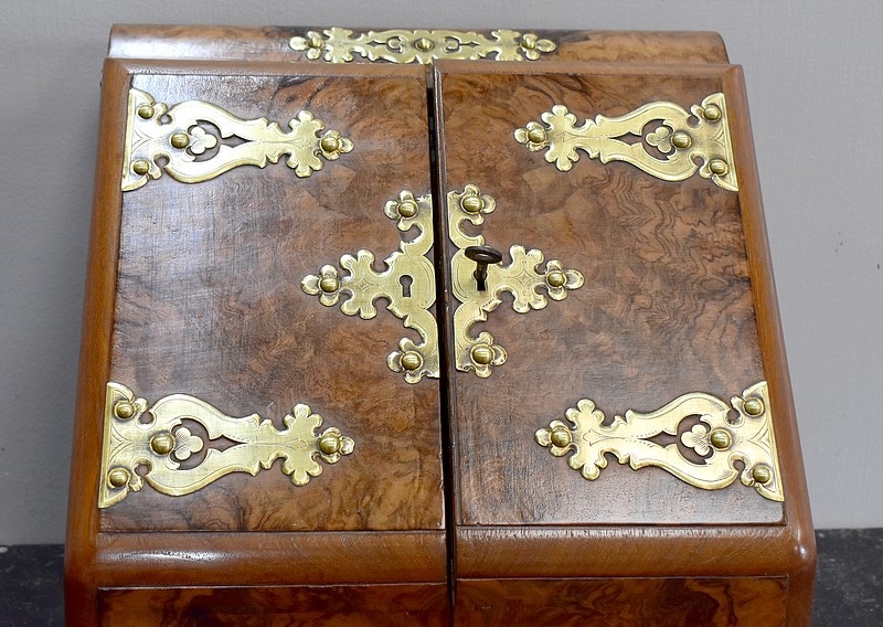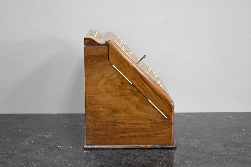 Classeur à courrier en placage de ronce et loupe de Noyer et orné de laiton découpé et ciselé.