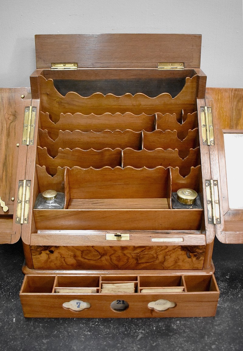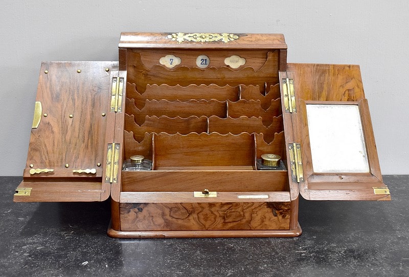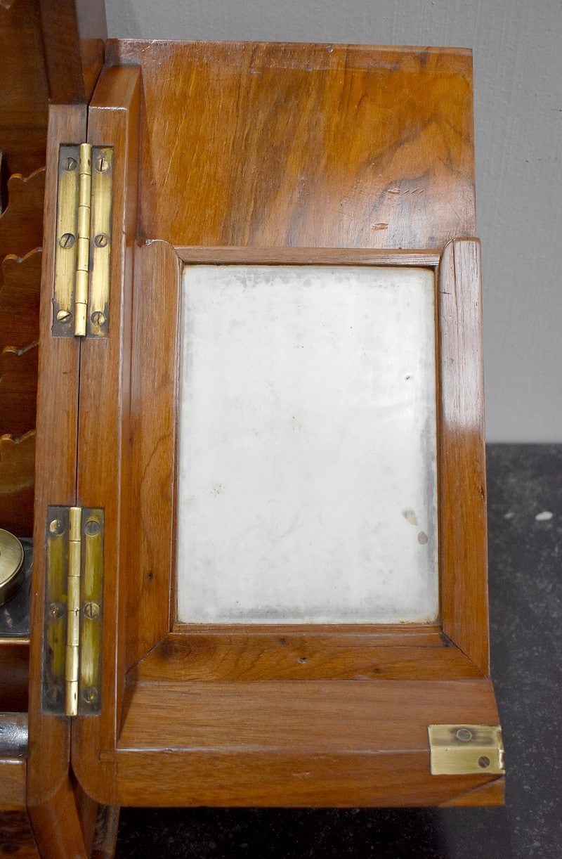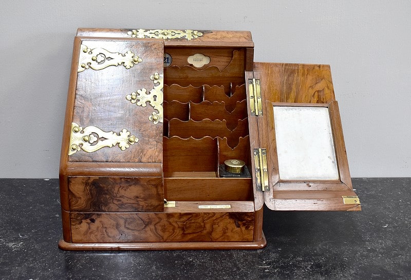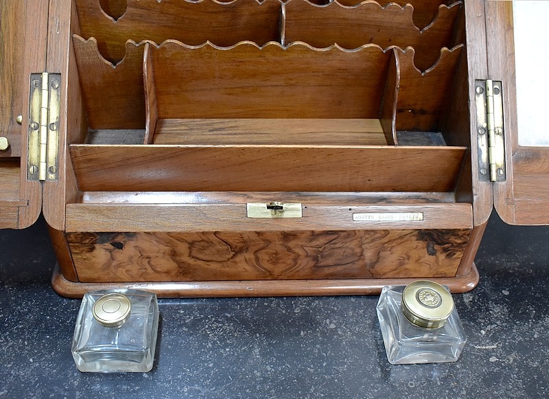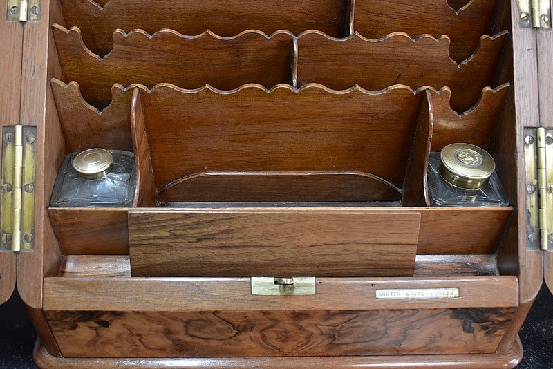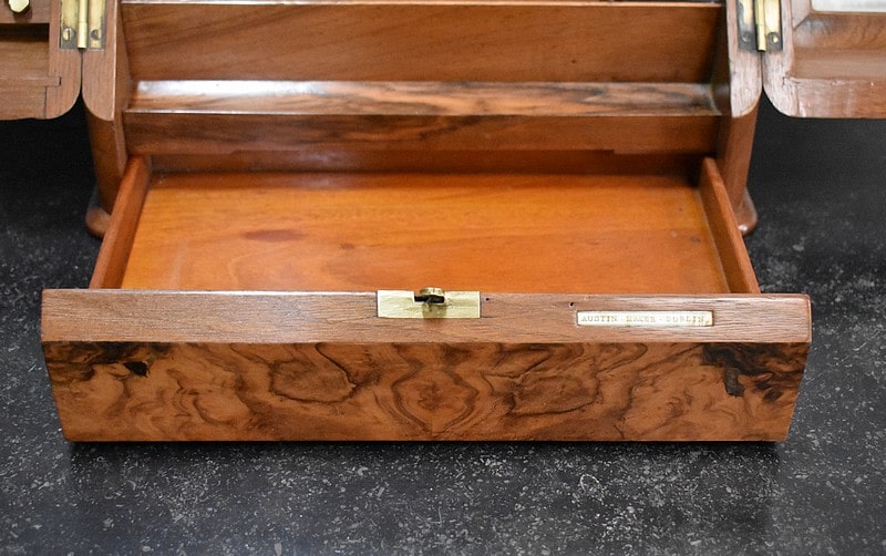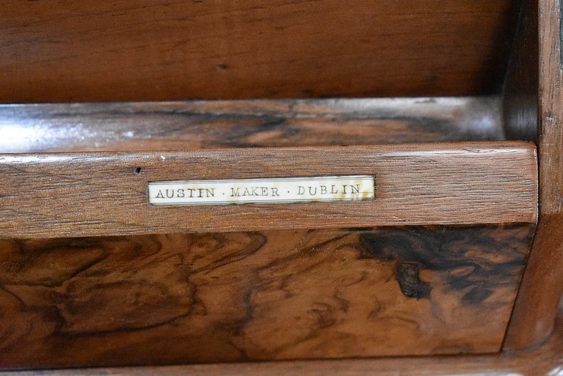 Il dispose en partie basse de 2 encriers ainsi qu’un repose-plume et ouvre en dessous, par un tiroir signé ‘AUSTIN . MAKER . DUBLIN’.