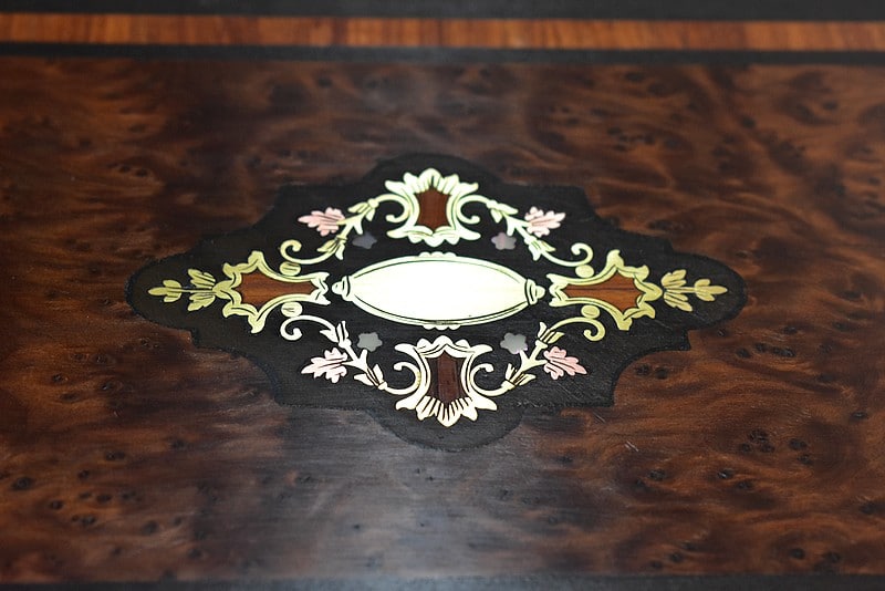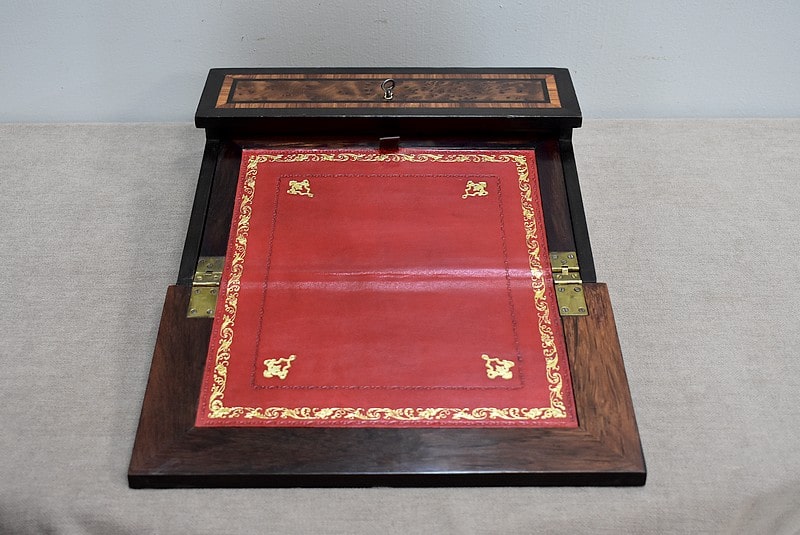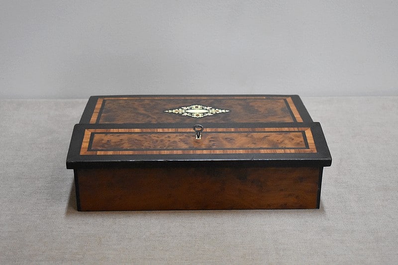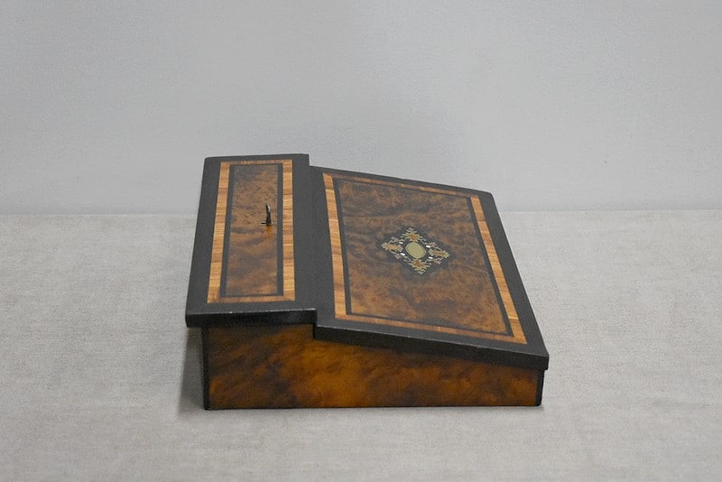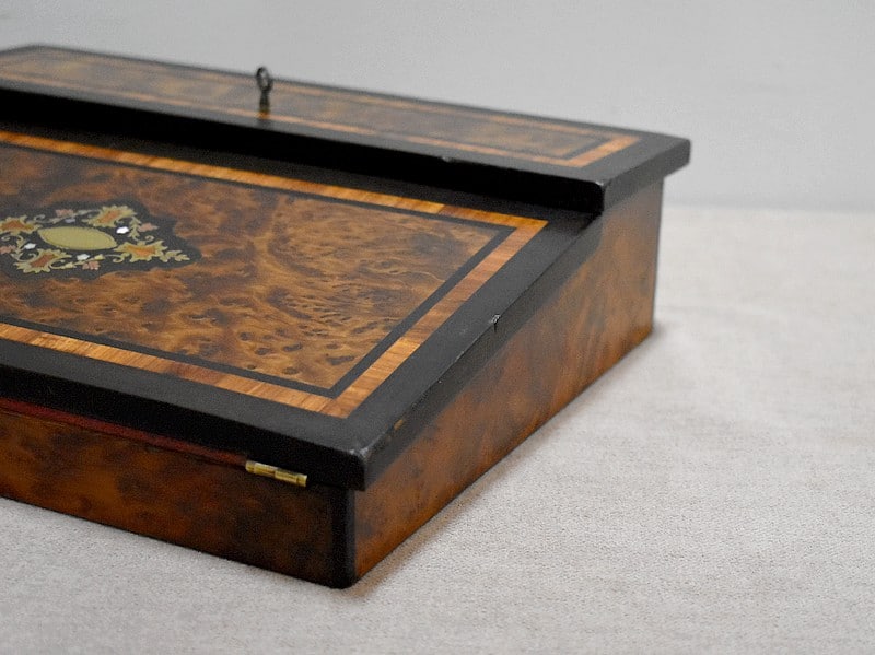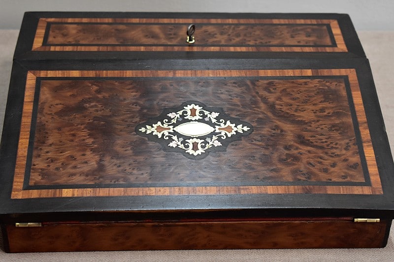 Coffret écritoire de correspondance Napoléon III en Placage de Palissandre décoré d’une marquèterie en loupe de Thuya et bois de Rose, incrusté de Nacre et de Laiton.