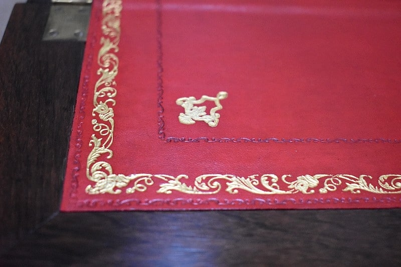 Le petit abattant ouvert permet à l’abattant du dessous, plus grand, de s’ouvrir sur un dessus en cuir rouge refait, orné d’une frise et de motifs aux coins, dorés. La partie haute dotée d’une languette fait également office d’abattant se repliant vers soi pour découvrir un compartiment à papier.