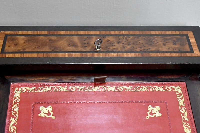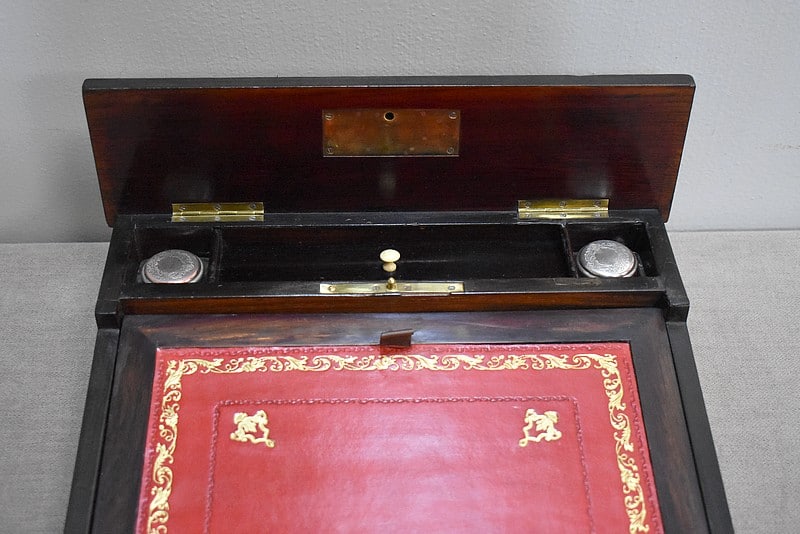 Il ouvre par un petit abattant en partie haute, fermant à clef. Celui-ci s’ouvre sur 2 compartiments latéraux contenant chacun 1 encrier en cristal avec bouchon en métal argenté gravé. Entre les encriers, se trouve un plumier fermant par un couvercle à bouton posé dessus.